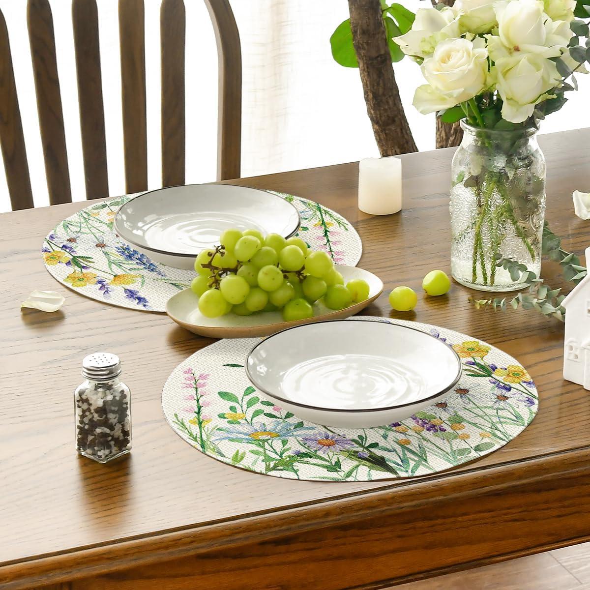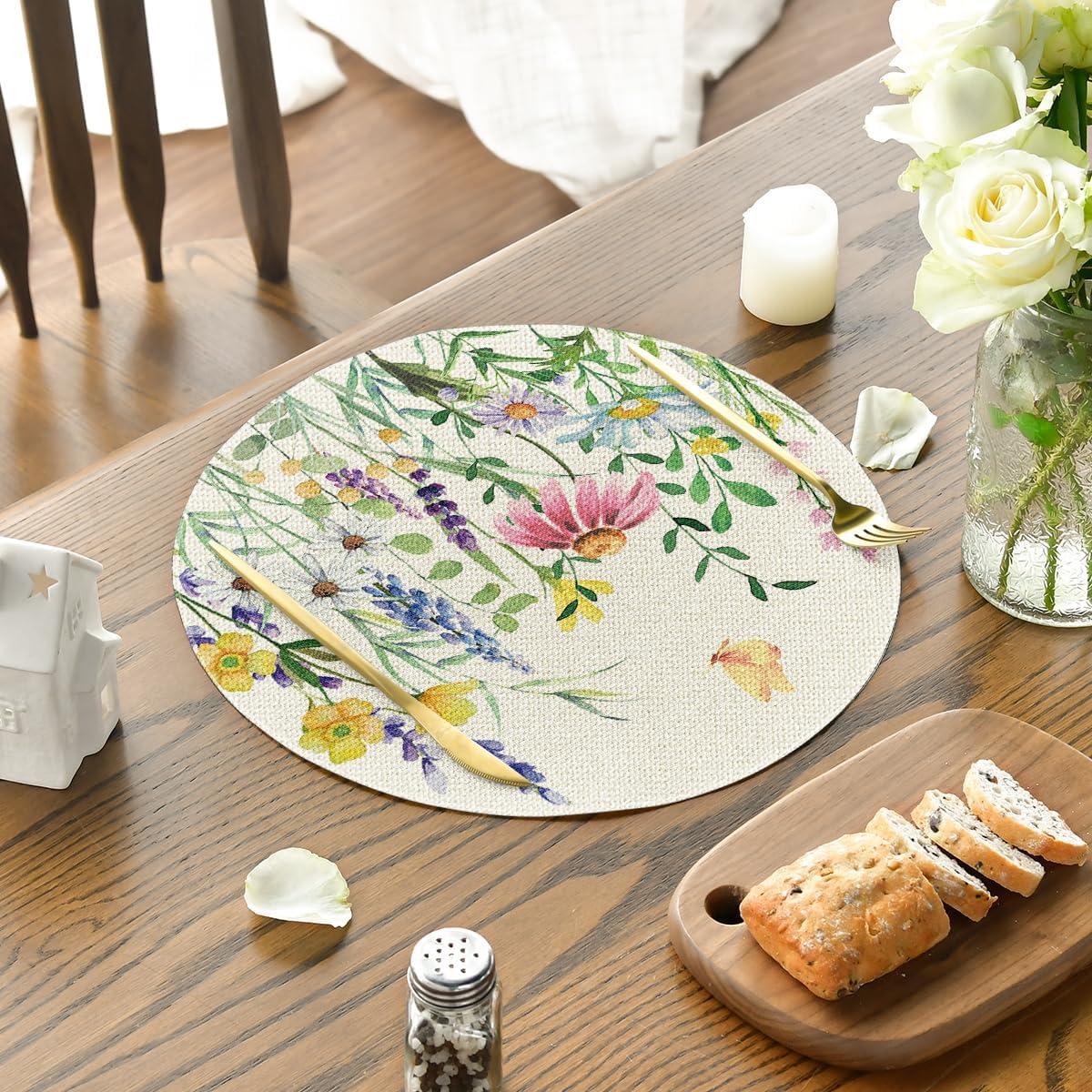 Artoid Mode Daisy Eucalyptus Lavender Floral Leaves Spring Placemats Set of 4,12×18 Inch Seasonal Table Mats for Party Kitchen Dining Decoration(Beige)
