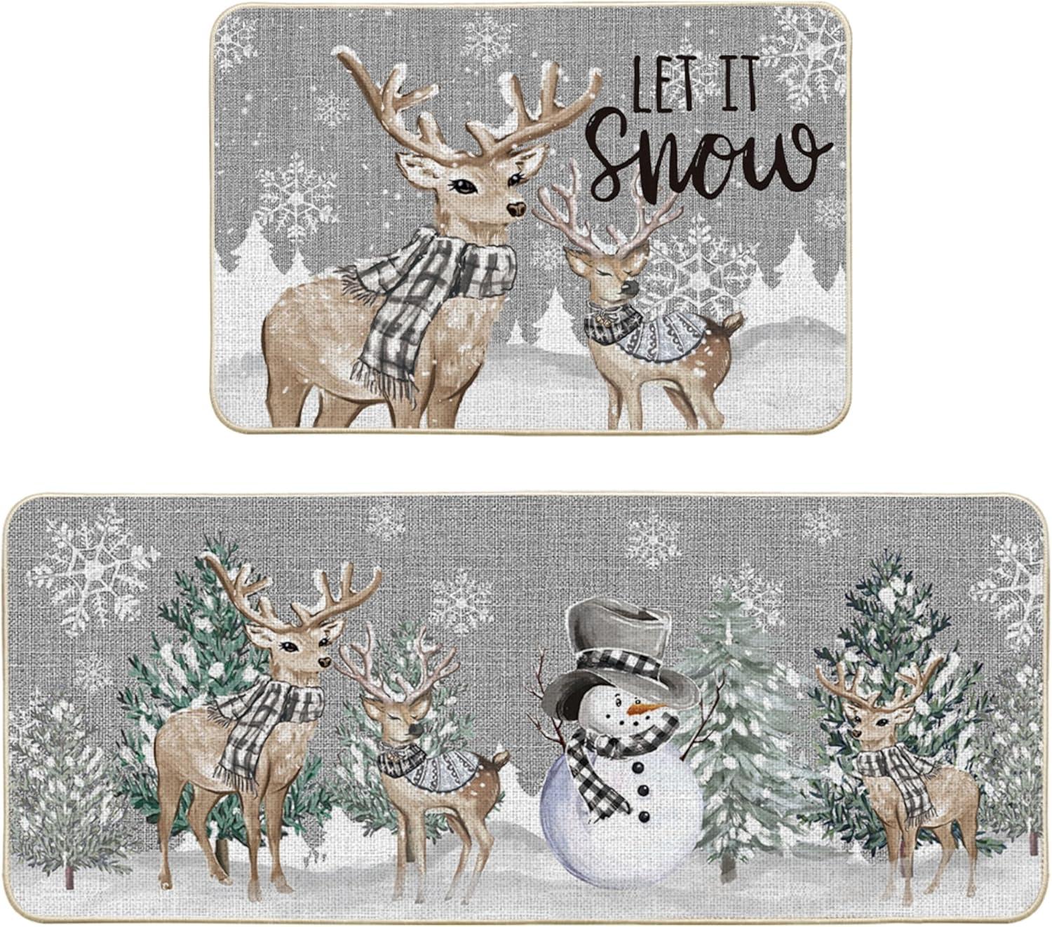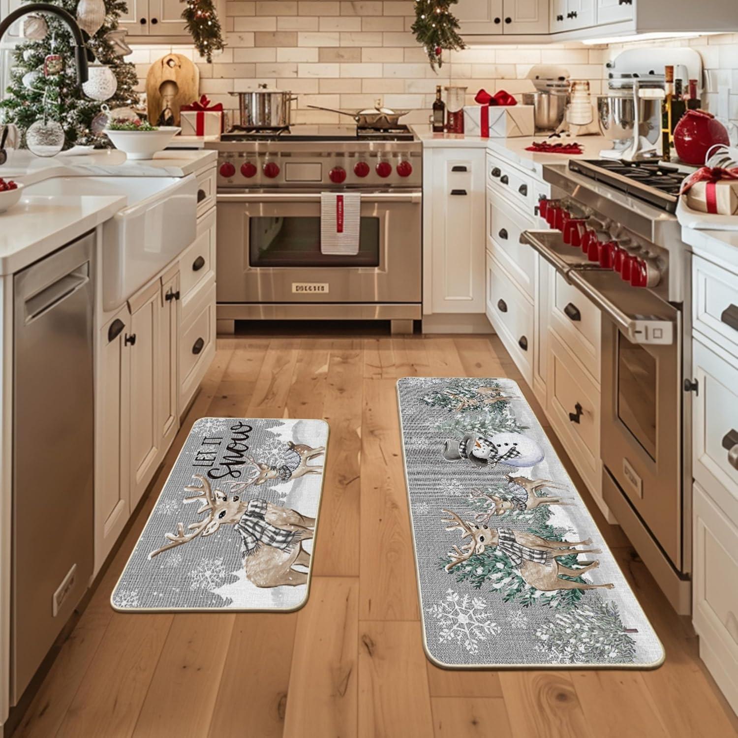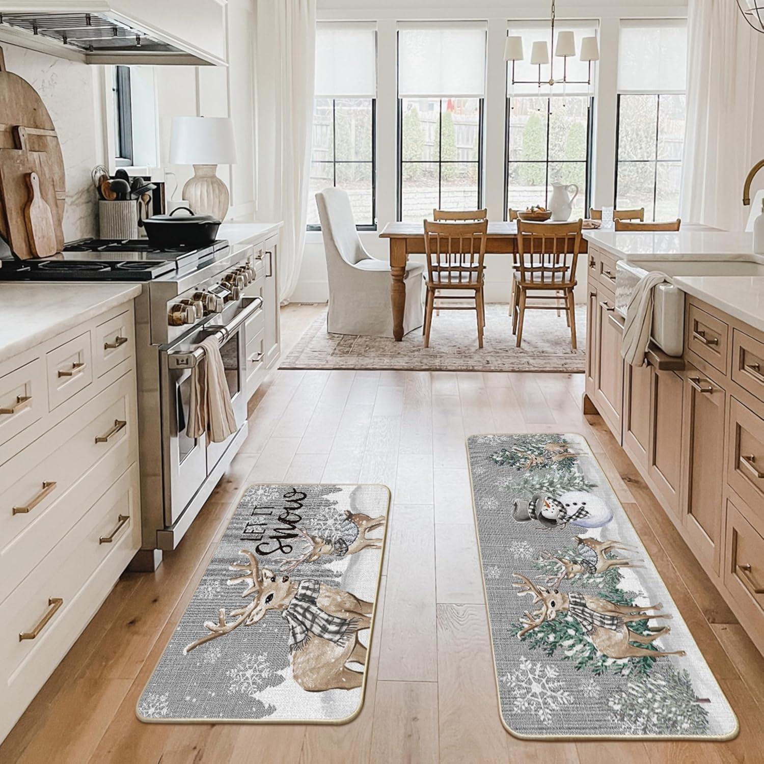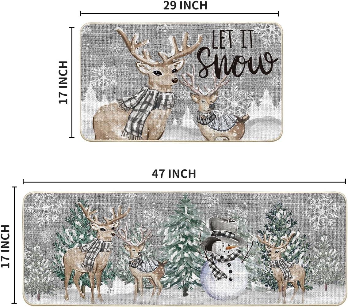 Artoid Mode Deer Tree Let It Sonw Snowflakes Christmas Kitchen Mats Set of 2, Winter Decor Low-Profile Kitchen Rugs for Floor – 17×29 and 17×47 Inch(Silver)