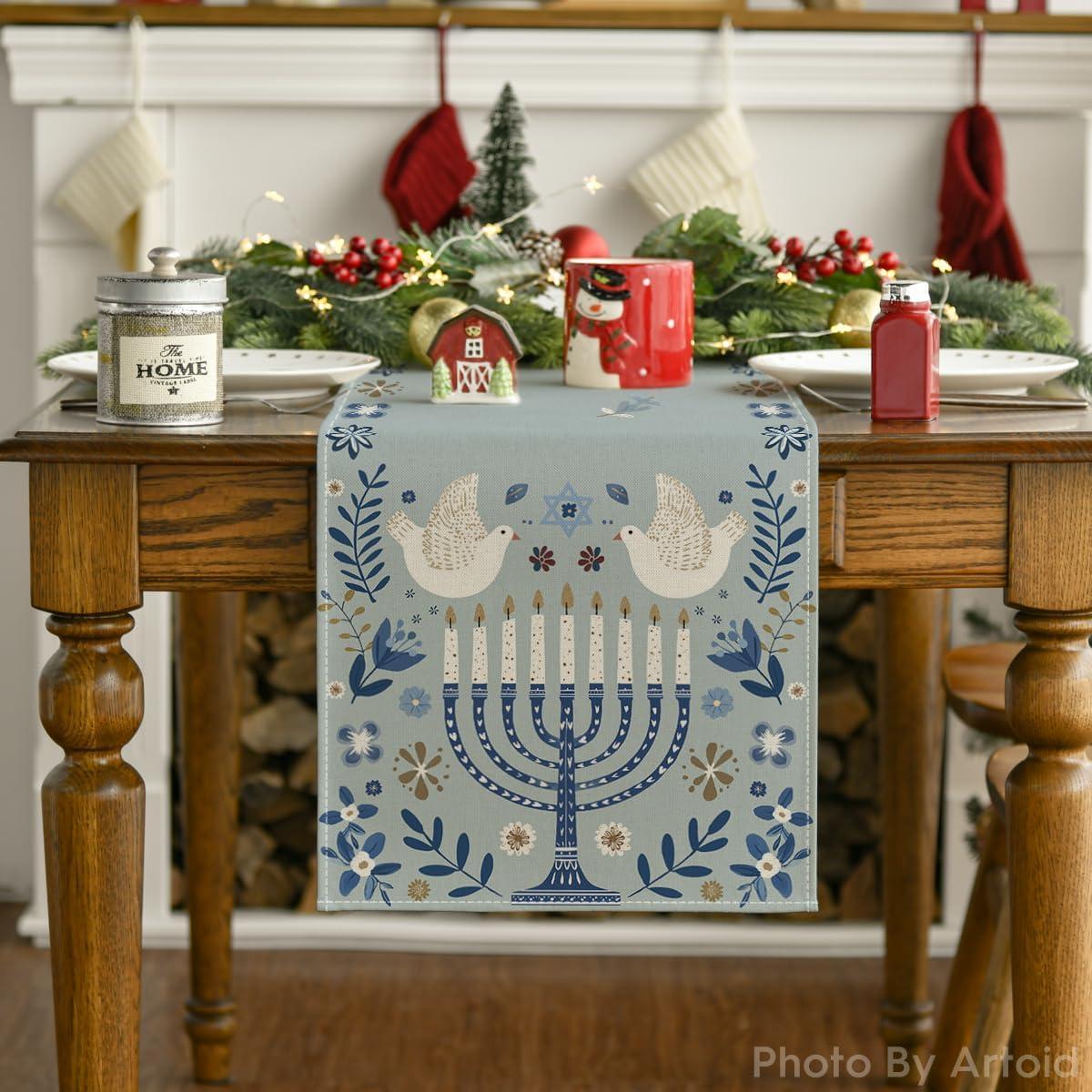 Artoid Mode Doves Candle Olives Menorah Hanukkah Table Runner, Chanukah Kitchen Dining Table Decoration for Home Party Decor 13×72 Inch