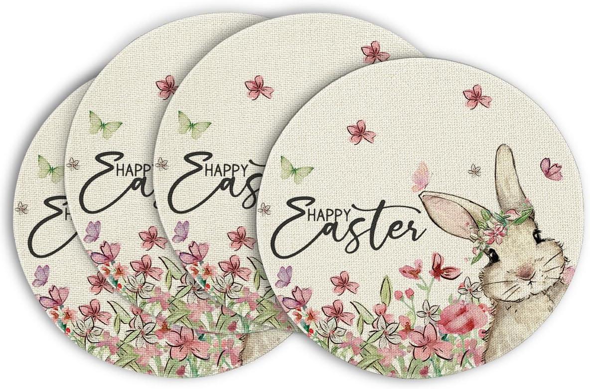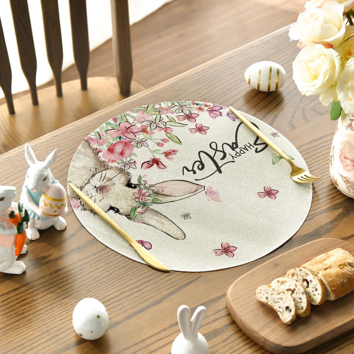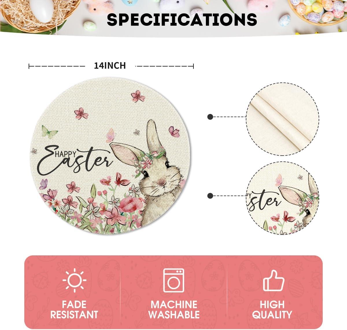 Artoid Mode Easter Round Placemats Set of 4, 14 Inch Bunnys Flowers Spring Farmhouse Round Table Mats for Easter Party Dining Decoration(Beige)