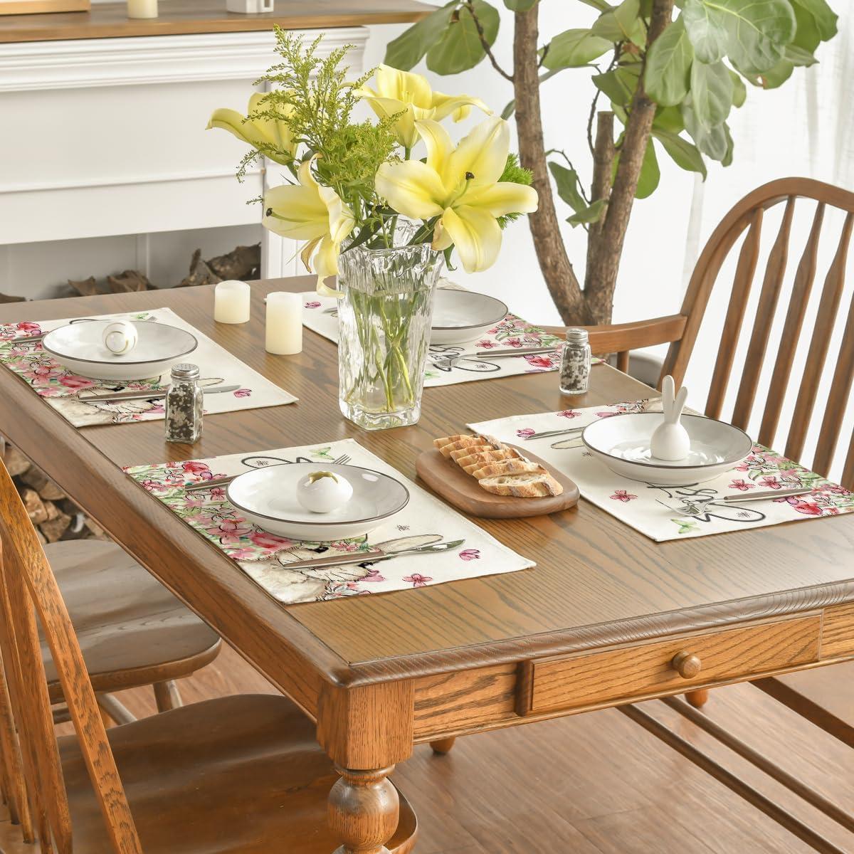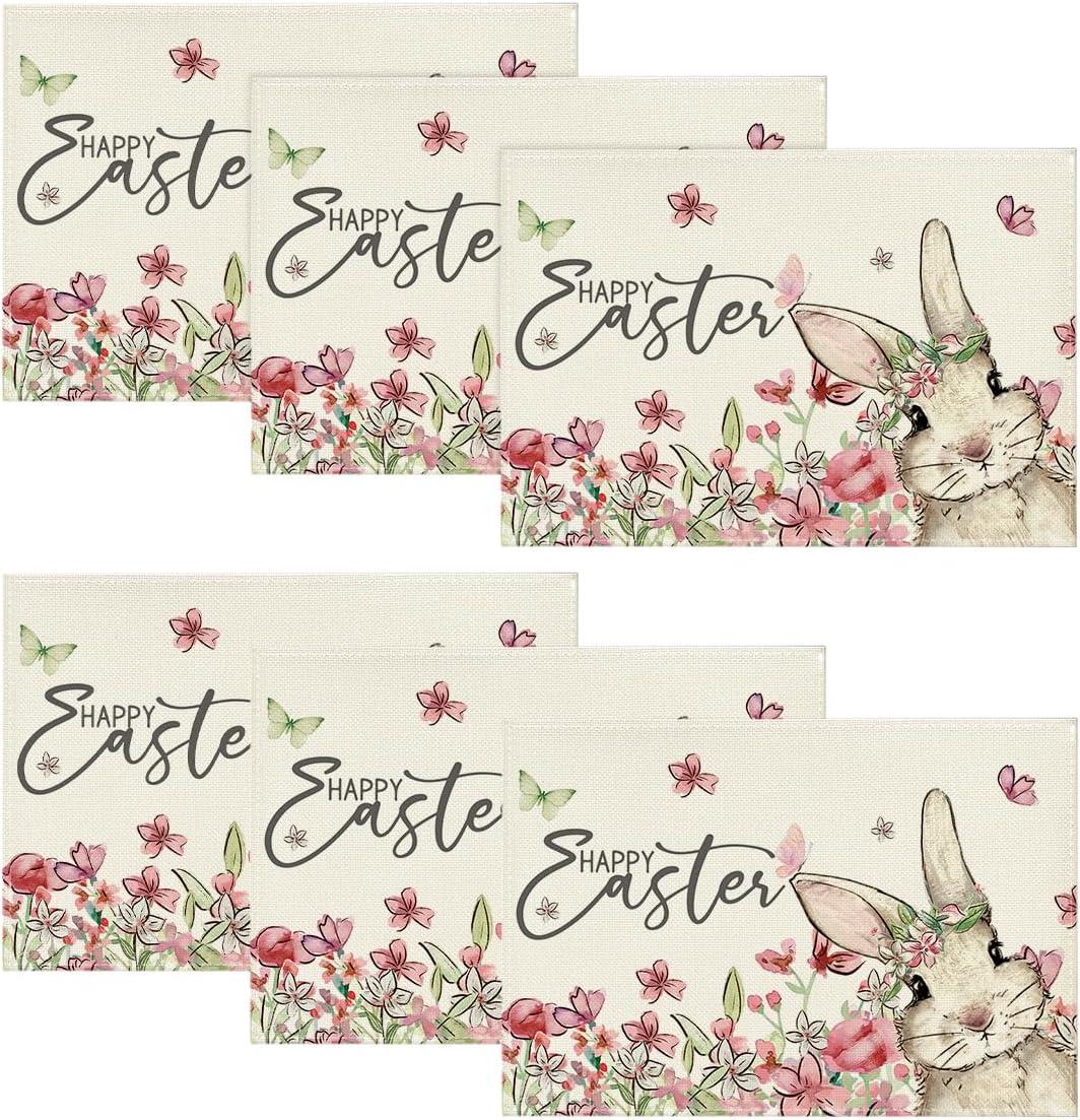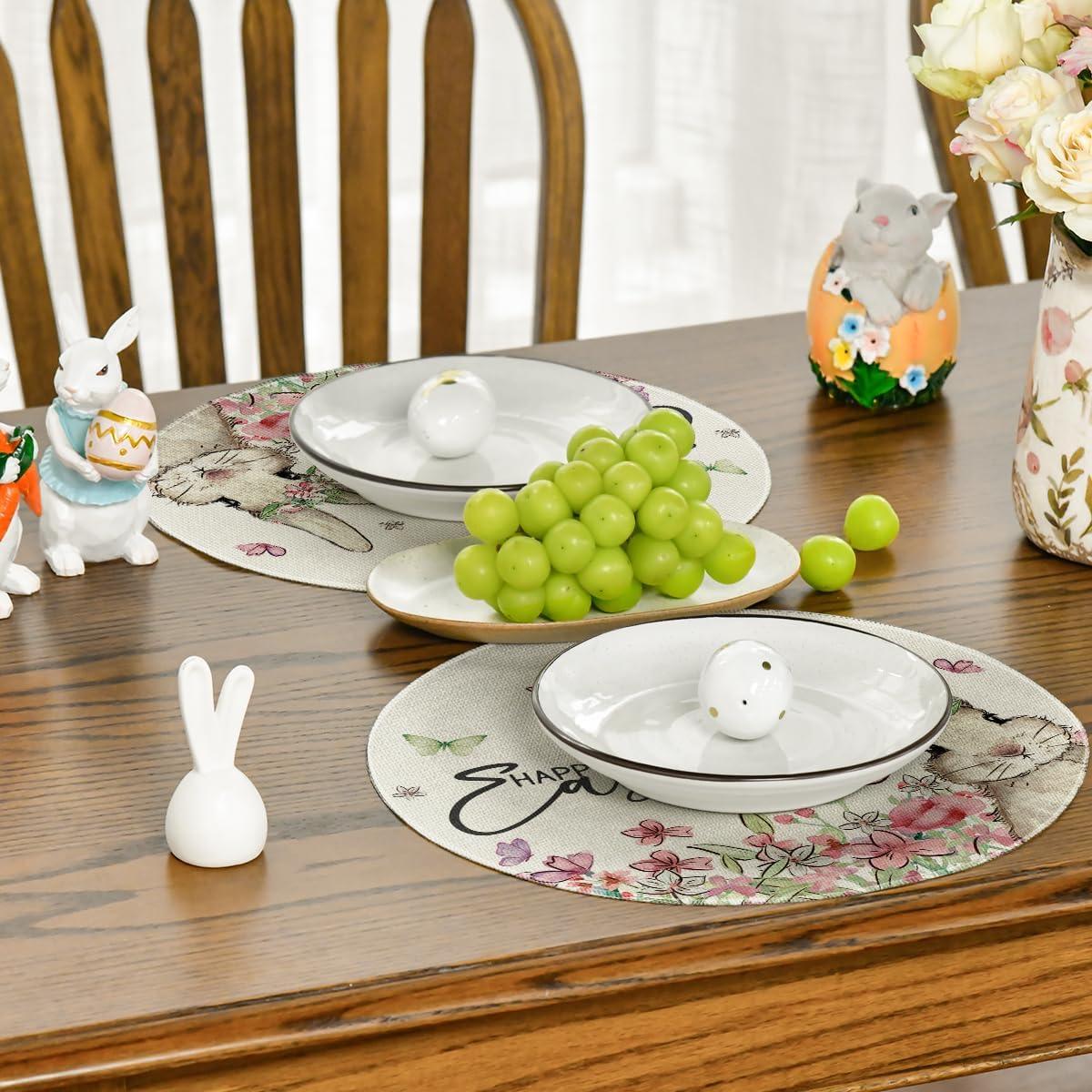 Artoid Mode Easter Round Placemats Set of 4, 14 Inch Bunnys Flowers Spring Farmhouse Round Table Mats for Easter Party Dining Decoration(Beige)