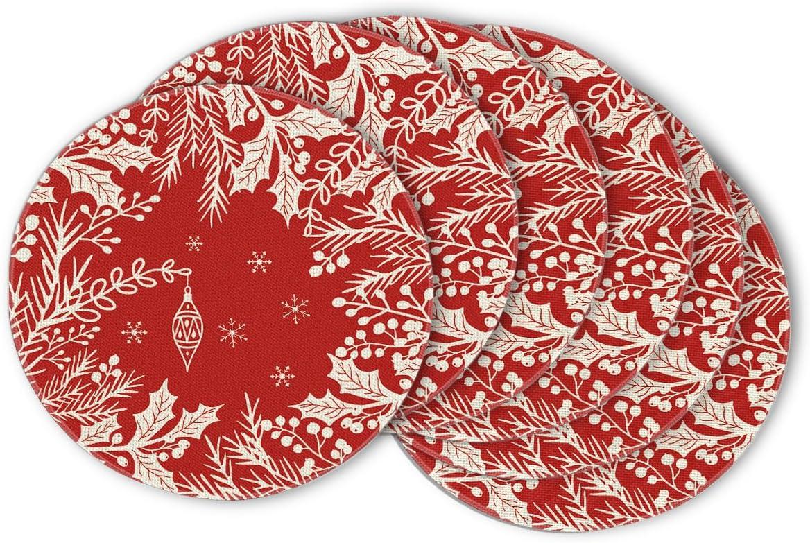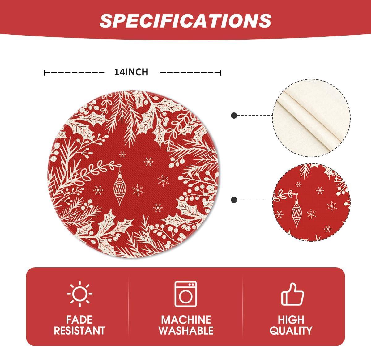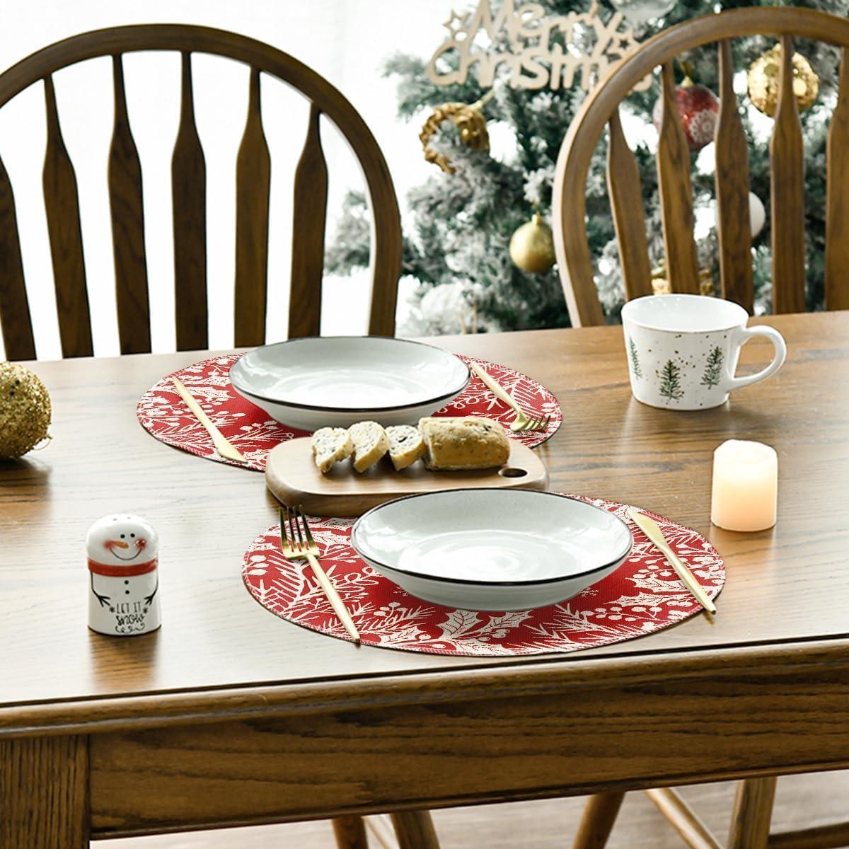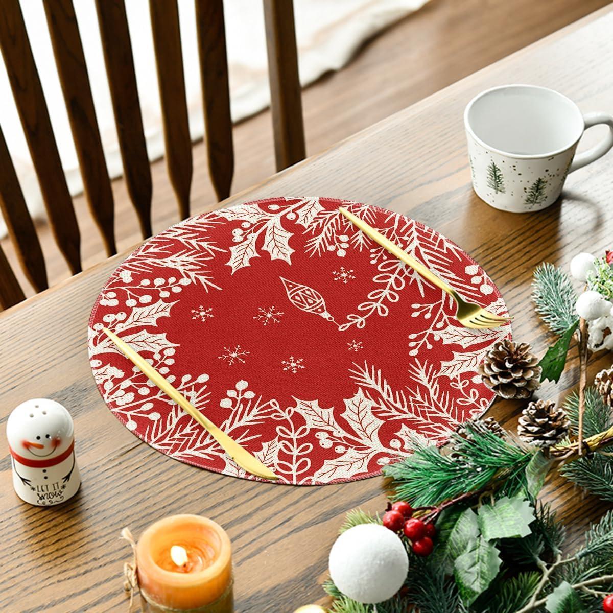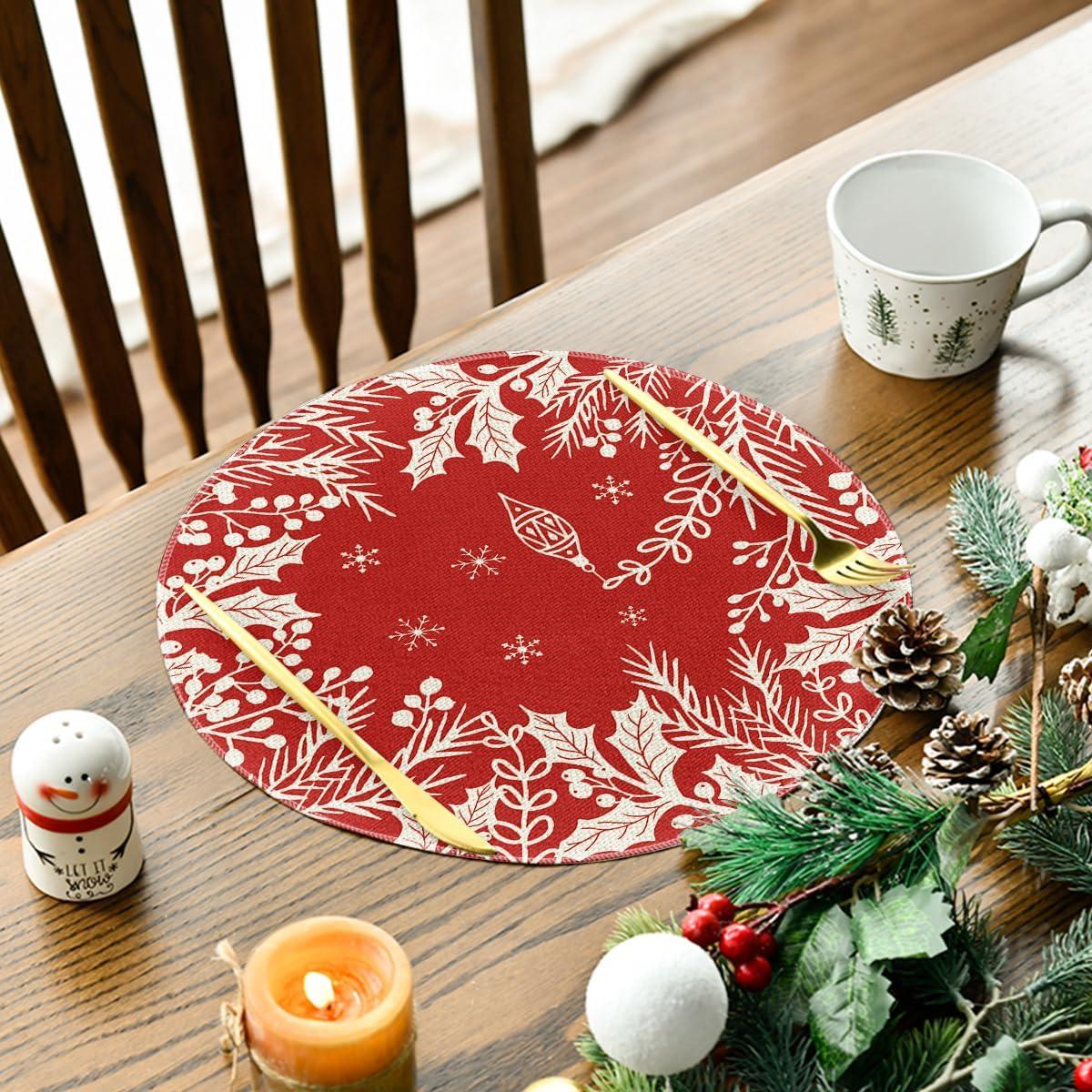 Artoid Mode Eucalyptus Leaves Berry Christmas Placemats Set of 4, 15 Inch Seasonal Winter Xmas Round Table Mats for Dining Decoration(Red)