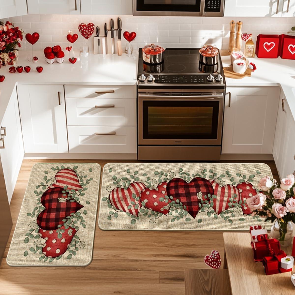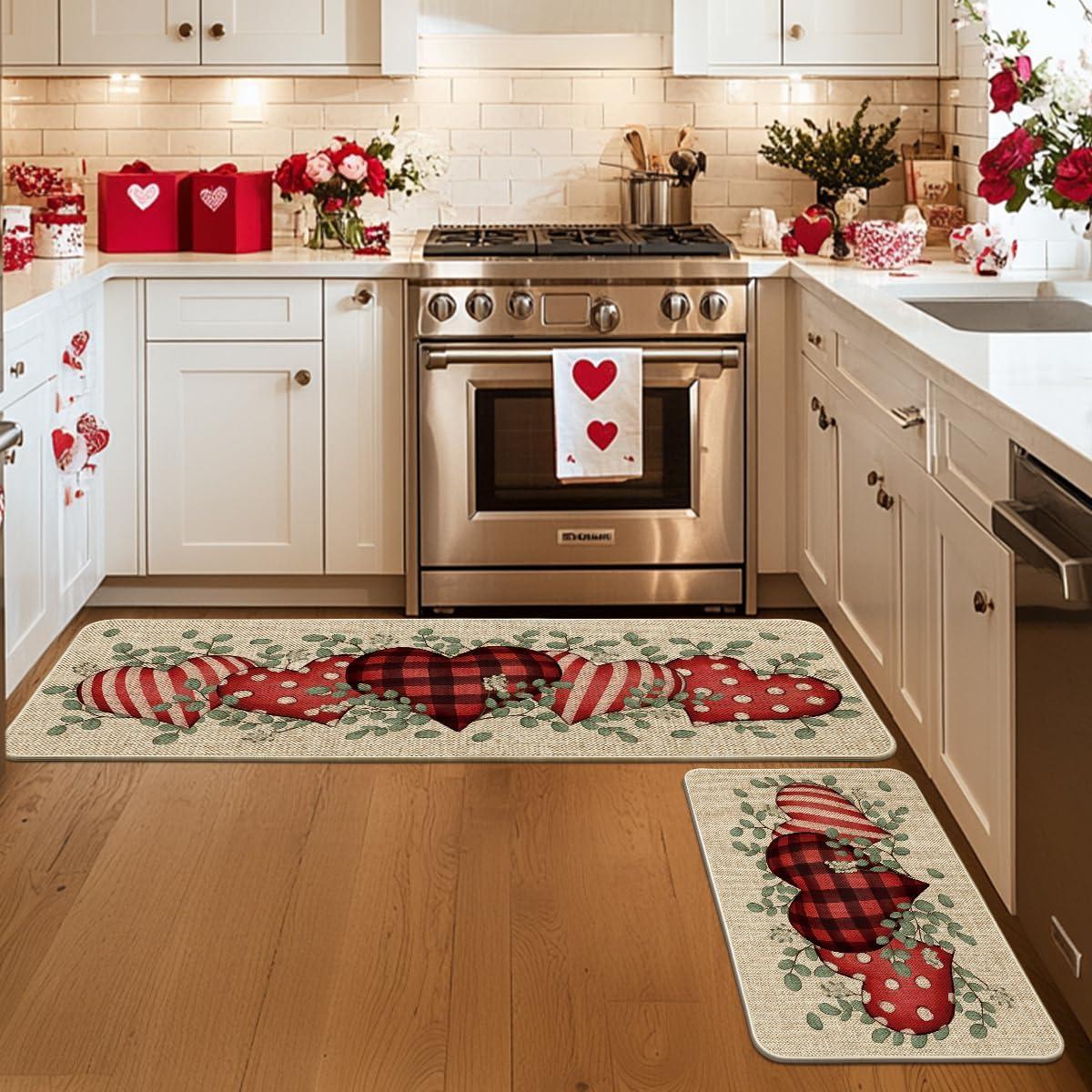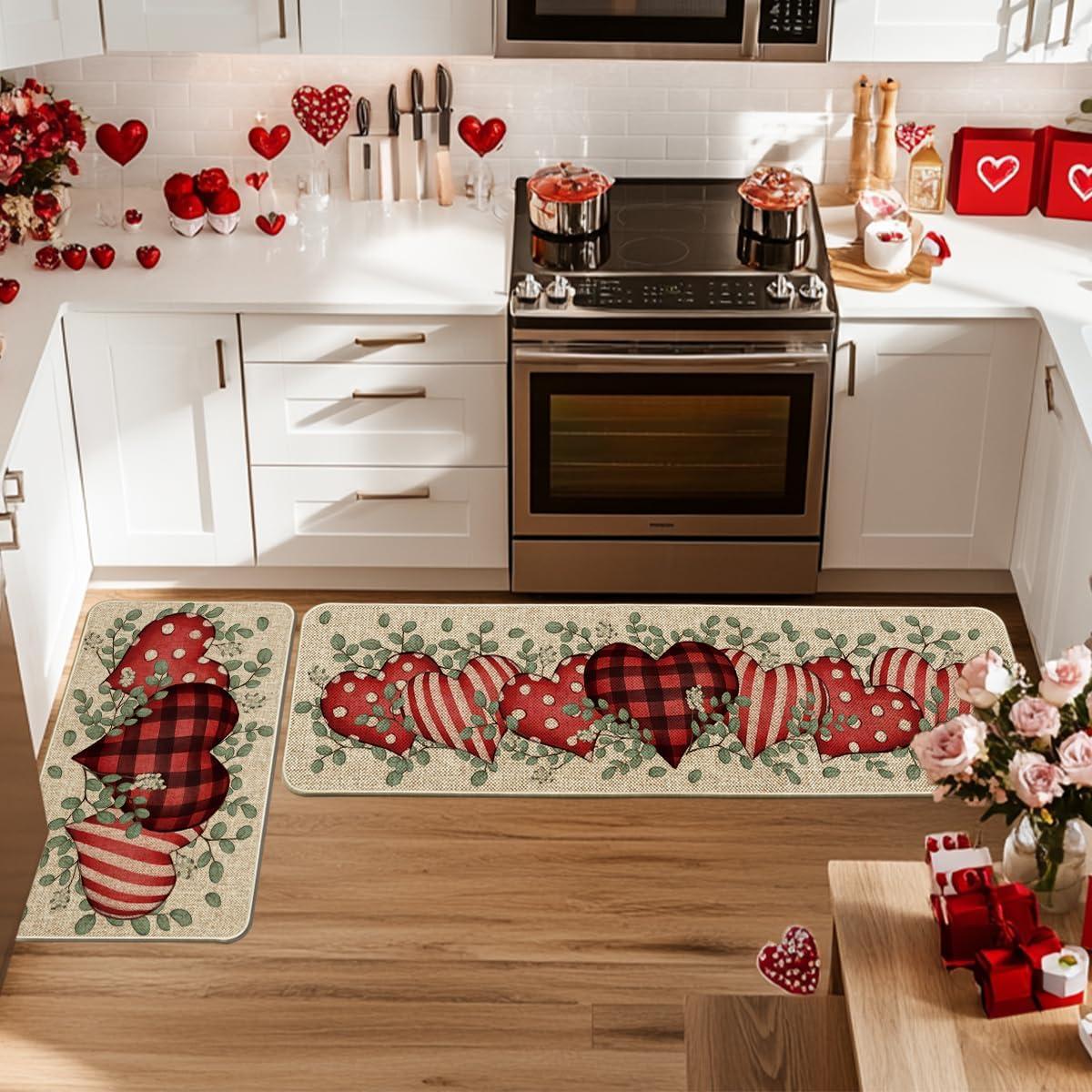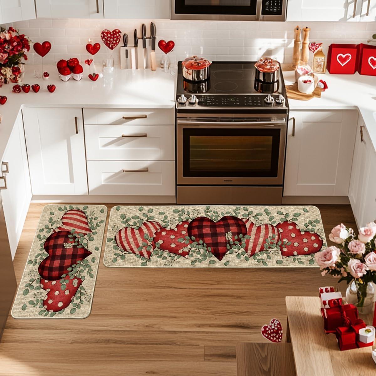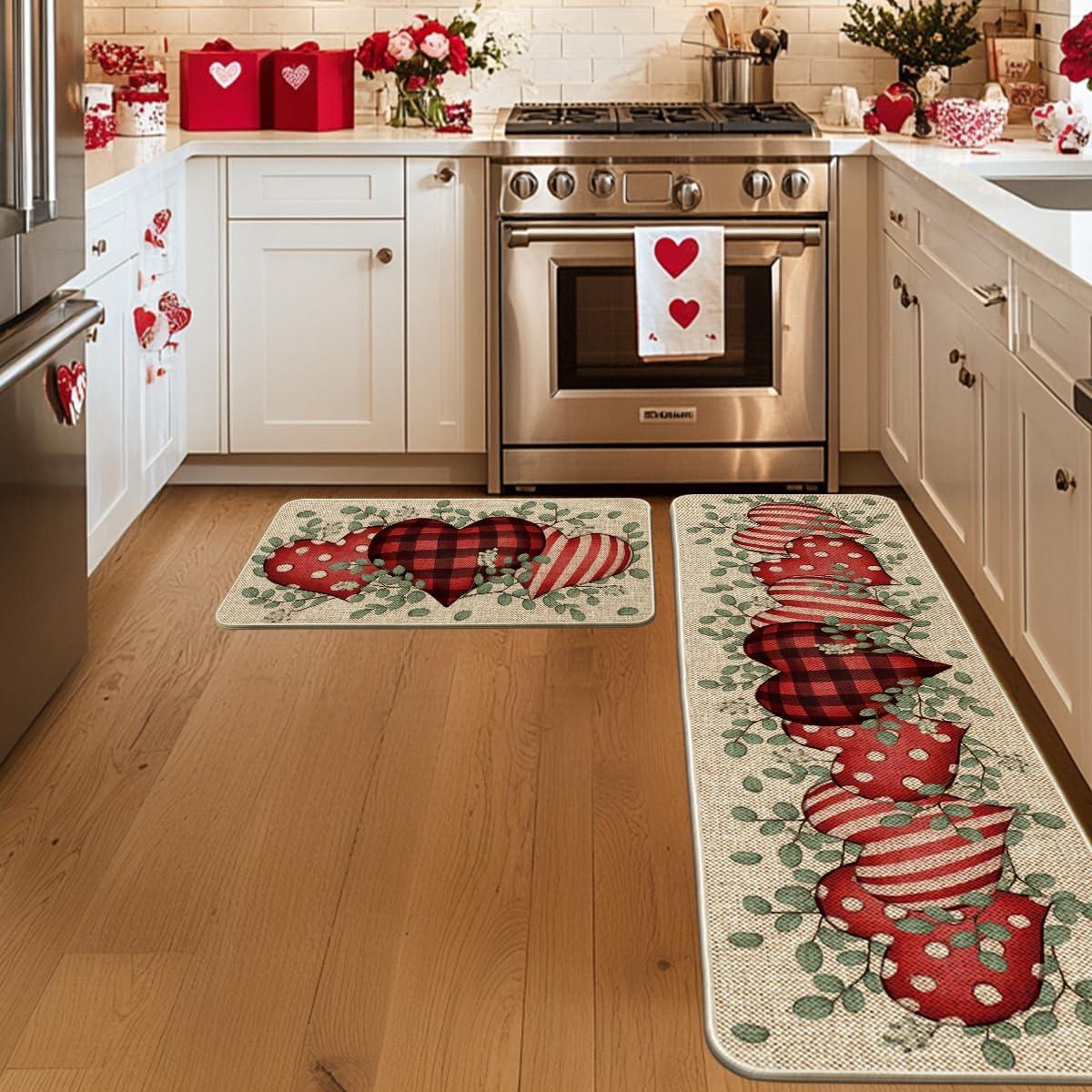 Artoid Mode Eucalyptus Love Heart Valentine’s Decorative Kitchen Mats Set of 2, Home Party Low-Profile Home Kitchen Rugs – 17×29 and 17×47 Inch(Beige)