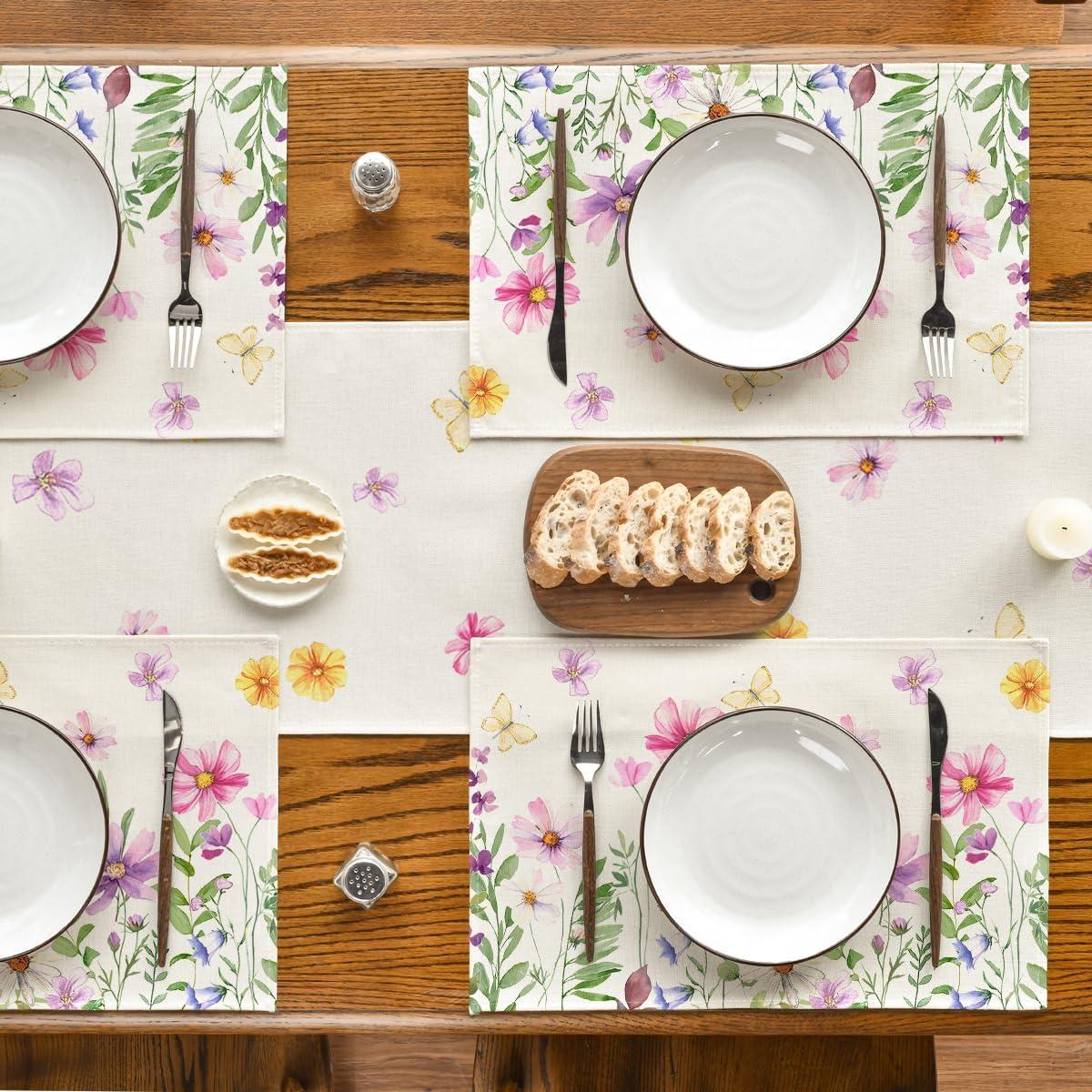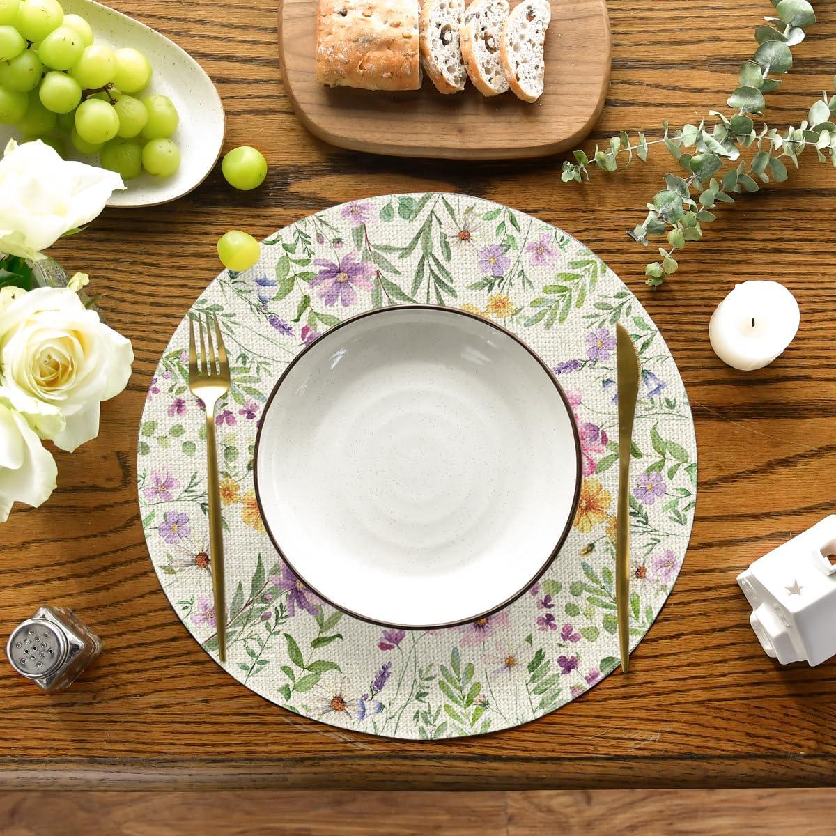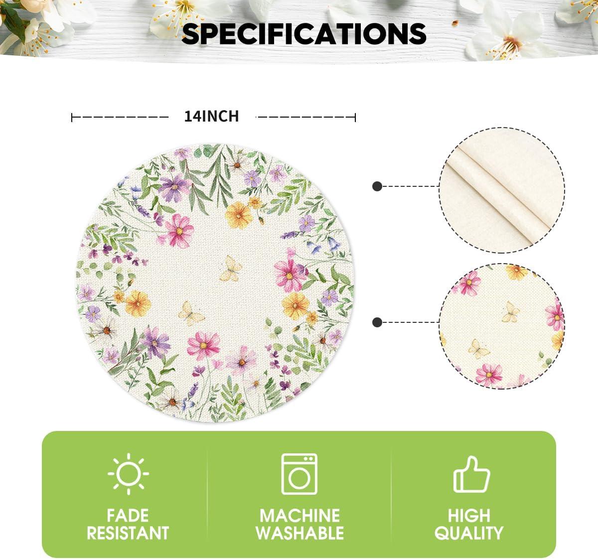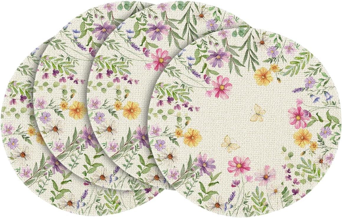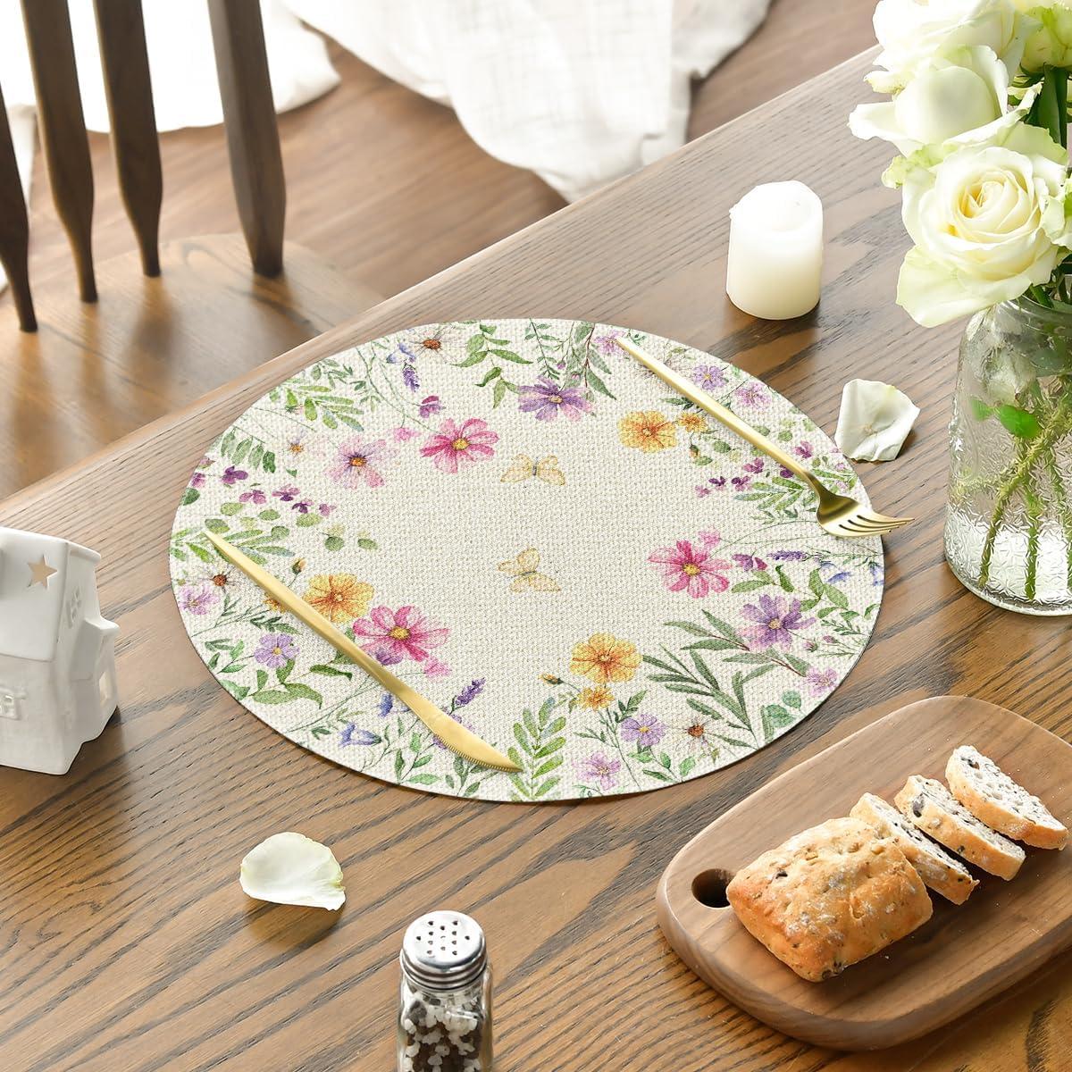 Artoid Mode Floral Butterfly Summer Round Placemats Set of 4, 14 Inch Seasonal Spring Placemats for Party Kitchen Dining Summer Decoration(Beige)