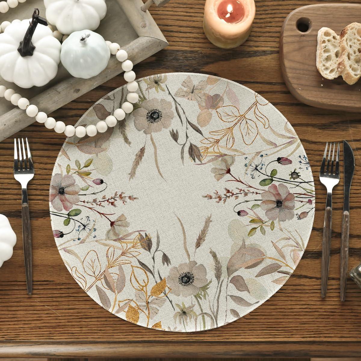Artoid Mode Floral Fall Round Placemats Set of 4,14 Inch Seasonal Round Place Mats for Party Dining Decoration(Beige)