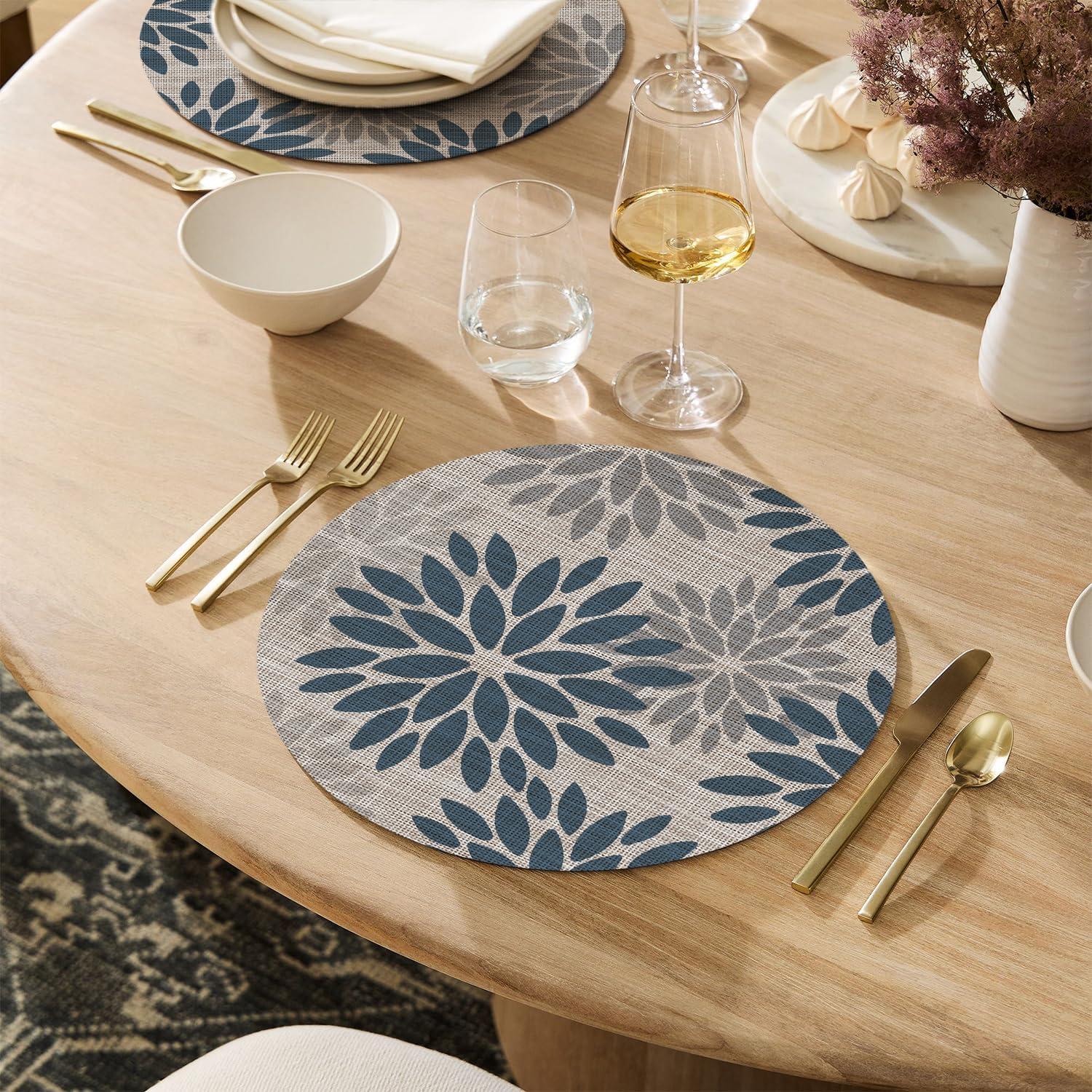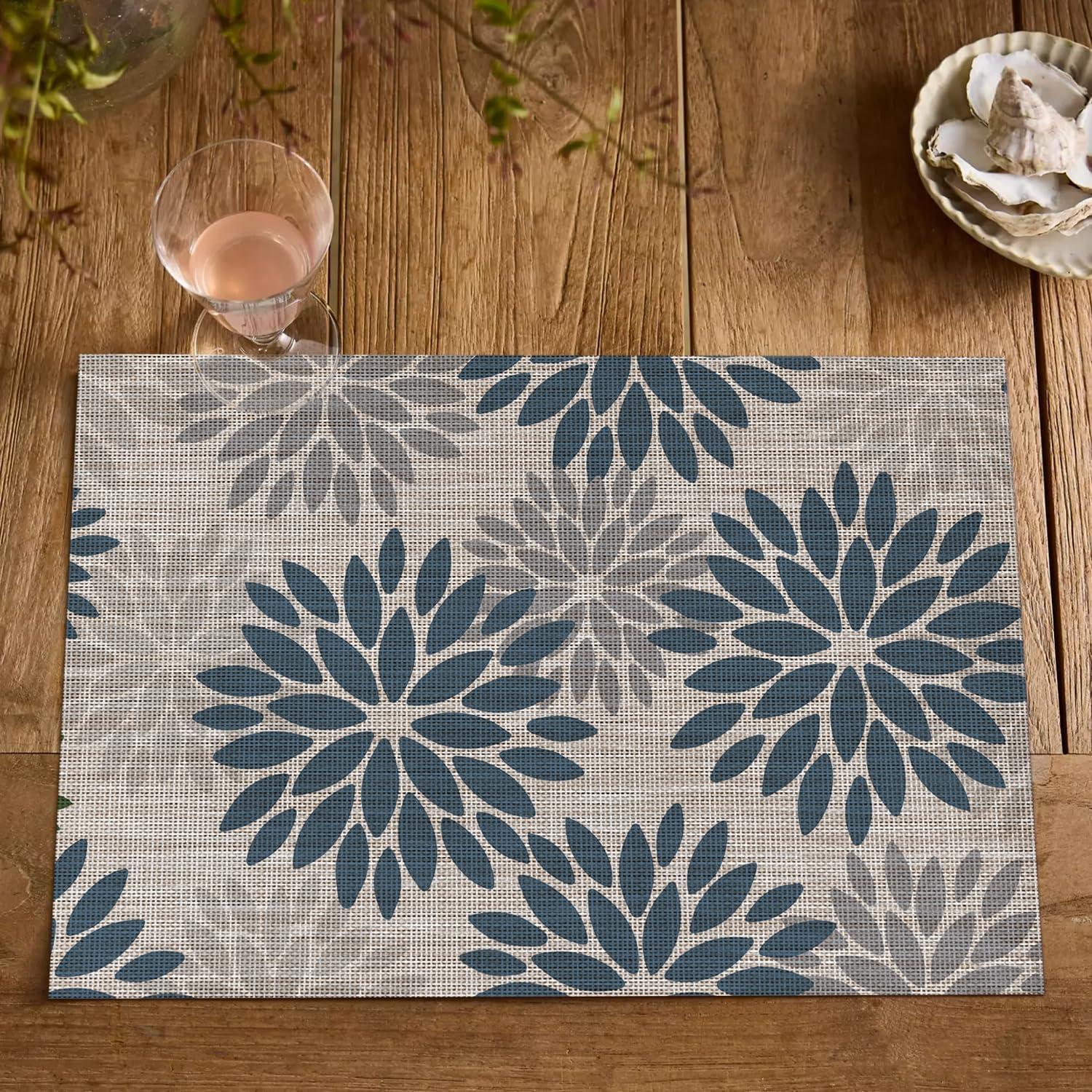 Artoid Mode Floral Vinyl Placemats Set of 4, 12×18 Inch Heat Resistant Washable Non-Slip Plistic PVC Place Mats for Party Kitchen Dining Decor, Pink Blue(Blue/Gray)