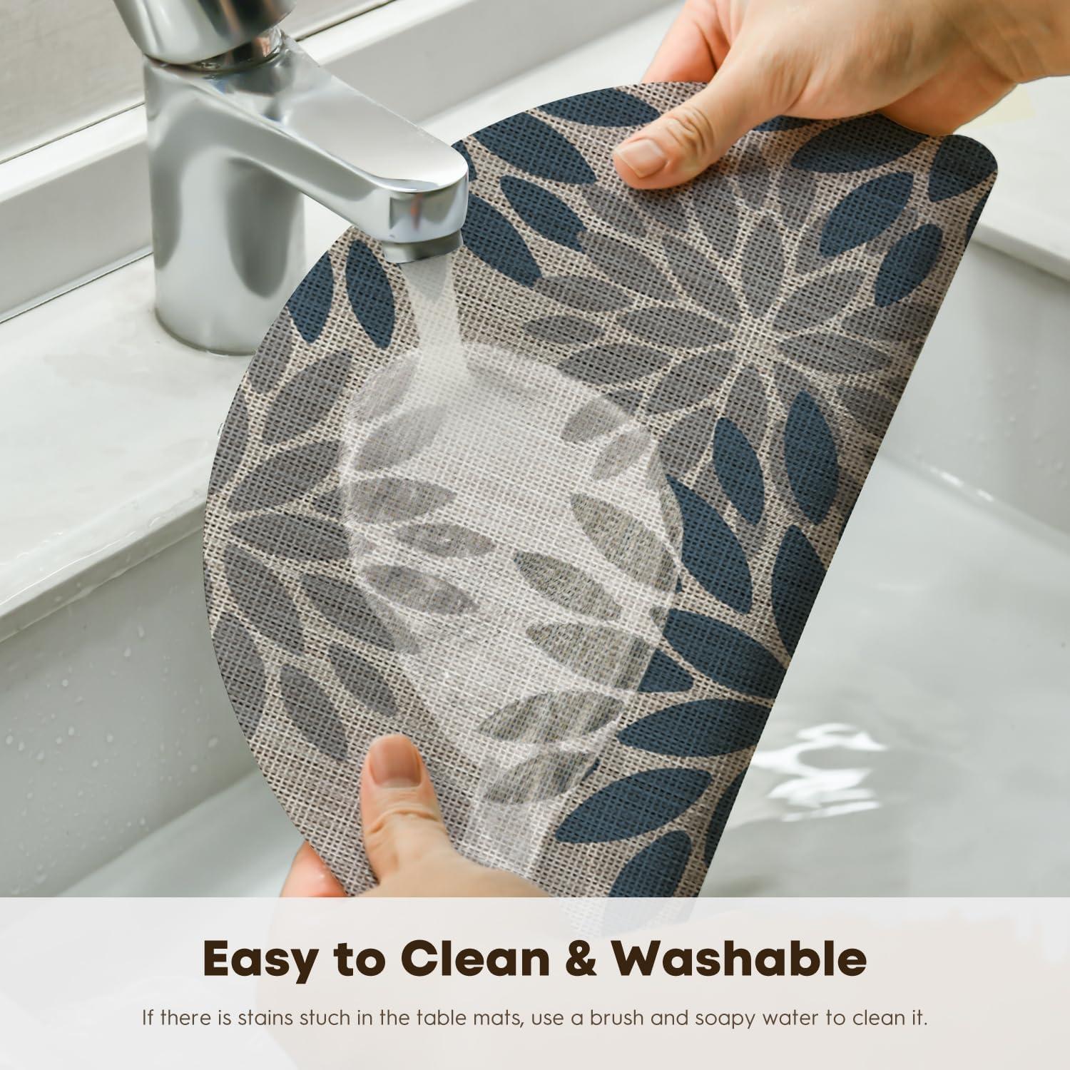Easy To Clean:The washable placemats simply wipe with soap,water and a soft sponge or cloth.Scrub stubborn stains with a soft bristle-brush and a bleach-based cleanse.