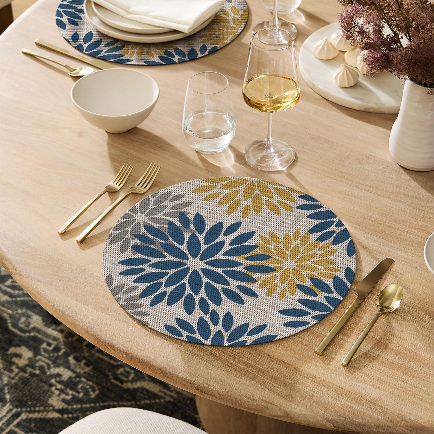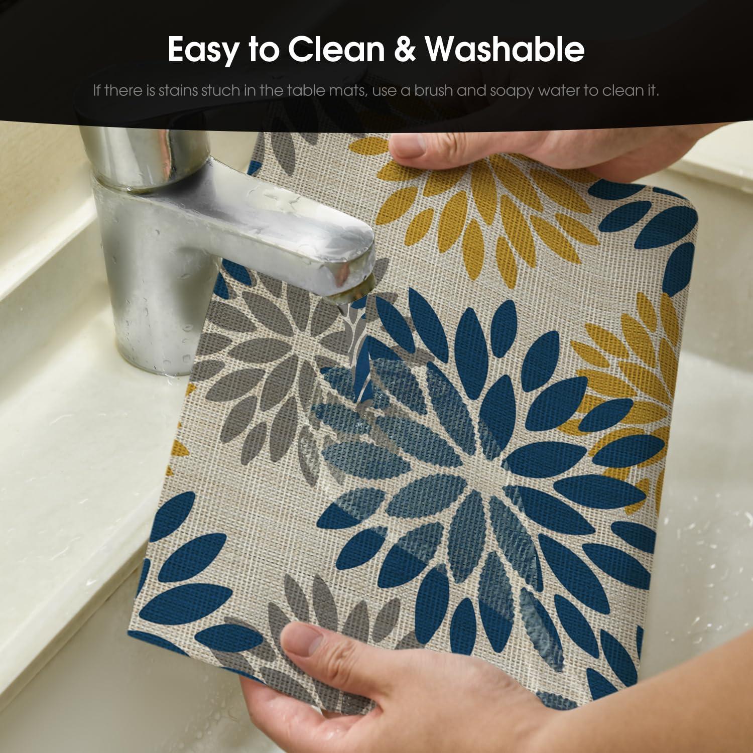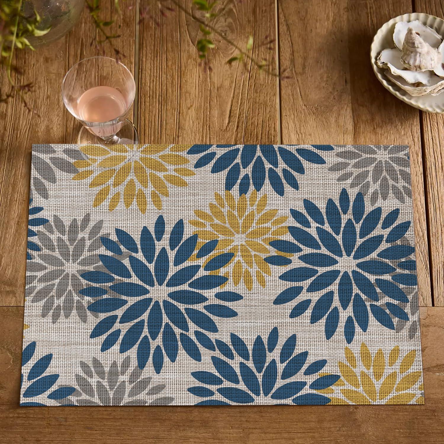 Artoid Mode Floral Vinyl Placemats Set of 4, 12×18 Inch Heat Resistant Washable Non-Slip Plistic PVC Place Mats for Party Kitchen Dining Decor, Pink Blue(Blue/Yellow)