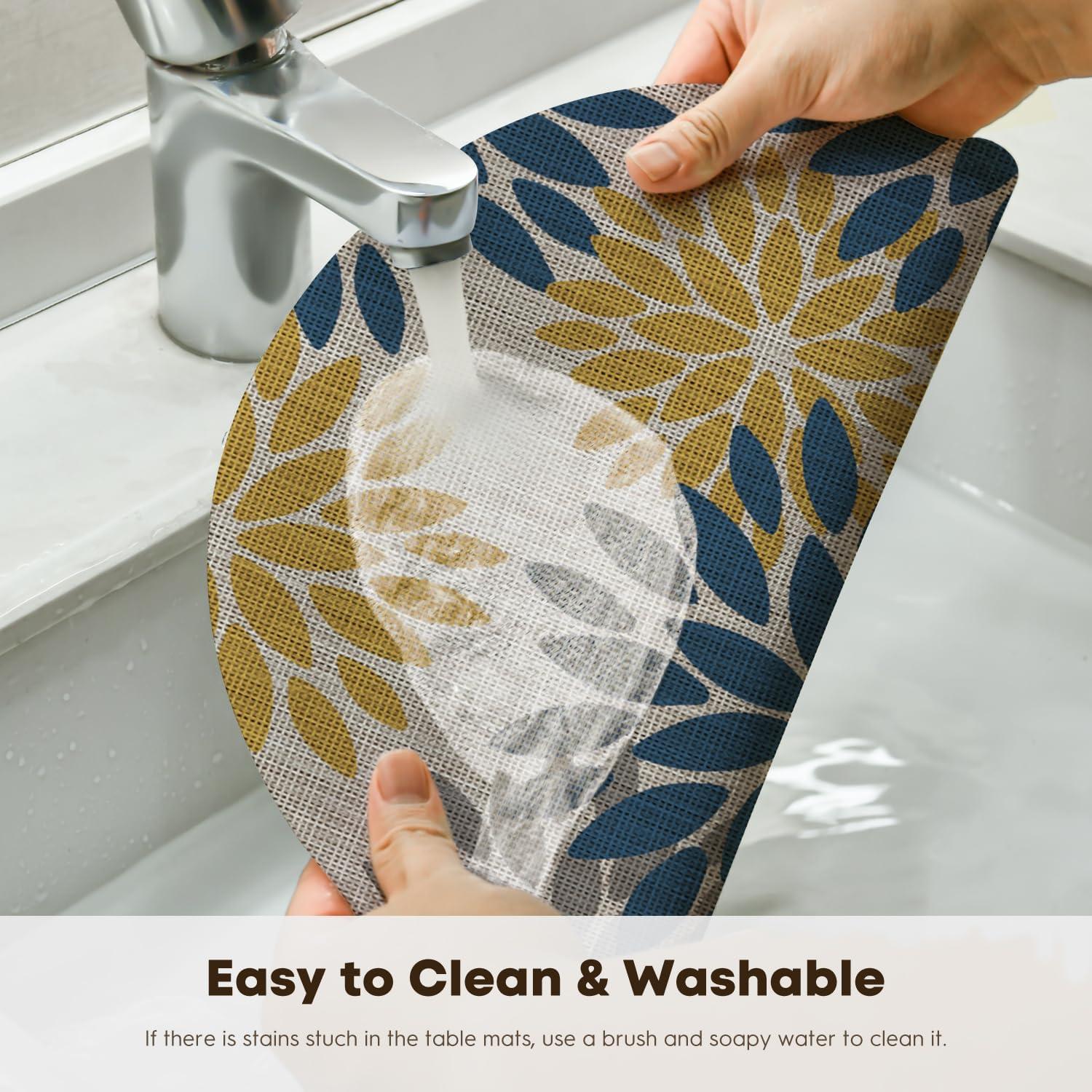 Easy To Clean:The washable placemats simply wipe with soap,water and a soft sponge or cloth.Scrub stubborn stains with a soft bristle-brush and a bleach-based cleanse.