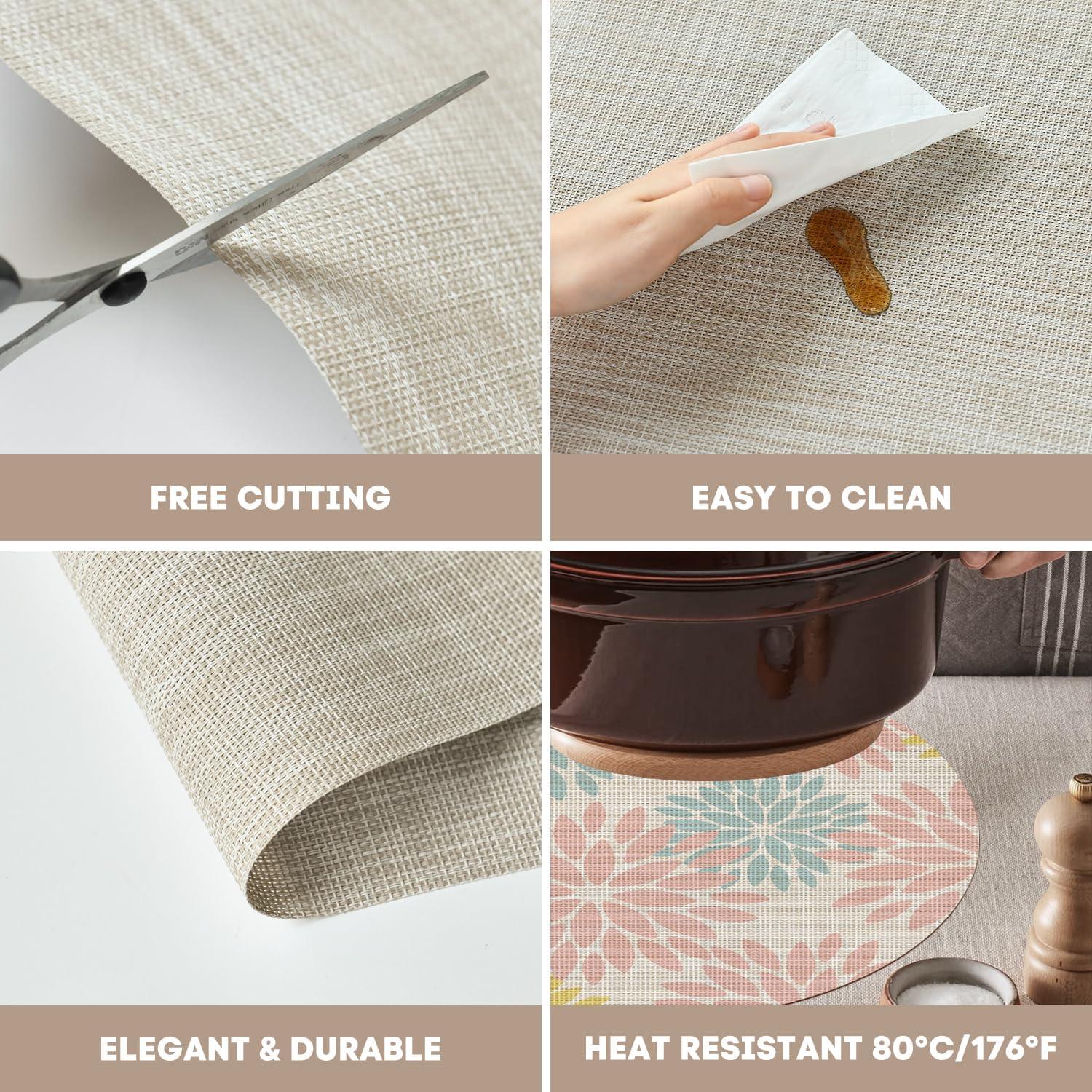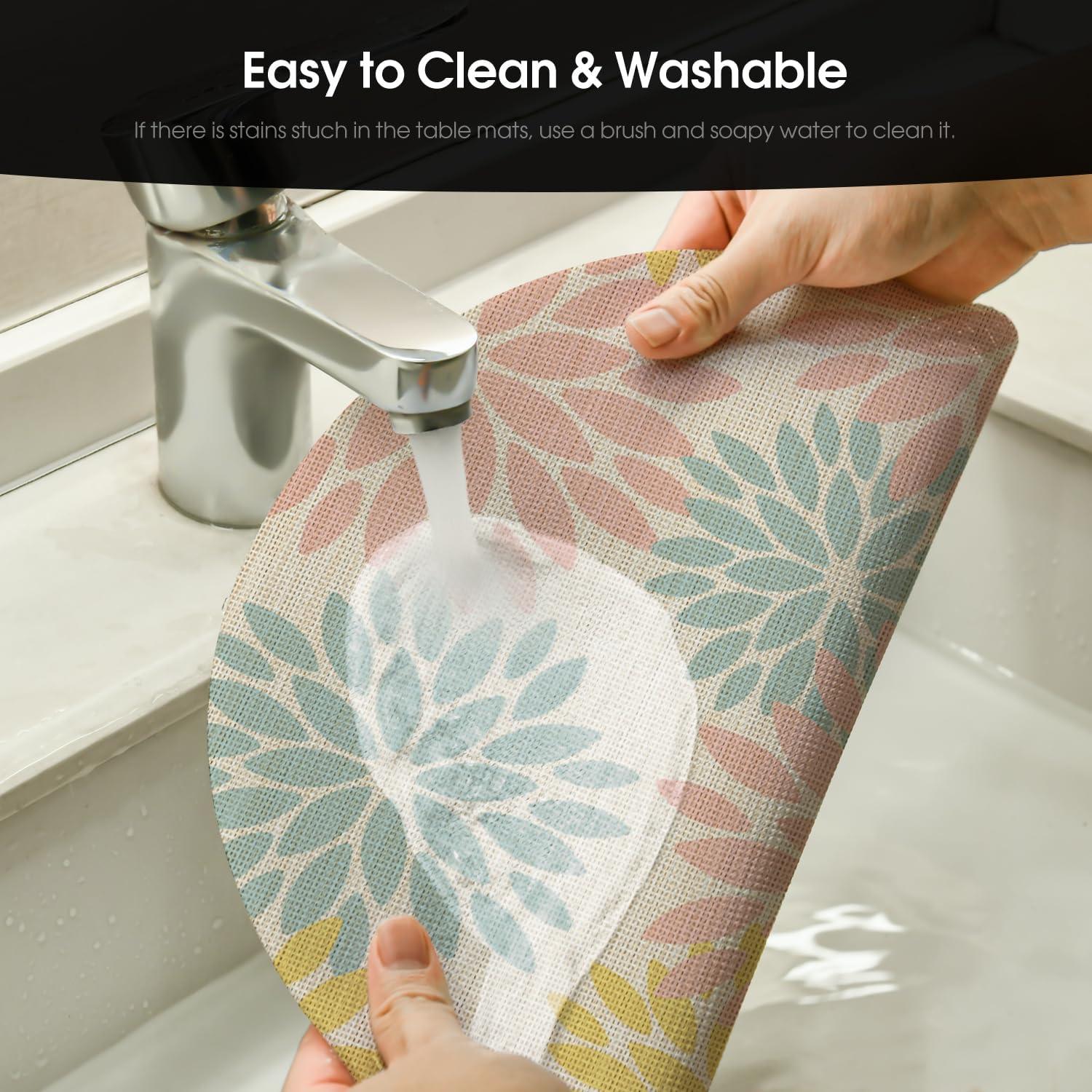 Easy To Clean:The washable placemats simply wipe with soap,water and a soft sponge or cloth.Scrub stubborn stains with a soft bristle-brush and a bleach-based cleanse.