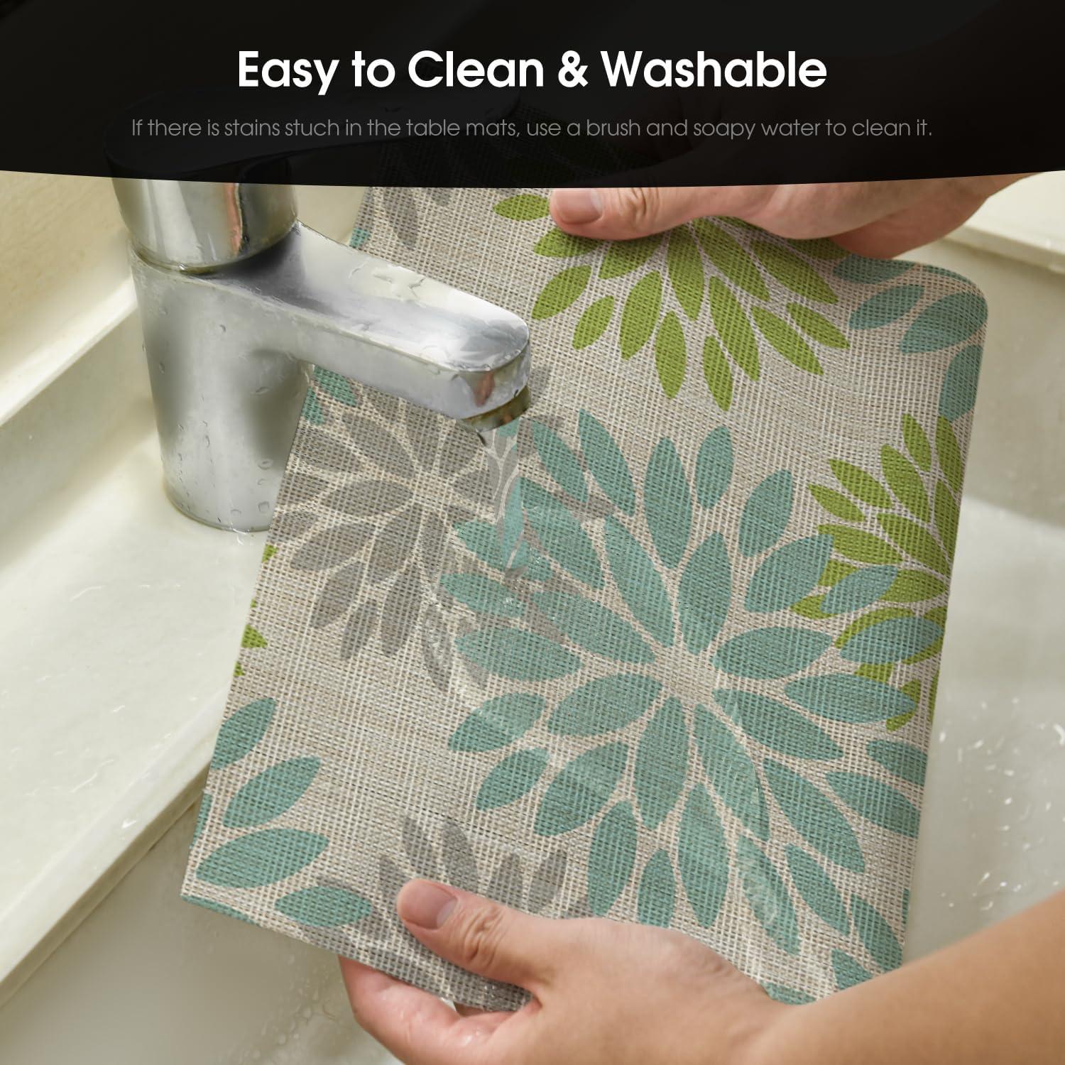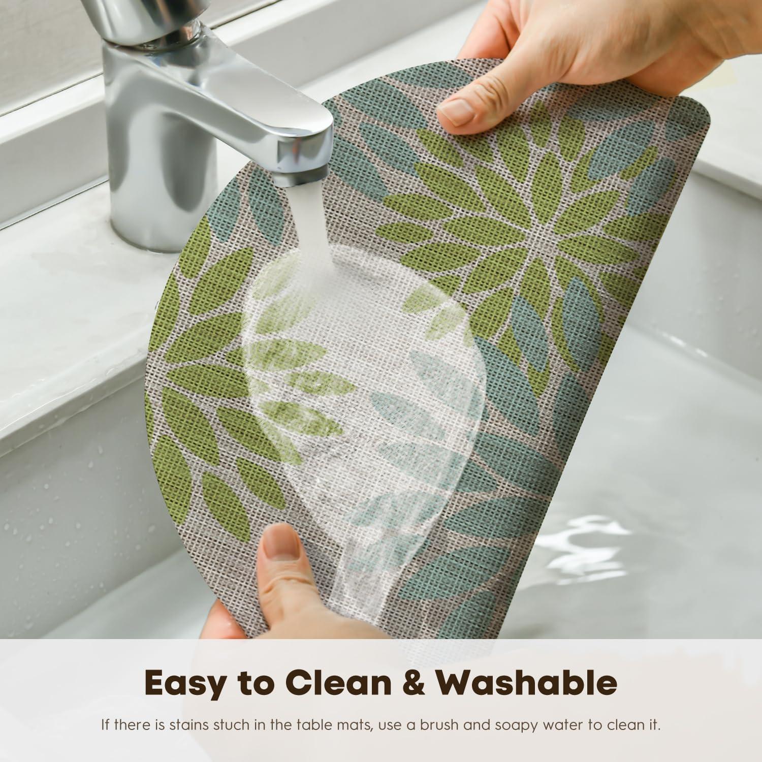 Easy To Clean:The washable placemats simply wipe with soap,water and a soft sponge or cloth.Scrub stubborn stains with a soft bristle-brush and a bleach-based cleanse.