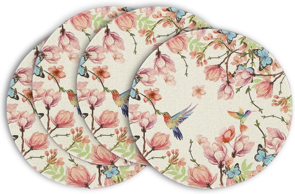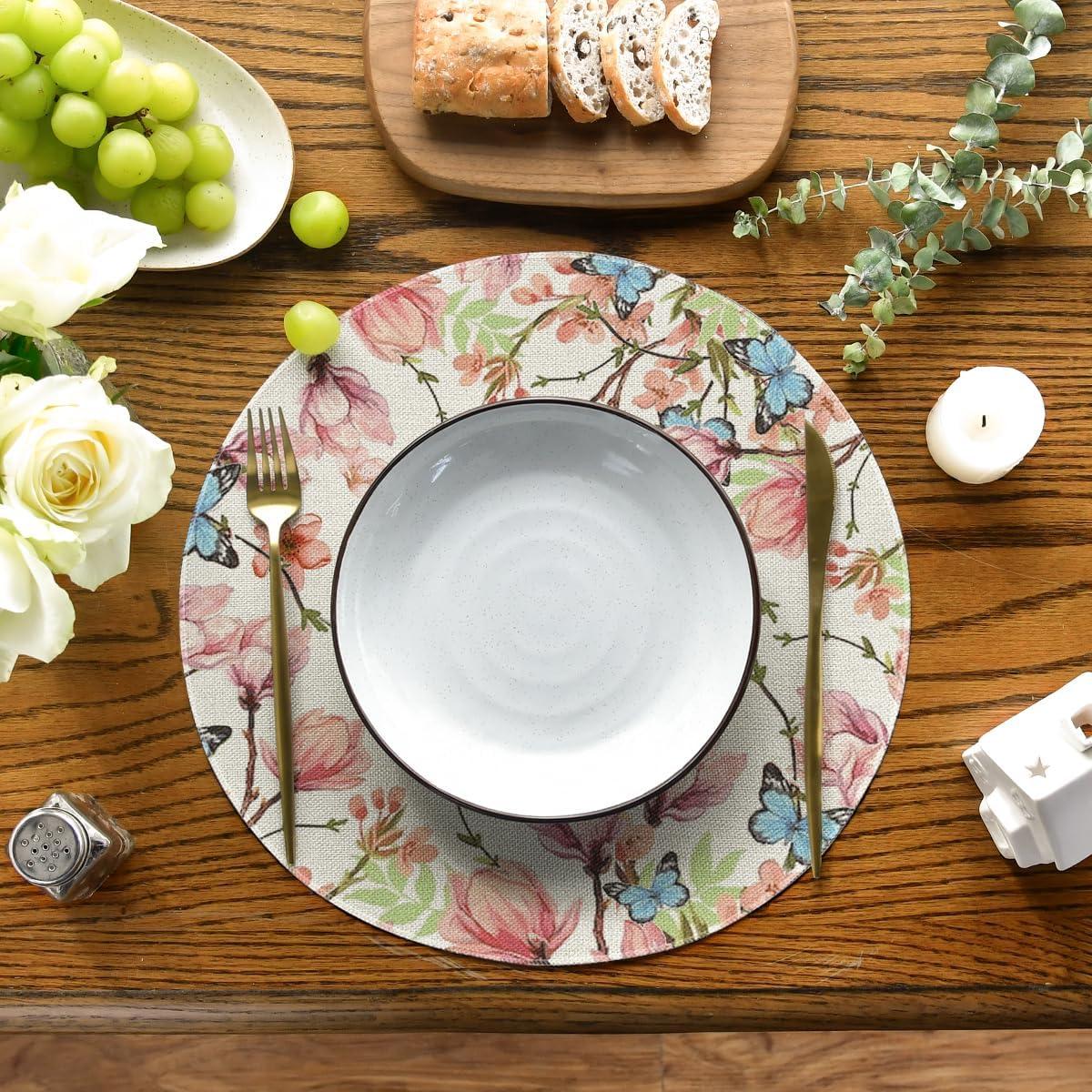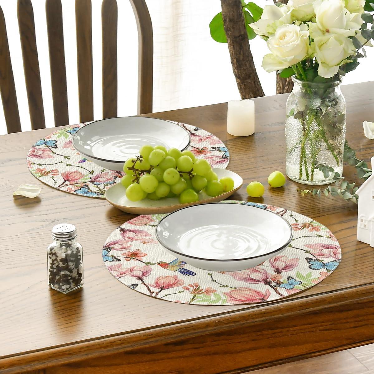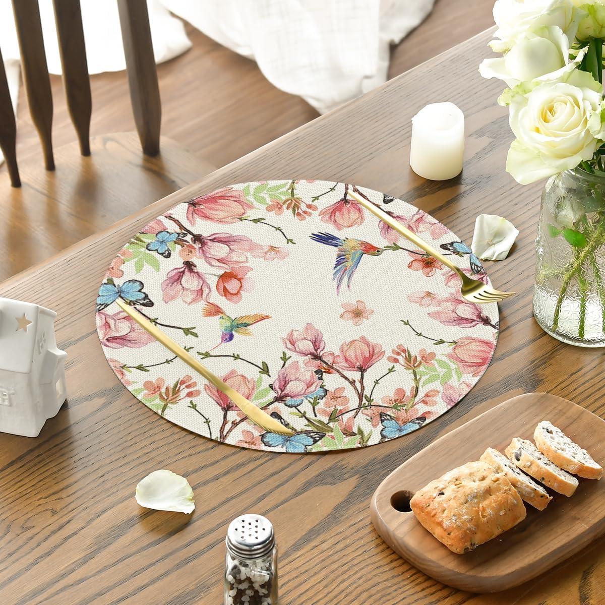 Artoid Mode Flowers Bird Butterfly Spring Round Placemats Set of 4, 14 Inch Summer Round Table Mats for Dining Decoration(Beige)
