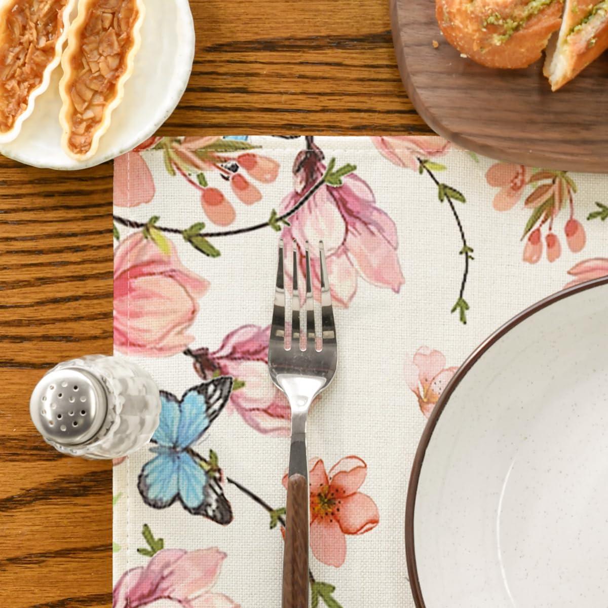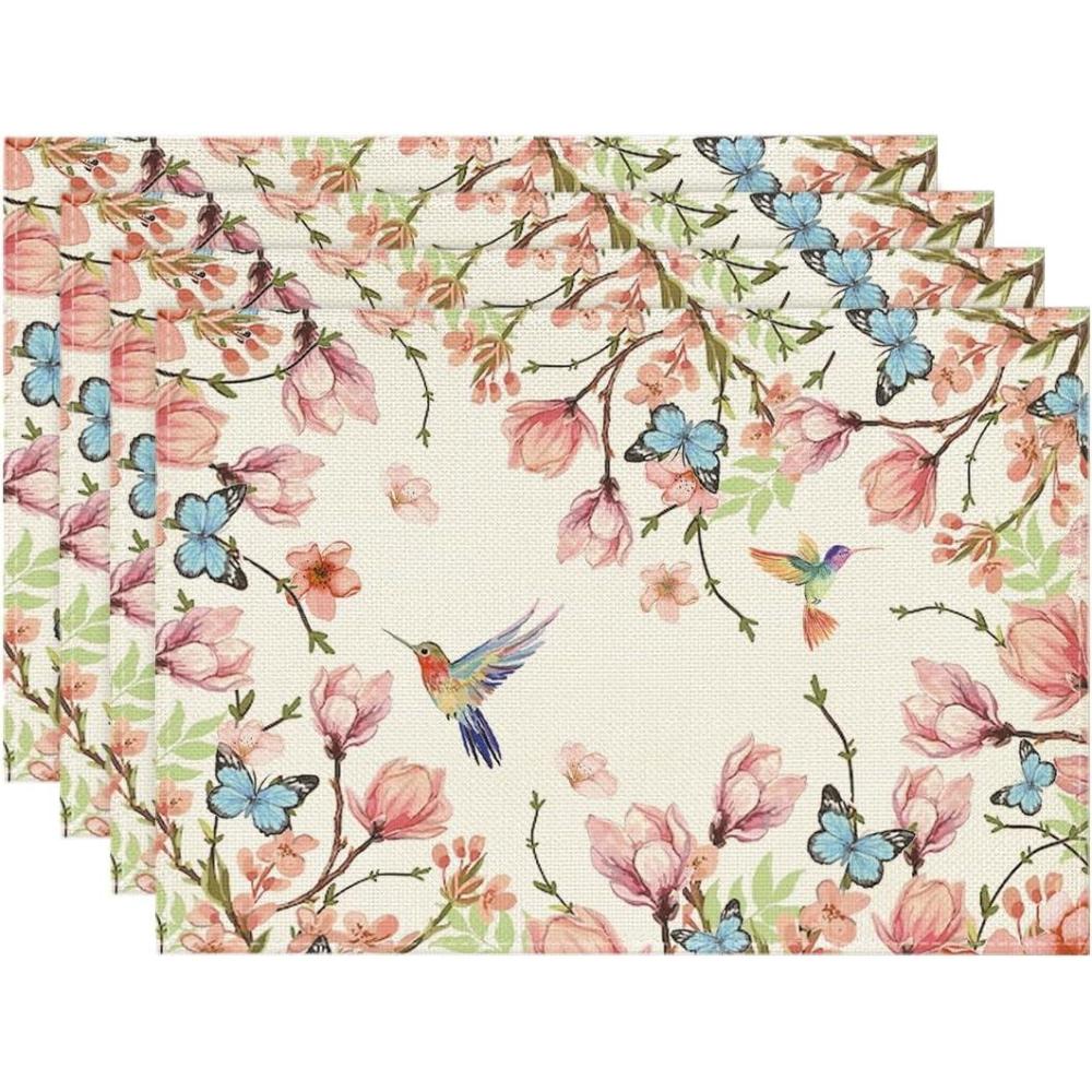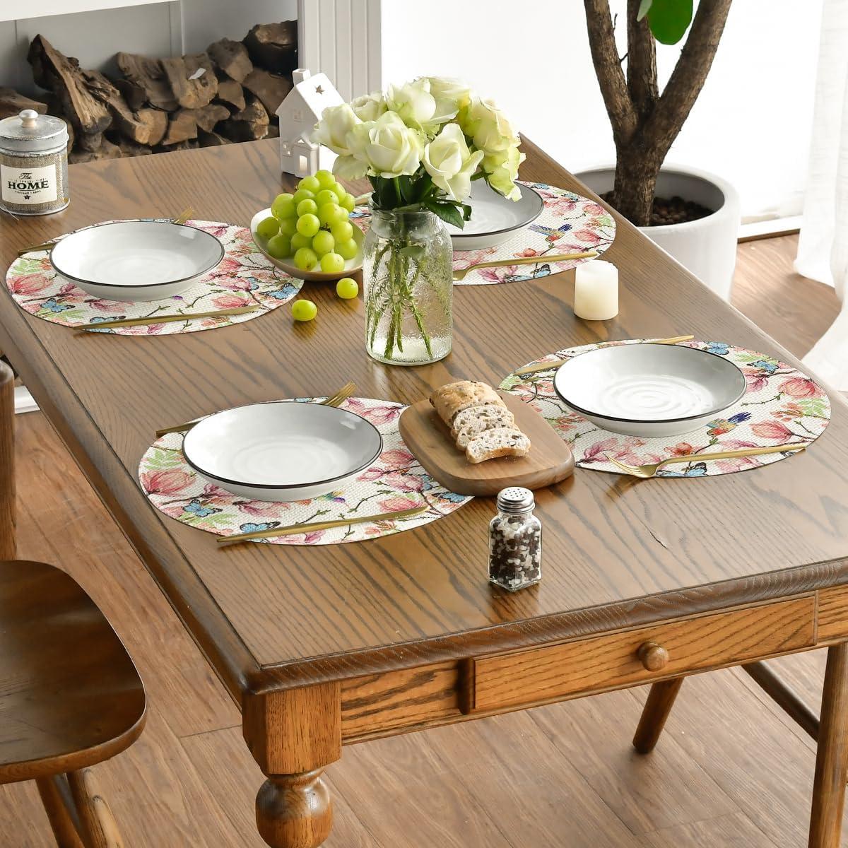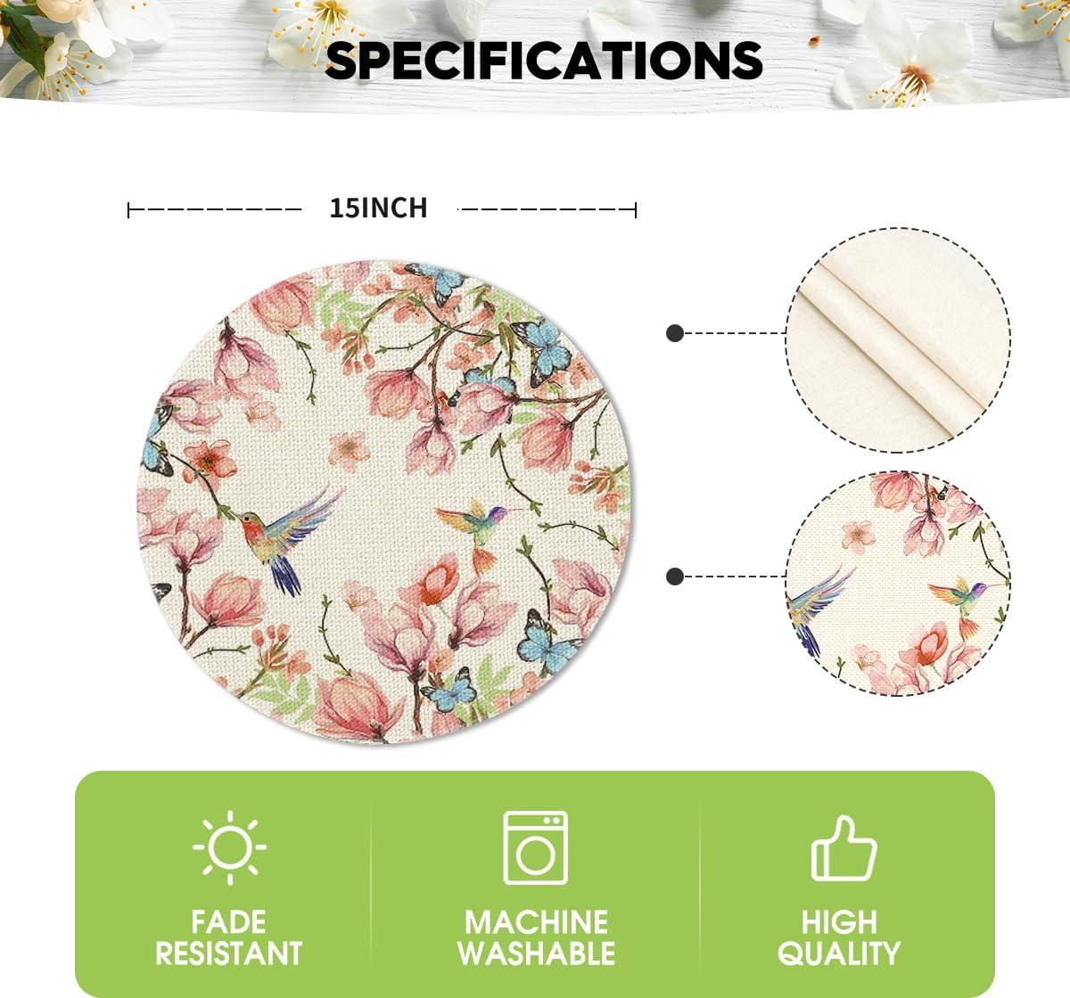 Artoid Mode Flowers Bird Butterfly Spring Round Placemats Set of 4, 14 Inch Summer Round Table Mats for Dining Decoration(Beige)