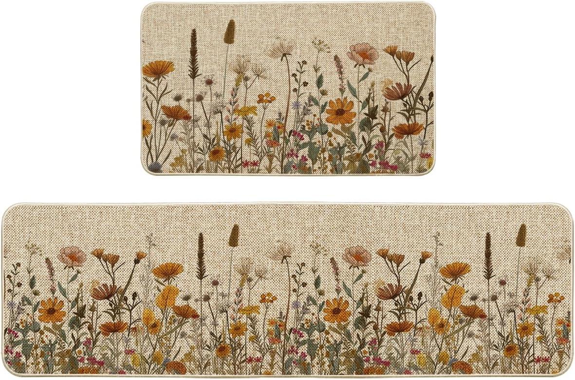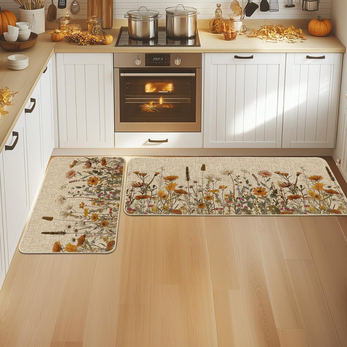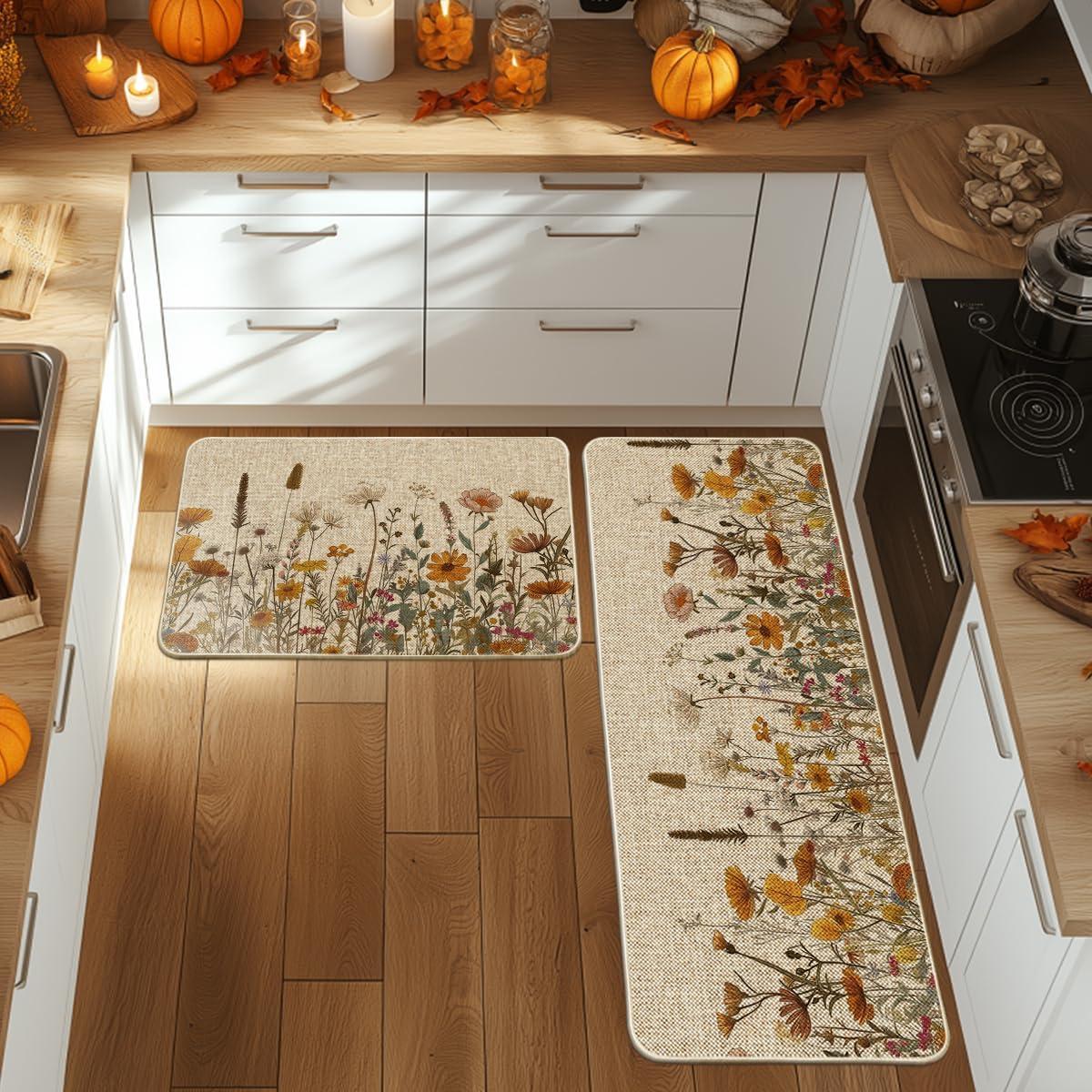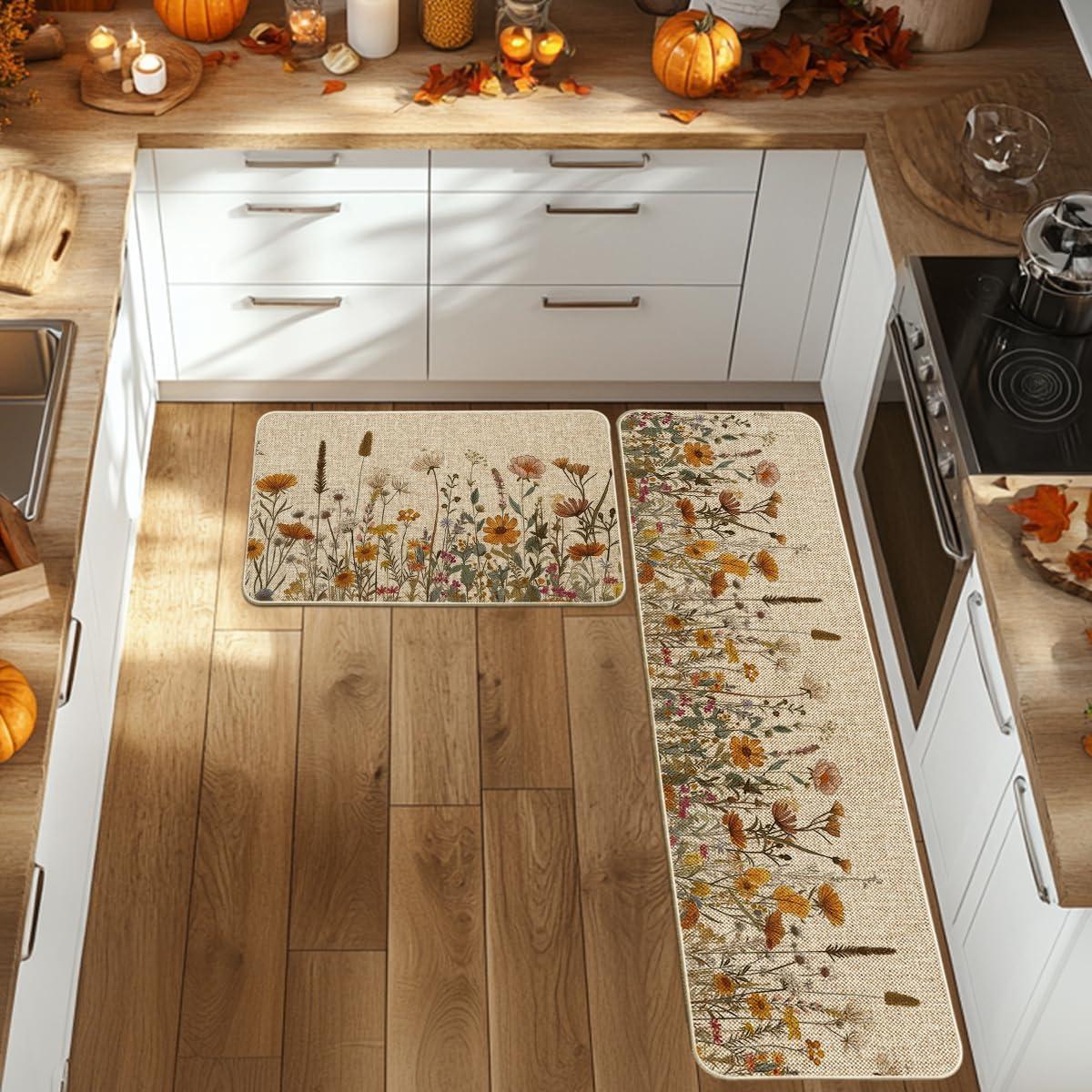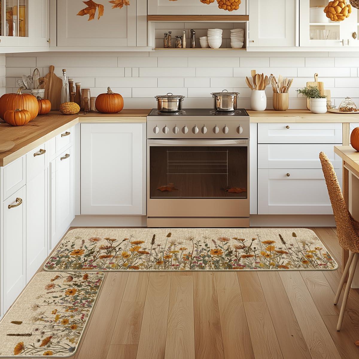 Artoid Mode Flowers Fall Kitchen Mats Set of 2, Autumn Home Decor Low-Profile Kitchen Rugs for Floor – 17×29 and 17×47 Inch(Beige)