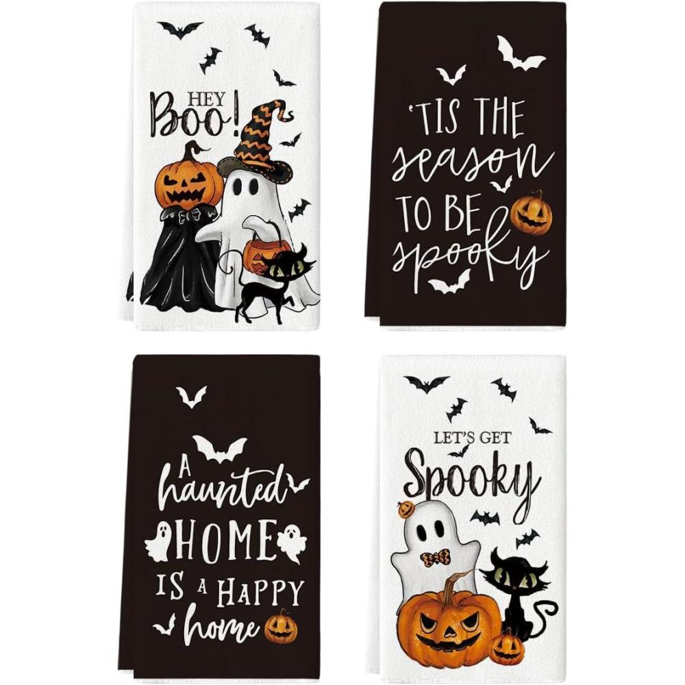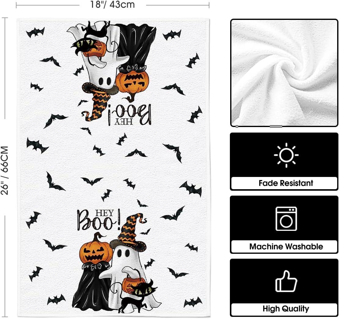 Artoid Mode Ghost Pumpkins Bats Cat Hey Boo Halloween Kitchen Towels Dish Towels, 18×26 Inch Jack-O’-Lantern Decoration Hand Towels Set of 4