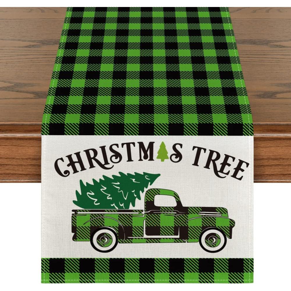 Artoid Mode Green and Black Buffalo Plaid Truck Christmas Table Runner, Seasonal Winter Xmas Holiday Kitchen Dining Table Decoration for Indoor Outdoor Home Party Decor 13 x 72 Inch