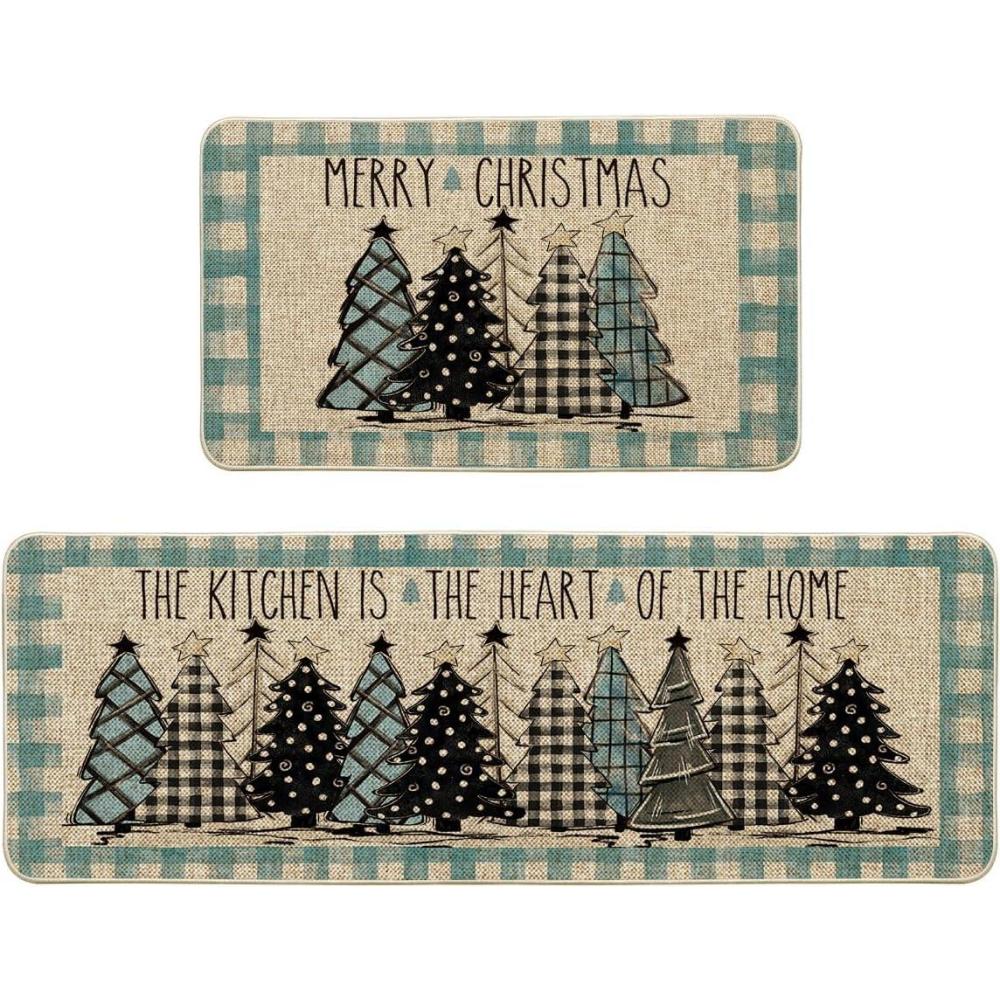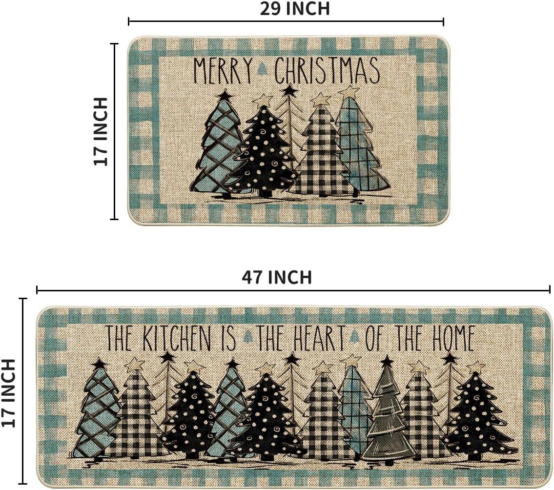 Artoid Mode Green Buffalo Plaid Xmas Tree Merry Christmas Kitchen Mats Set of 2, Winter Home Decor Low-Profile Kitchen Rugs for Floor – 17×29 and 17×47 Inch(Blue/Beige)