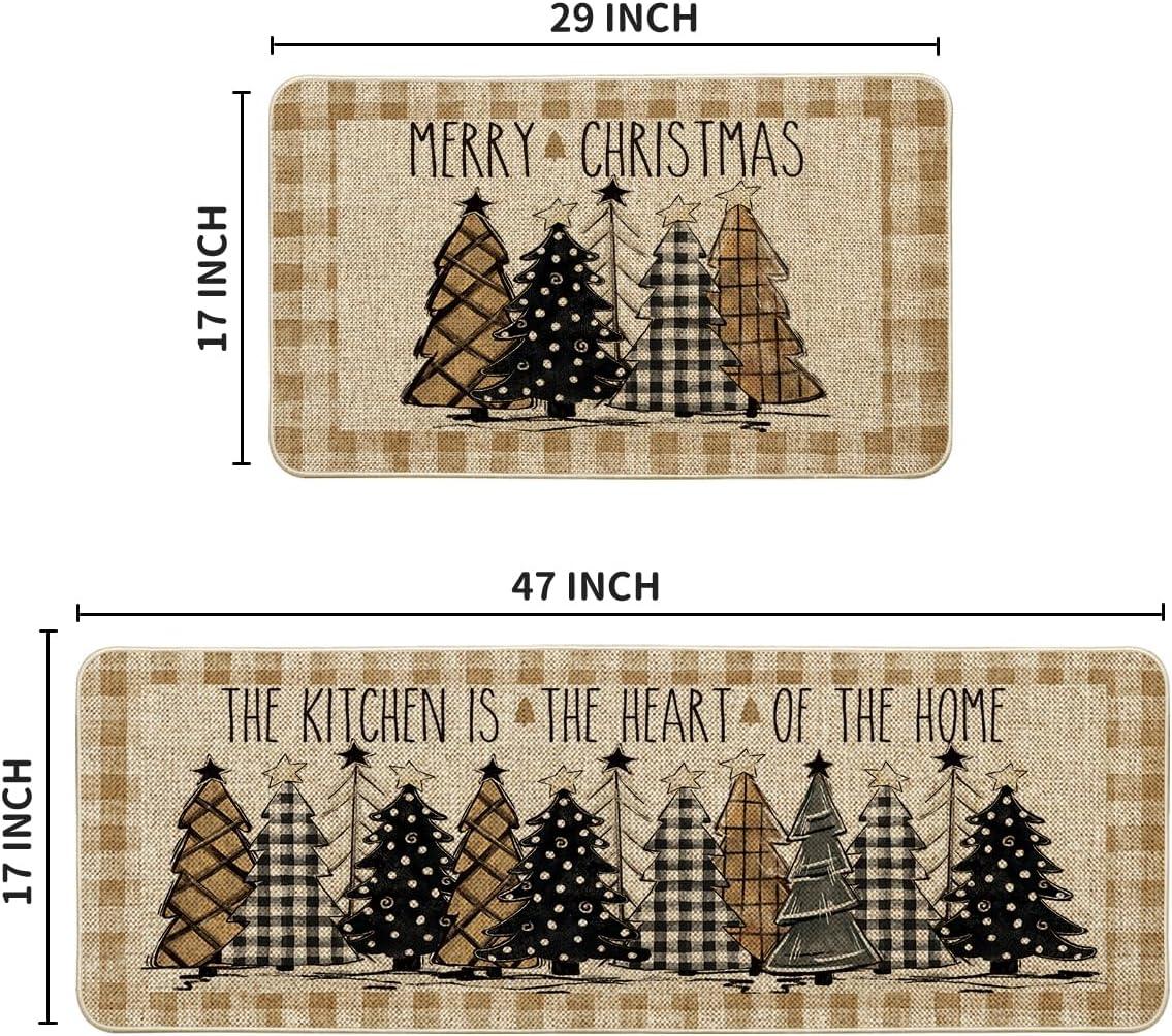 Artoid Mode Green Buffalo Plaid Xmas Tree Merry Christmas Kitchen Mats Set of 2, Winter Home Decor Low-Profile Kitchen Rugs for Floor – 17×29 and 17×47 Inch(Brown/Beige)