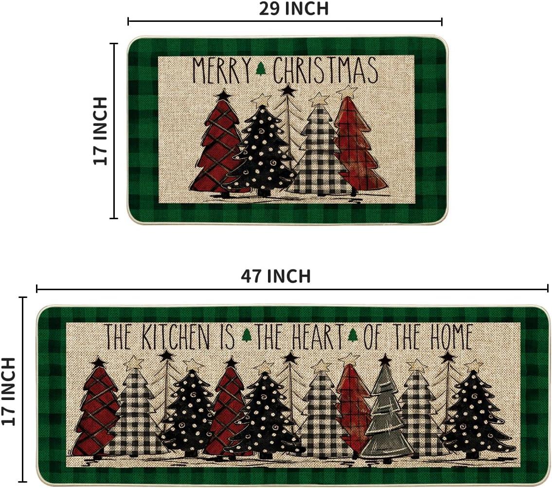 Artoid Mode Green Buffalo Plaid Xmas Tree Merry Christmas Kitchen Mats Set of 2, Winter Home Decor Low-Profile Kitchen Rugs for Floor – 17×29 and 17×47 Inch(Green/Beige)