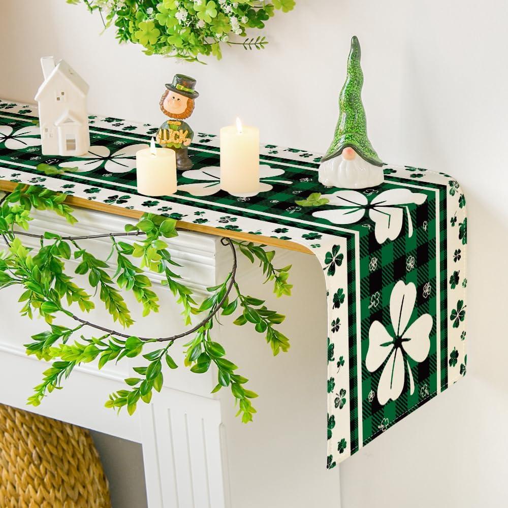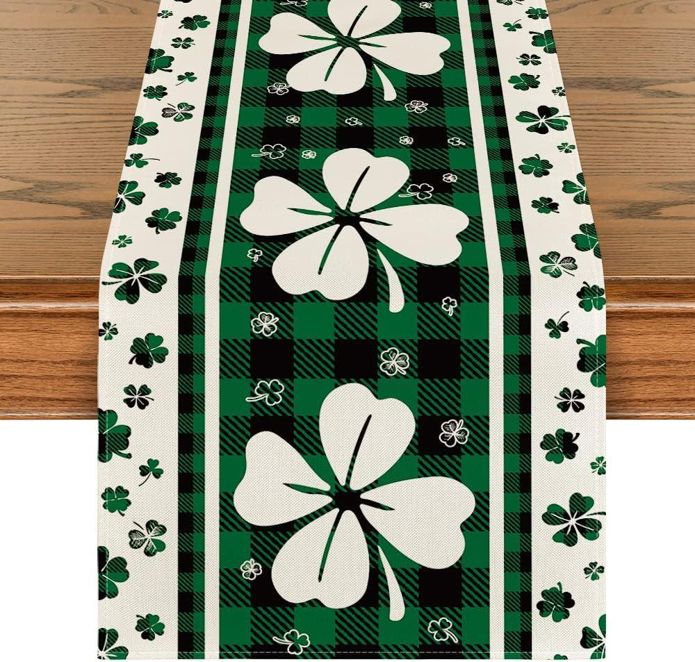 Artoid Mode Green Clover Buffalo Plaid Shamrocks St.Patrick’s Day Table Runner, Seasonal Kitchen Dining Table Decoration for Indoor Home Party 13×72 Inch(Green)