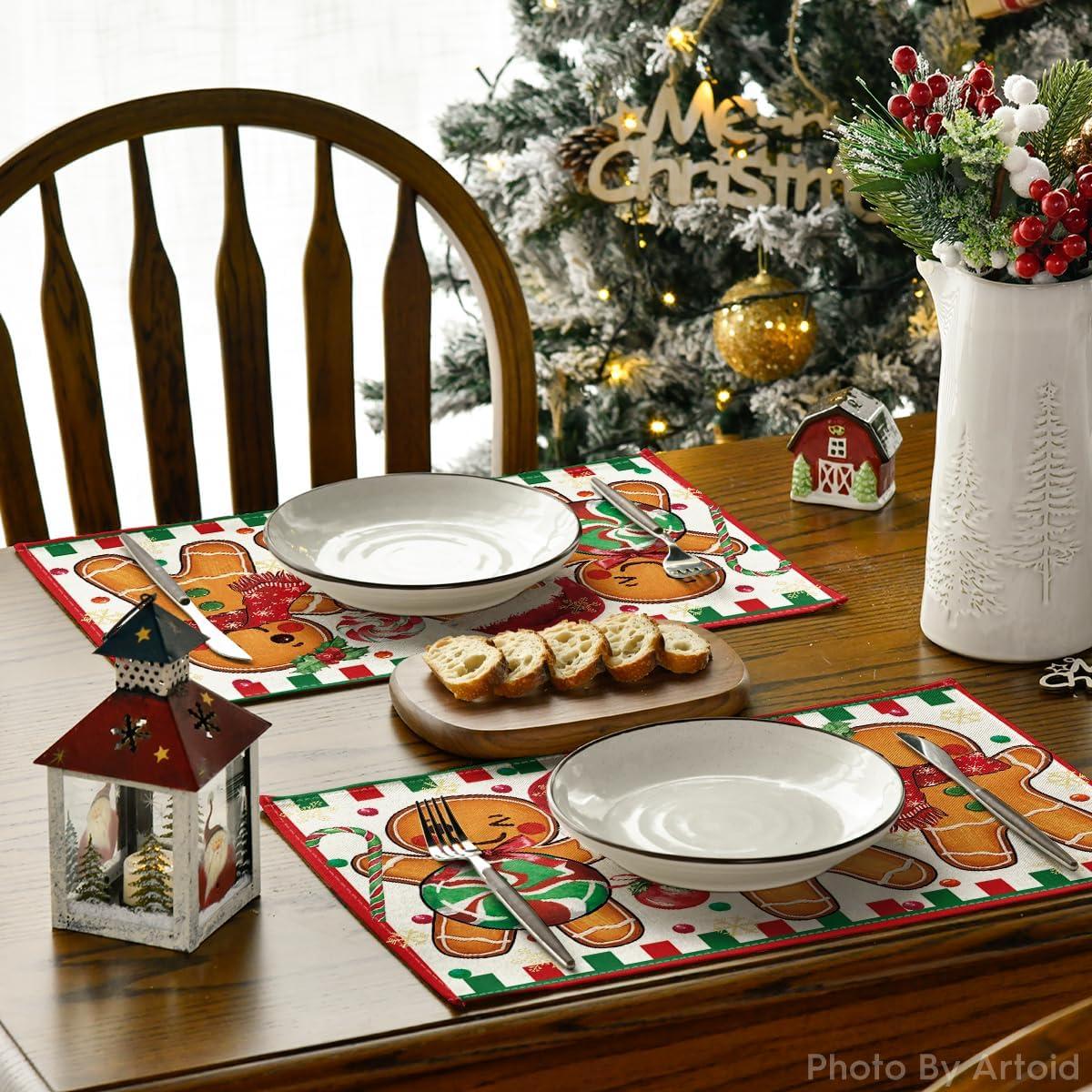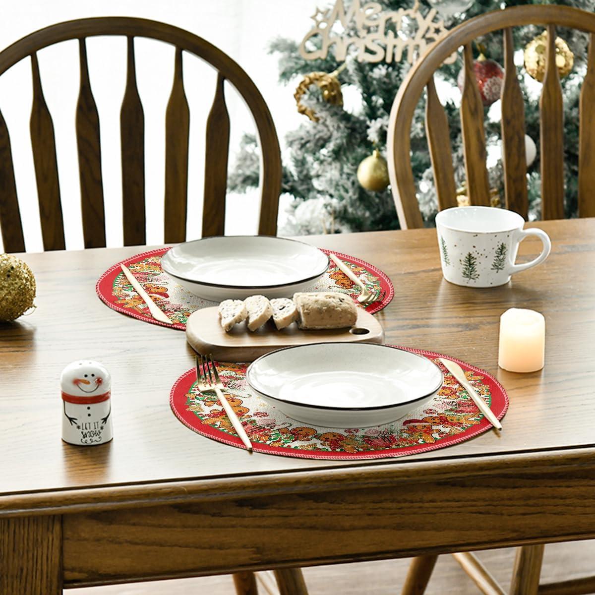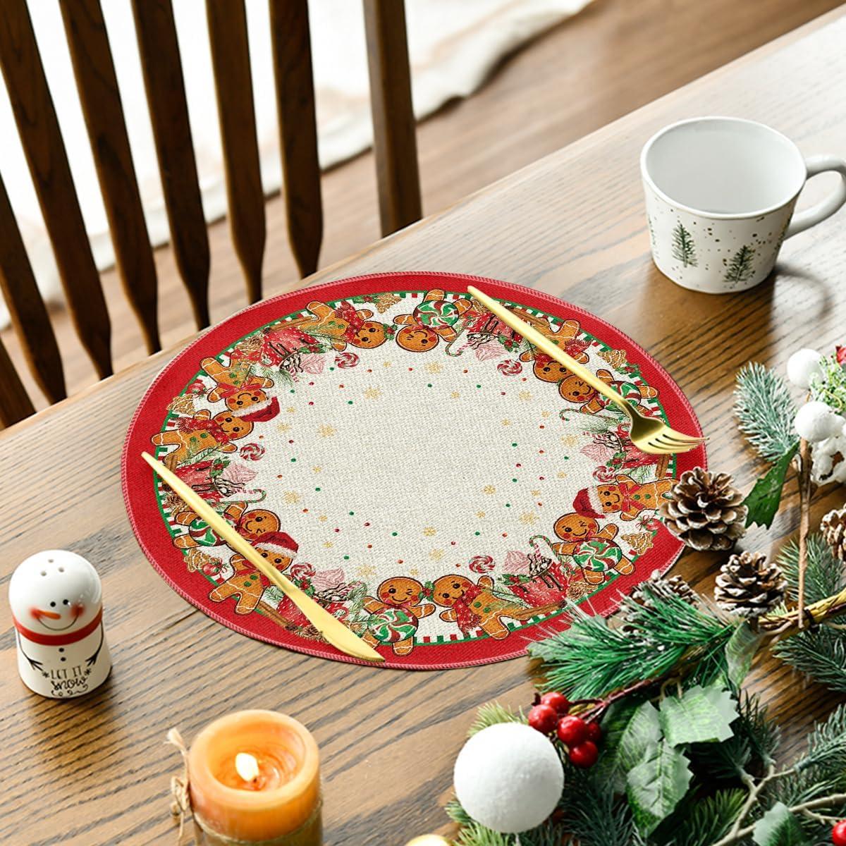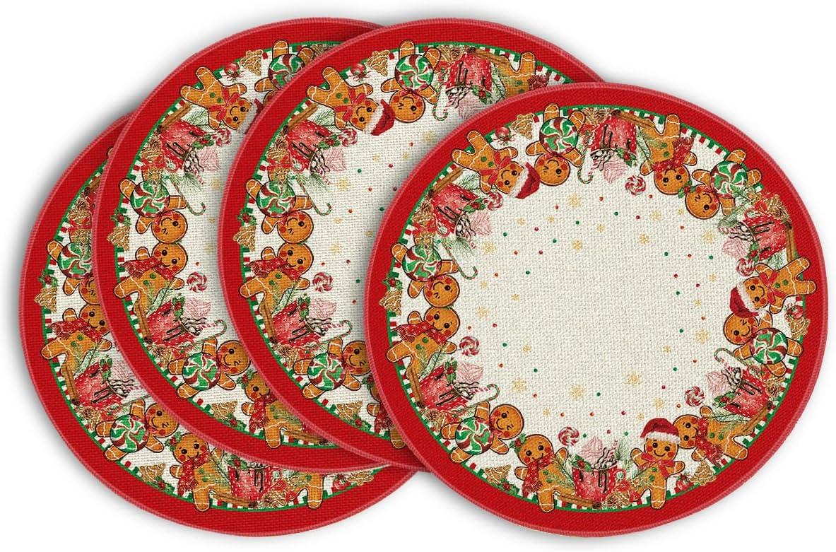 Artoid Mode Green Gingerbread Candy Cane Christmas Round Placemats Set of 4, 14 Inch Winter Round Table Mats for Dining Decoration(Red/Beige)