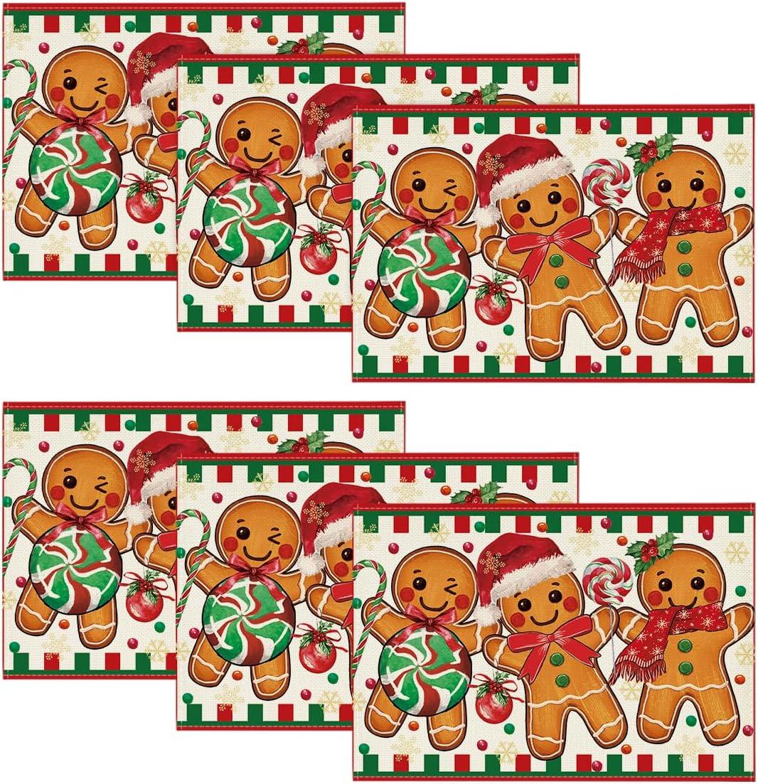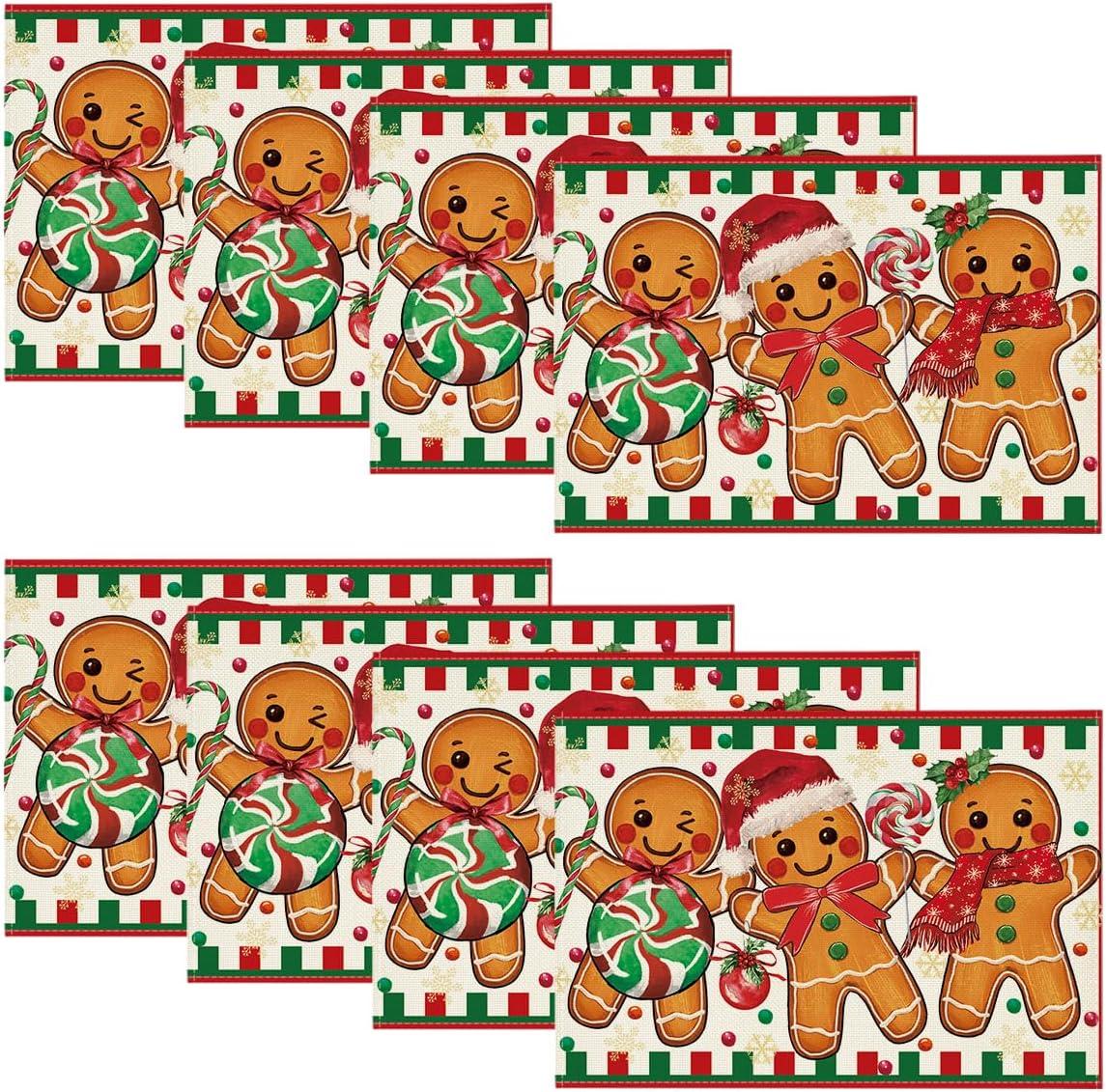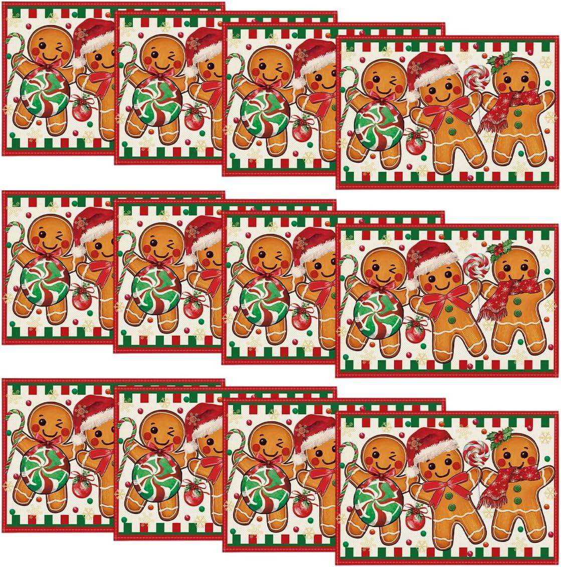 Artoid Mode Green Gingerbread Candy Cane Christmas Round Placemats Set of 4, 14 Inch Winter Round Table Mats for Dining Decoration(Red/Beige)