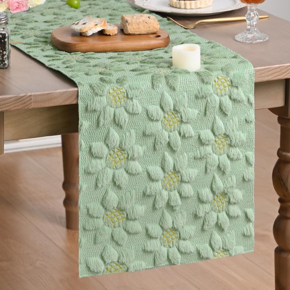 Artoid Mode Green Soft Plush Faux Fur Jacquard Embroidery Sunflower Spring Table Runner, Kitchen Dining Table Decoration for Home Party Decor 13×72 Inch(Green)
