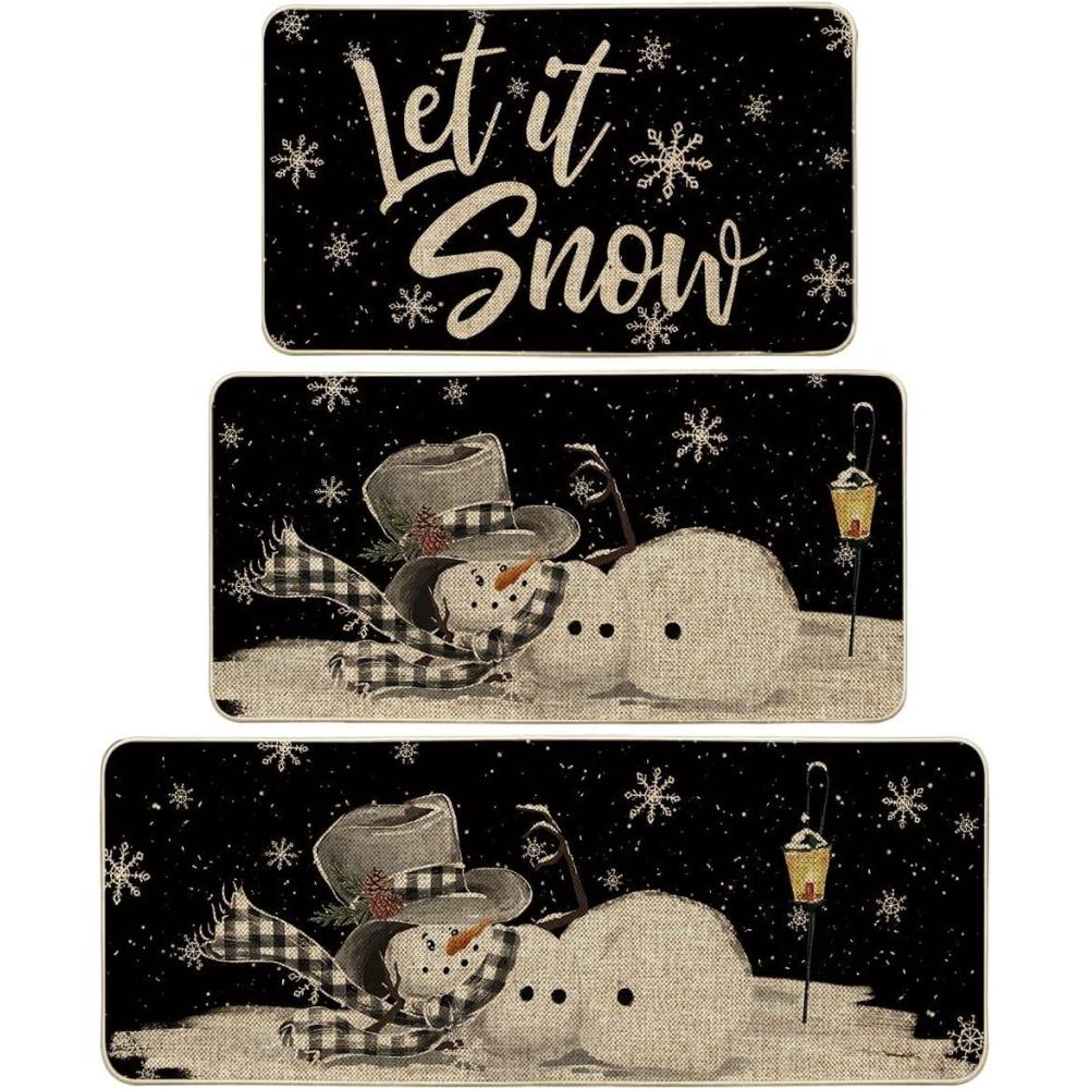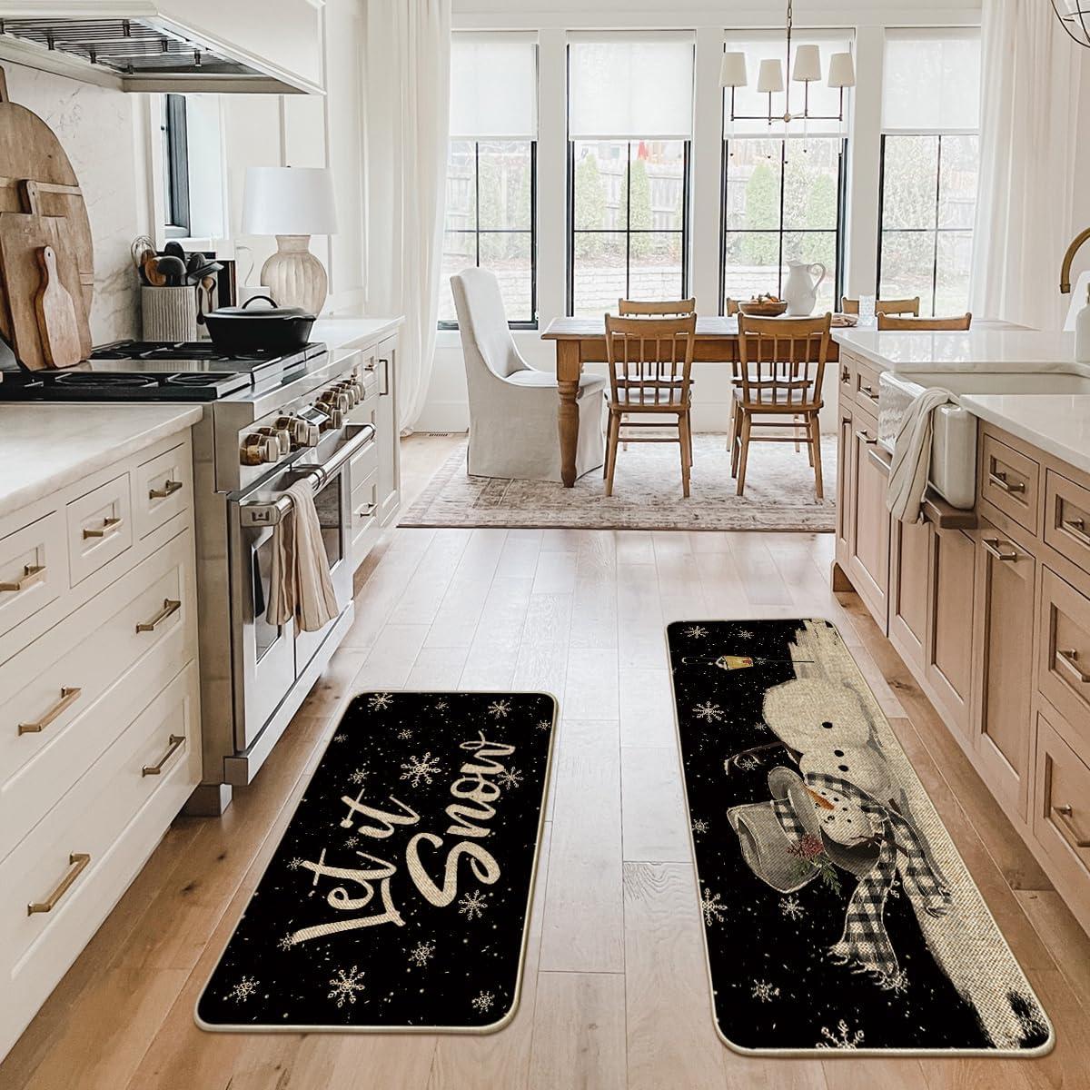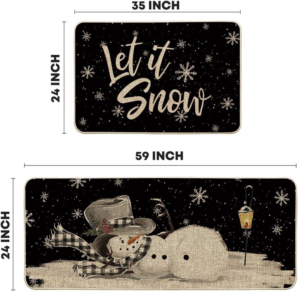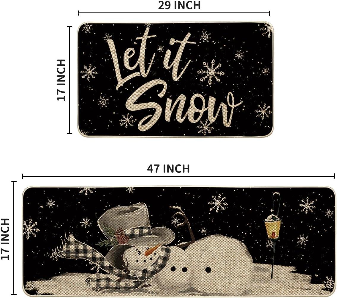 Artoid Mode Grey Let It Snow Snowflake Snowman Winter Kitchen Mats Set of 2, Christmas Decor Low-Profile Kitchen Rugs for Floor – 17×29 and 17×47 Inch(Black)