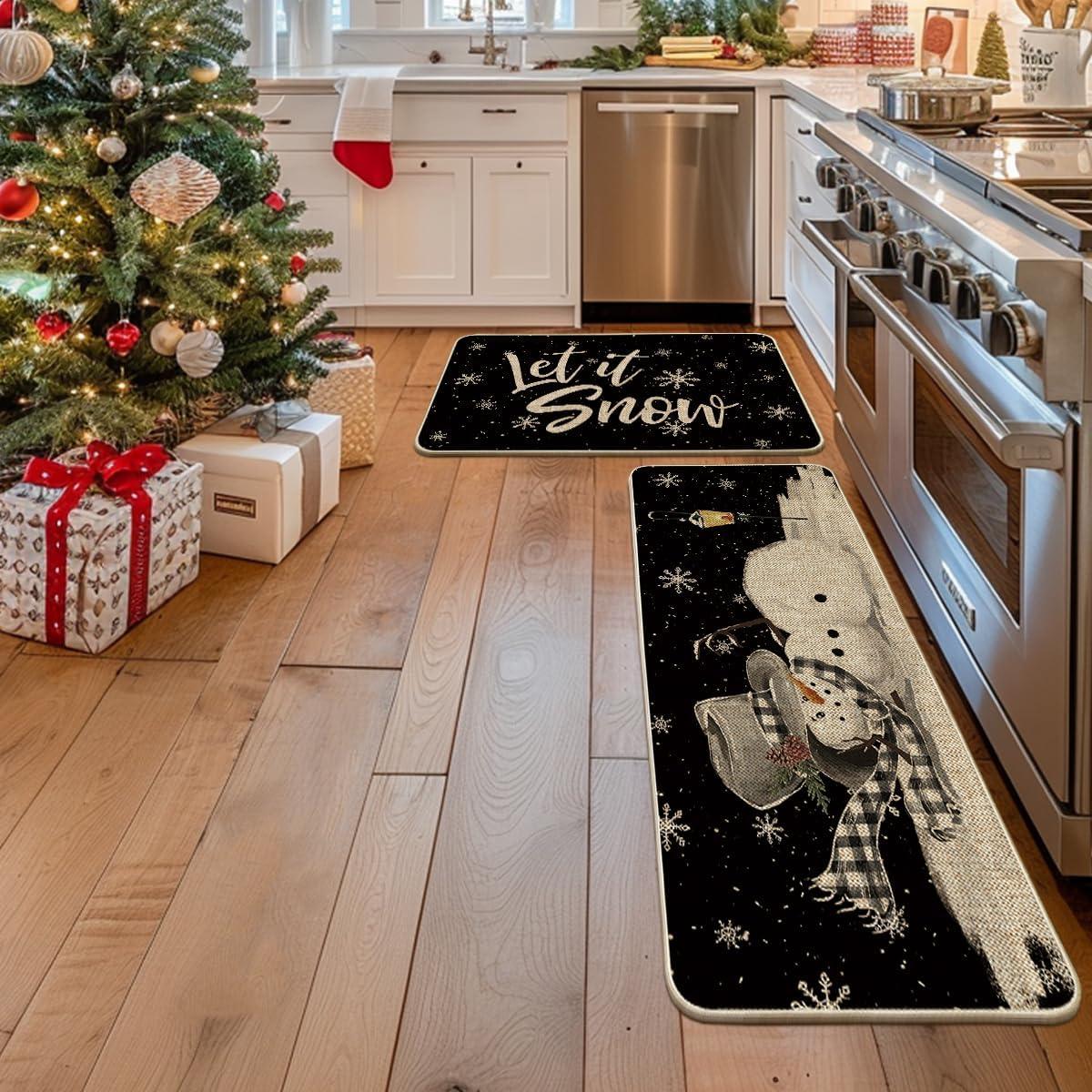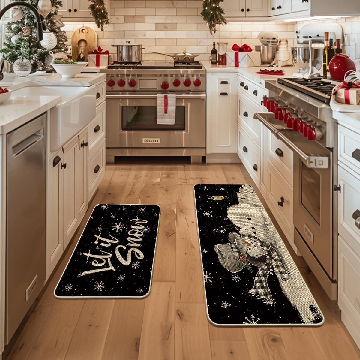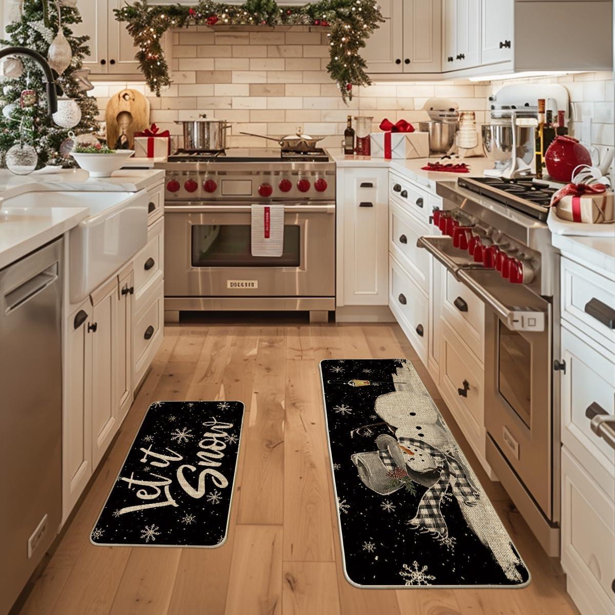 Artoid Mode Grey Let It Snow Snowflake Snowman Winter Kitchen Mats Set of 2, Christmas Decor Low-Profile Kitchen Rugs for Floor – 17×29 and 17×47 Inch(Black)