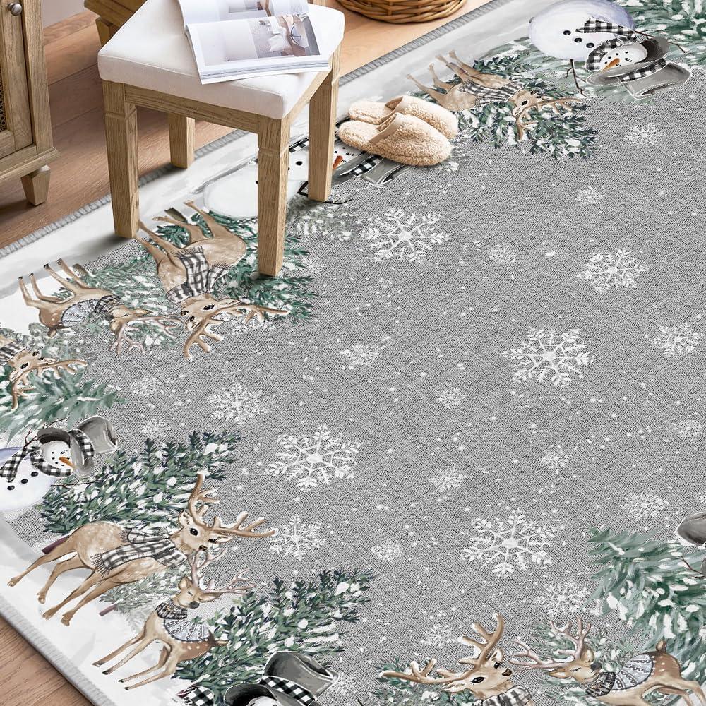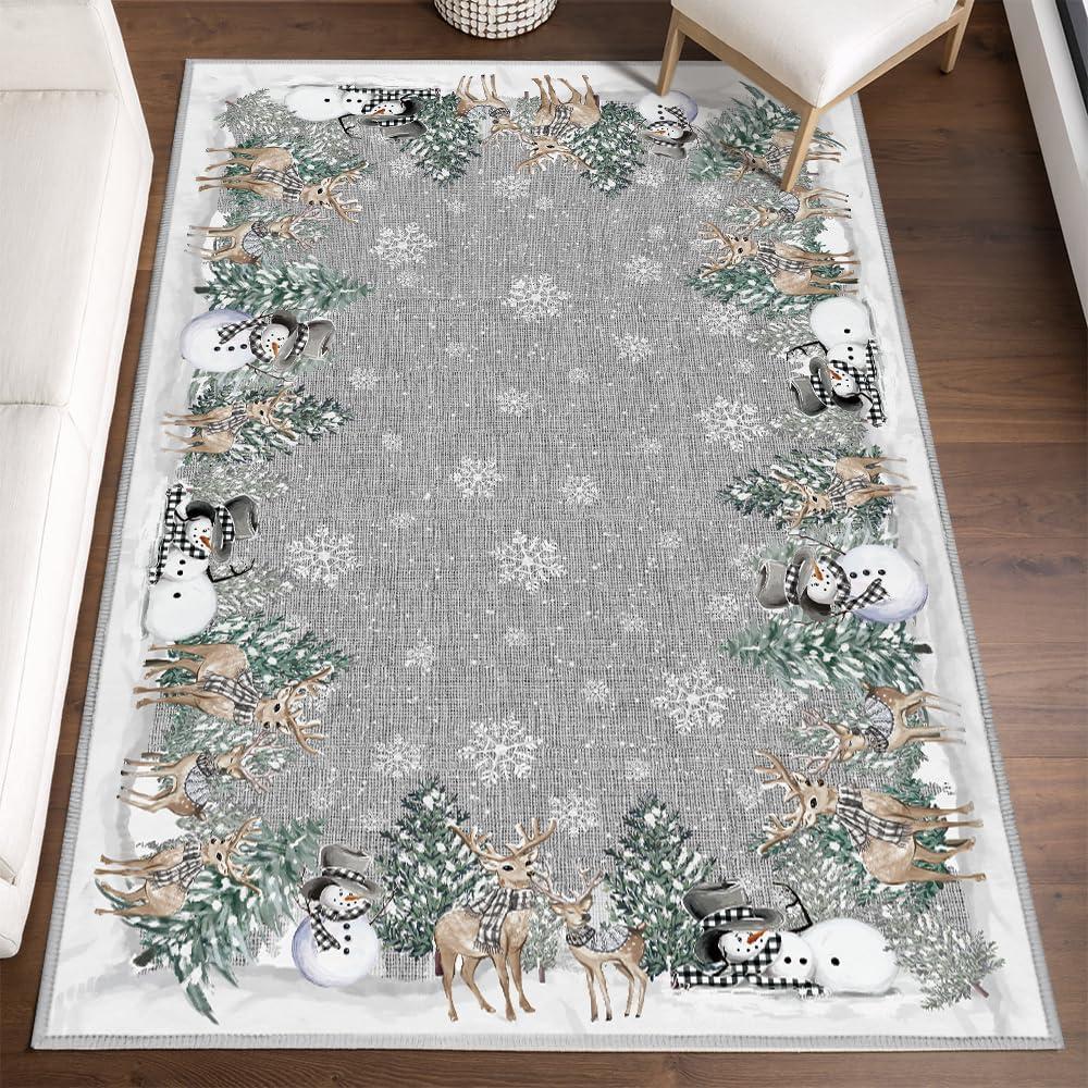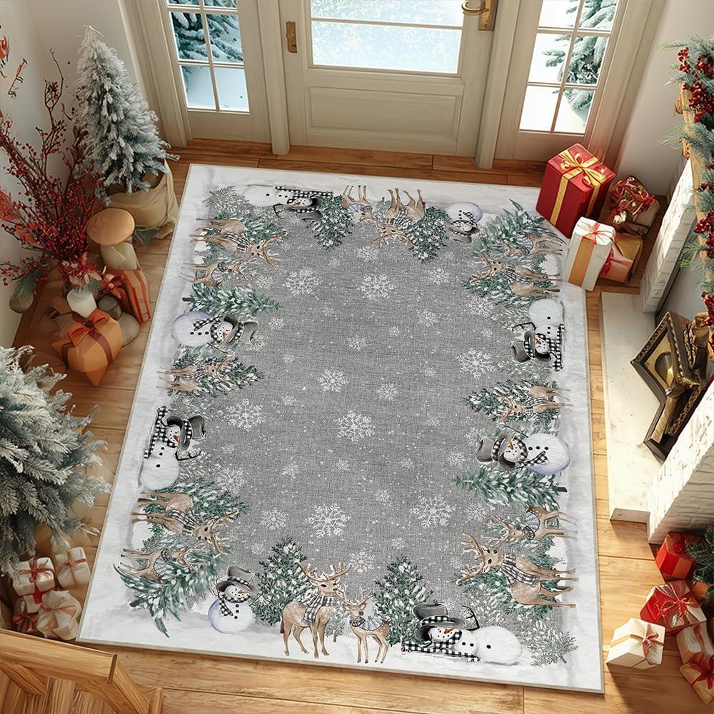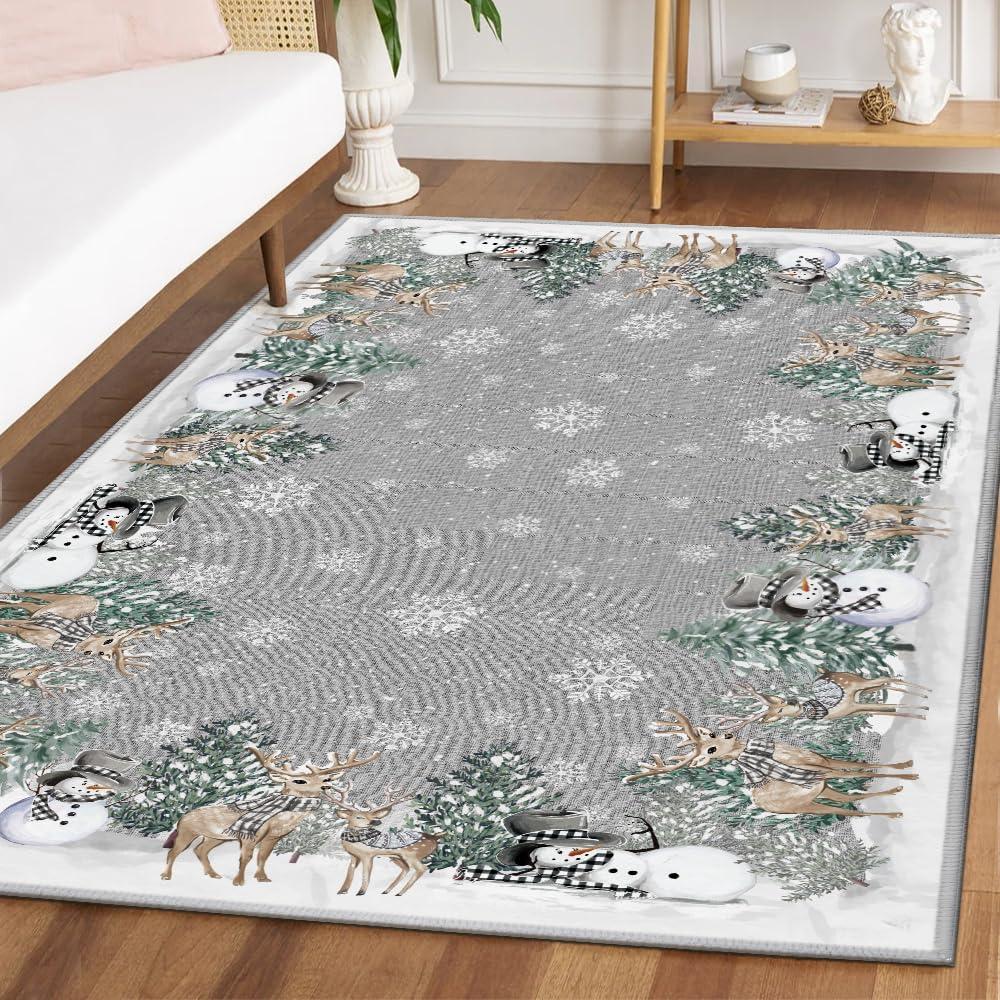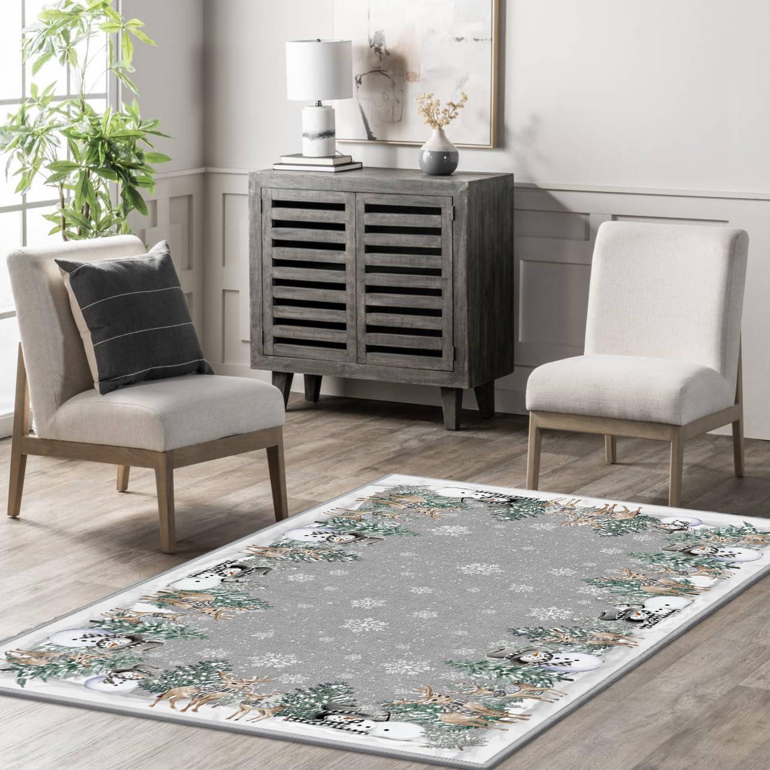 Artoid Mode Grey Snowman Deer Tree Christmas Area Rug, Winter Home Decor Low-Profile Washable Area Rugs for Entryway Bedroom Living Room Laundry Room Indoor 5×7 Feet(Grey Snowman)