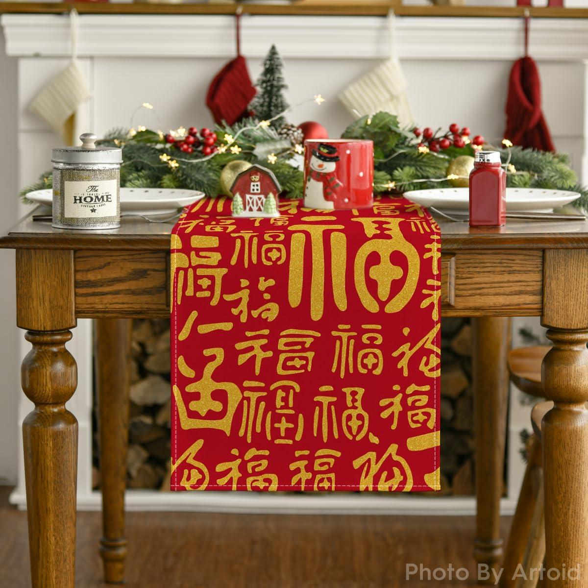 Artoid Mode Happiness Blessing Chinese Fu 2025 Happy Lunar New Year Table Runner, Spring Festival Winter Kitchen Dining Table Decoration for Home Party 13×72 Inch(Red/Golden)