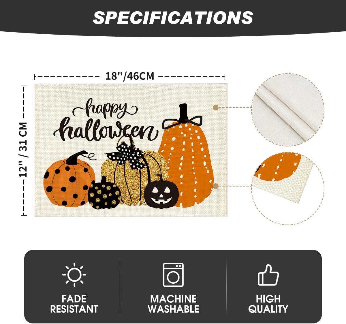 Artoid Mode Happy Halloween Jack-O-Lantern Placemats for Dining Table, 12 x 18 Inch Holiday Pumpkins Washable Table Mat Set of 4