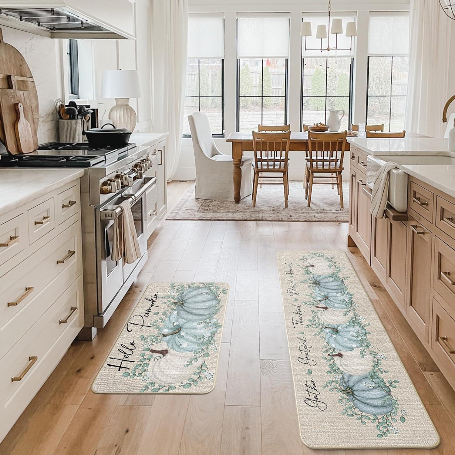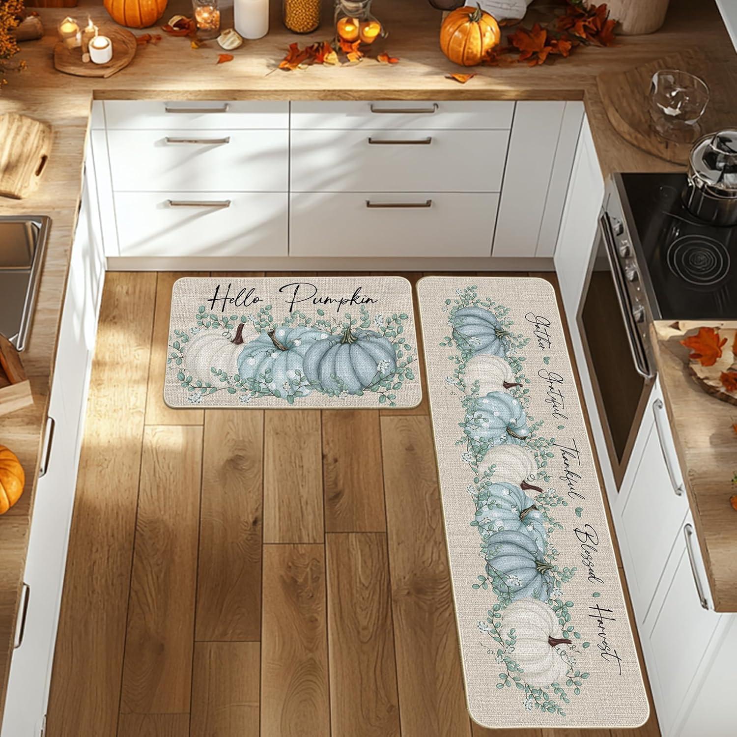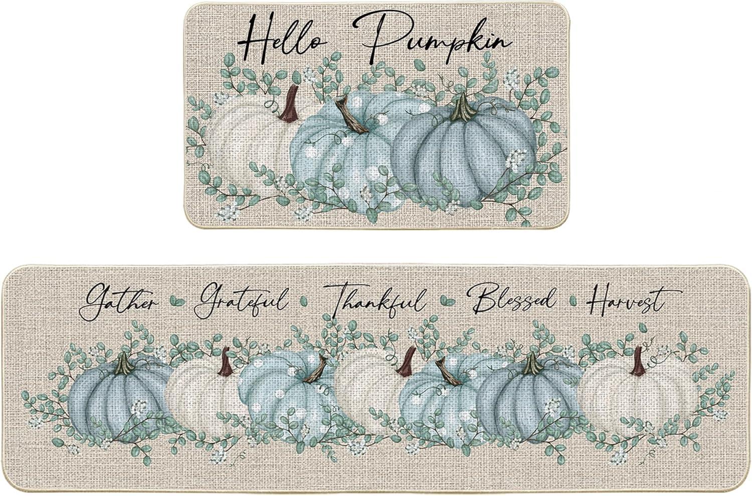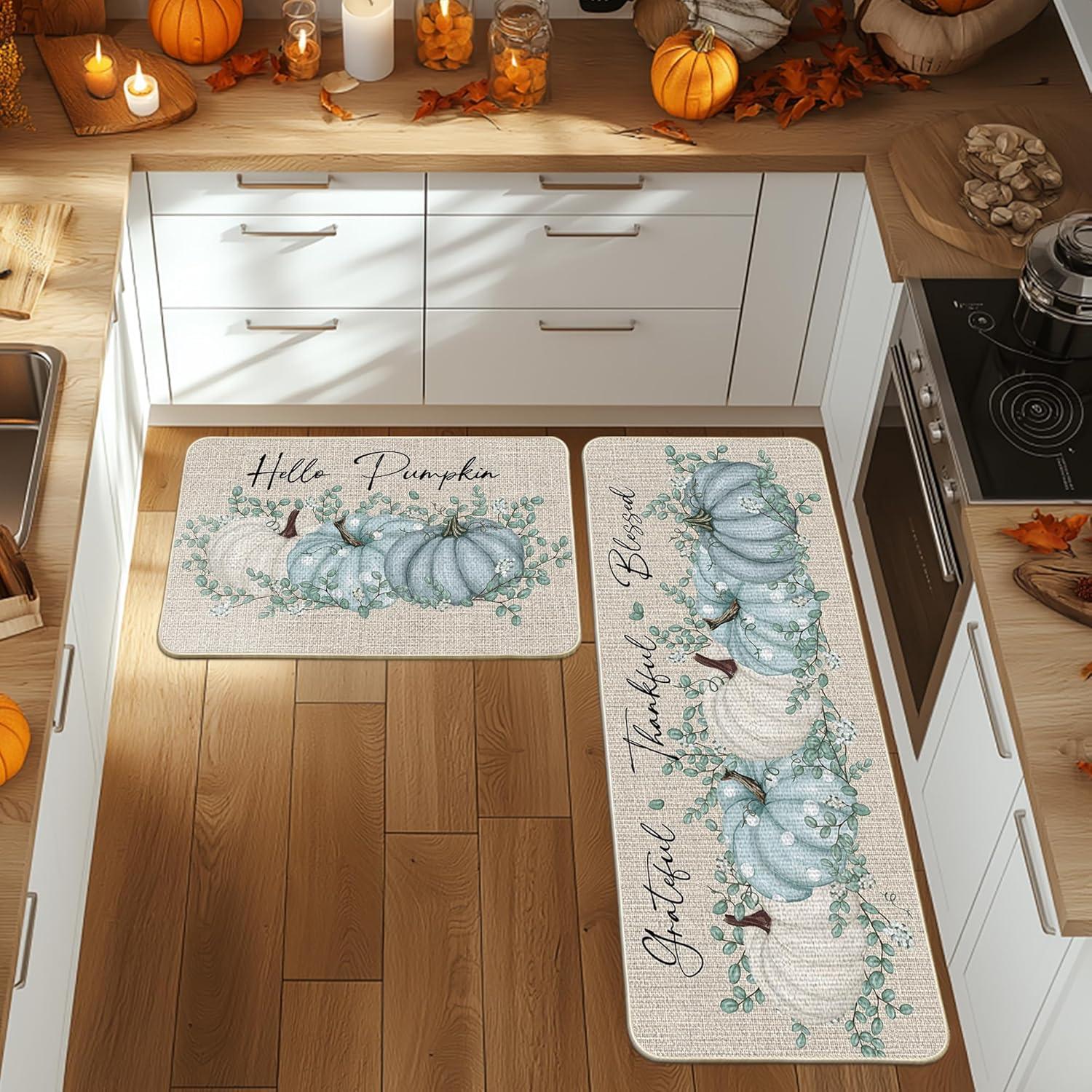 Artoid Mode Hello Pumpkin Eucalyptus Fall Kitchen Mats Set of 2, Thanksgiving Home Decor Low-Profile Kitchen Rugs for Floor – 17×29 and 17×47 Inch(Blue)
