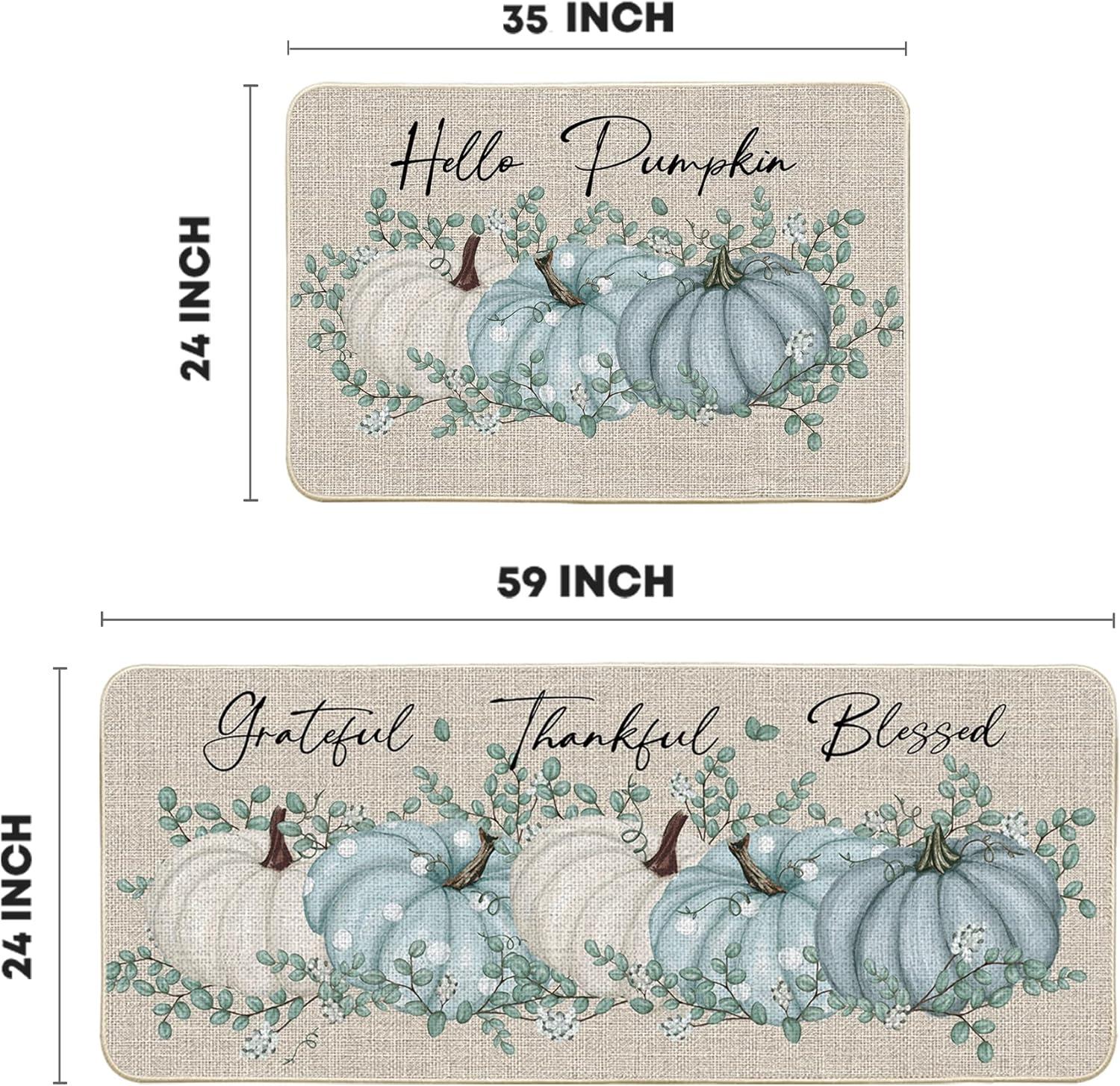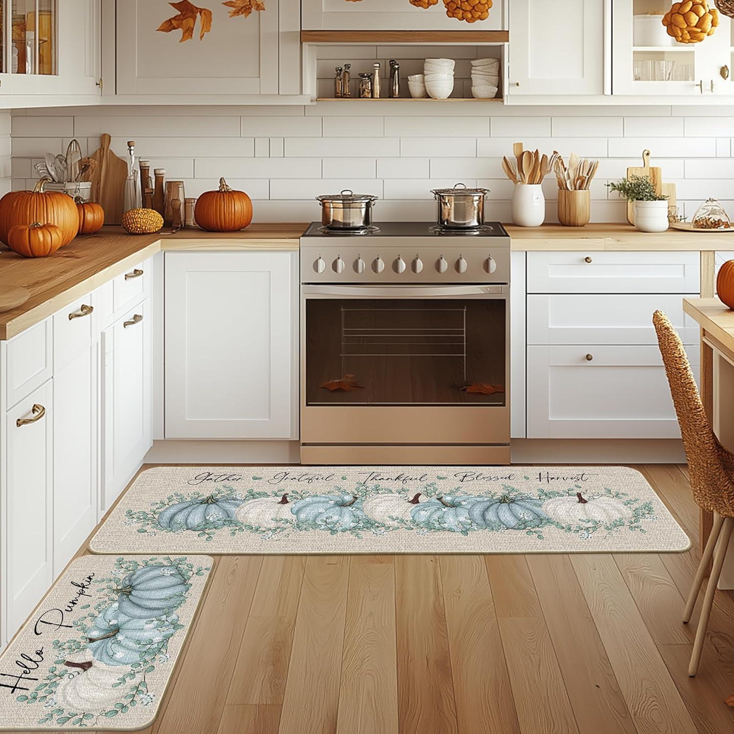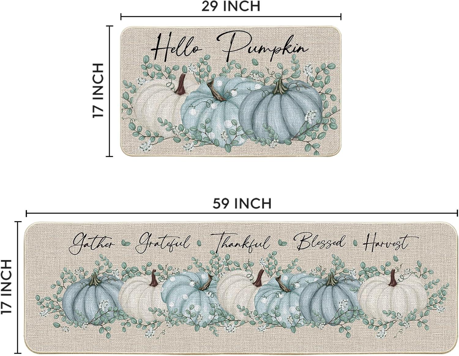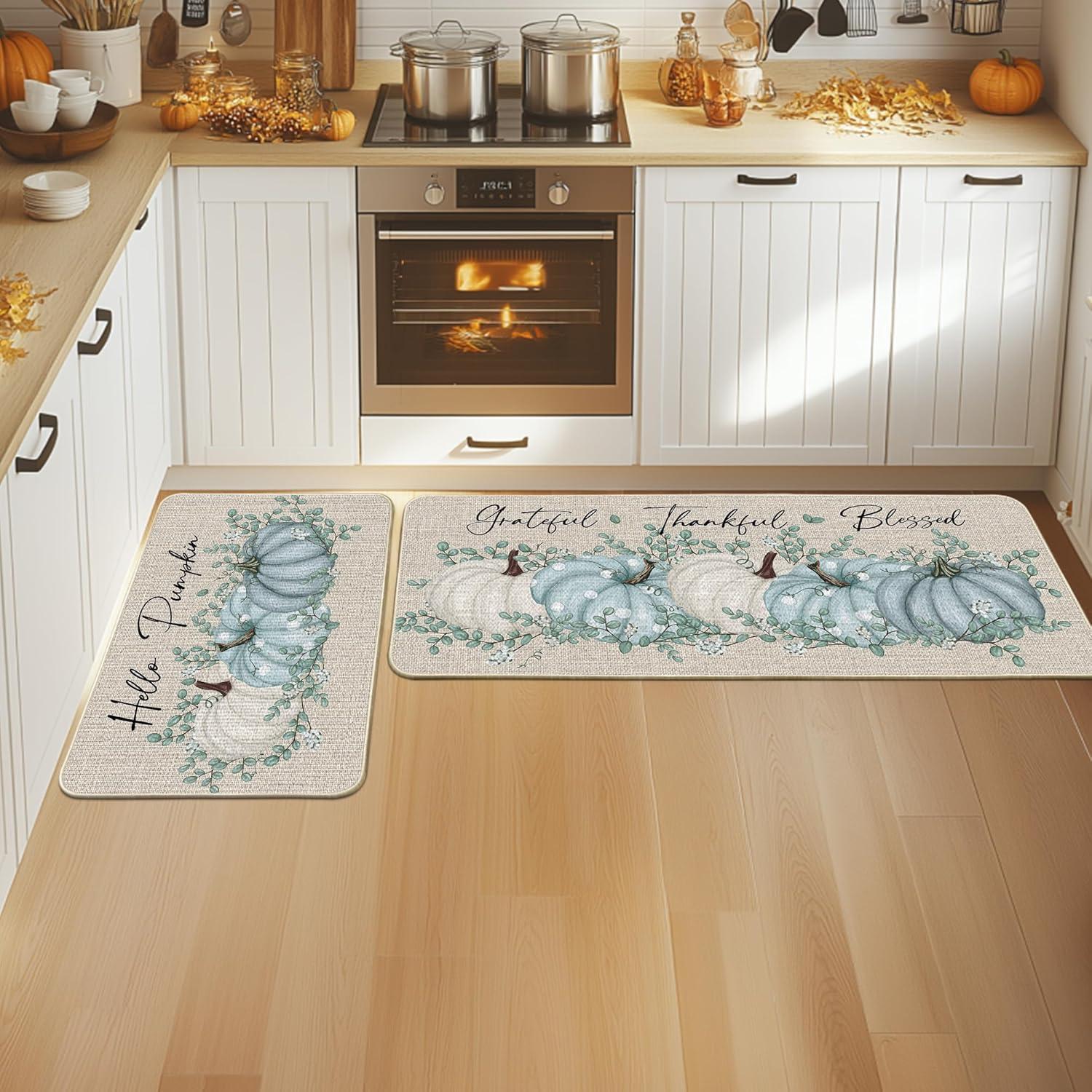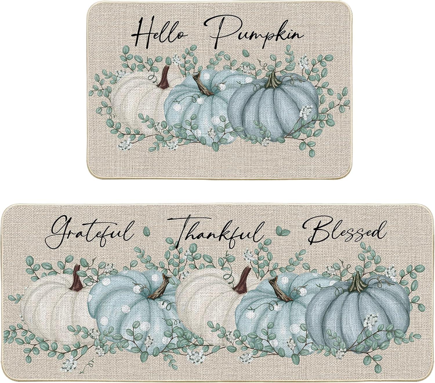 Artoid Mode Hello Pumpkin Eucalyptus Fall Kitchen Mats Set of 2, Thanksgiving Home Decor Low-Profile Kitchen Rugs for Floor – 17×29 and 17×47 Inch(Blue)