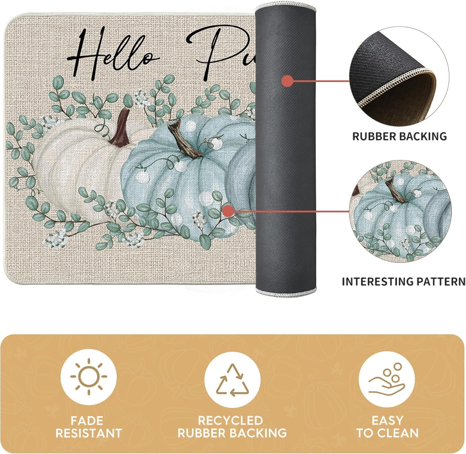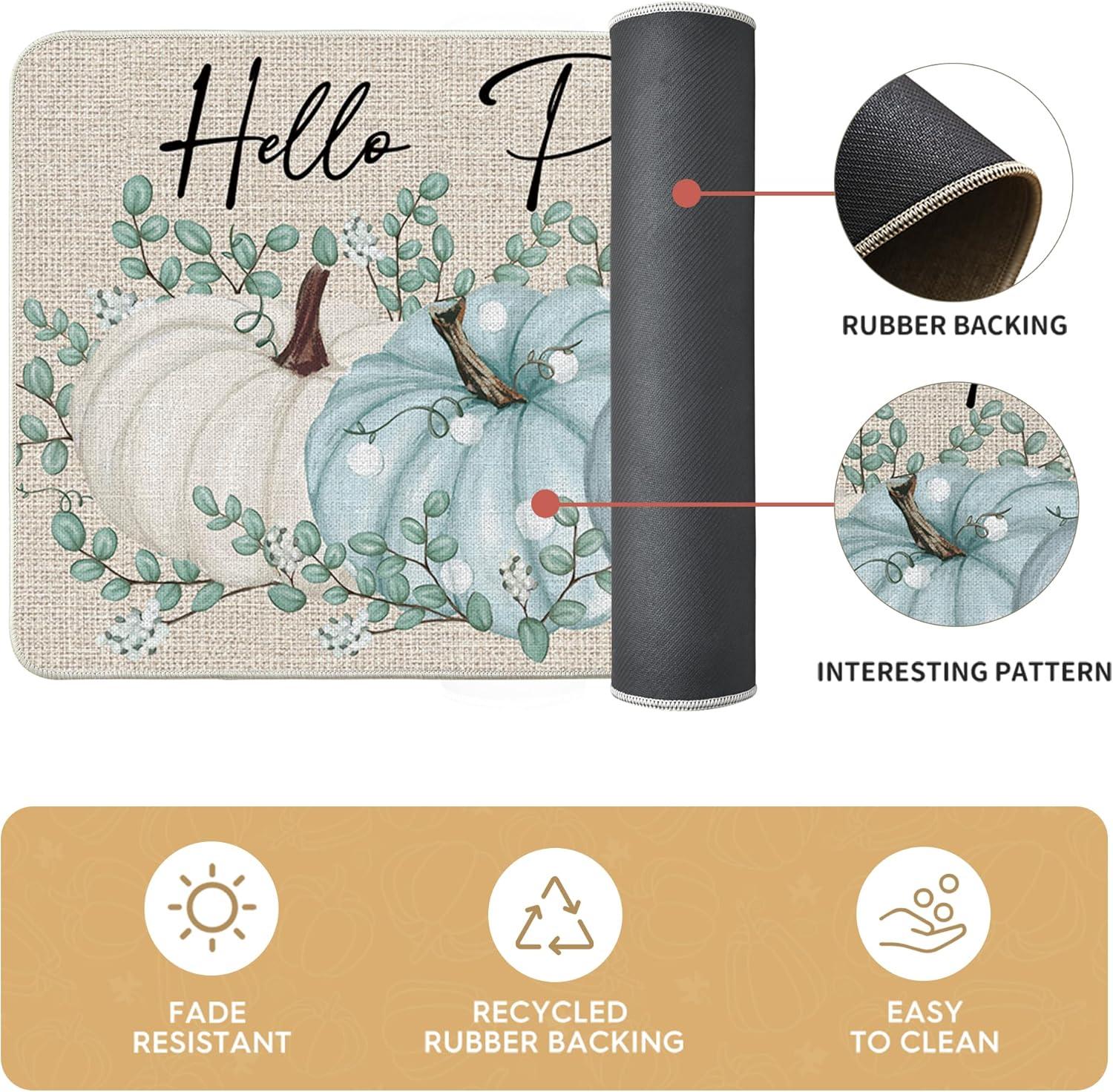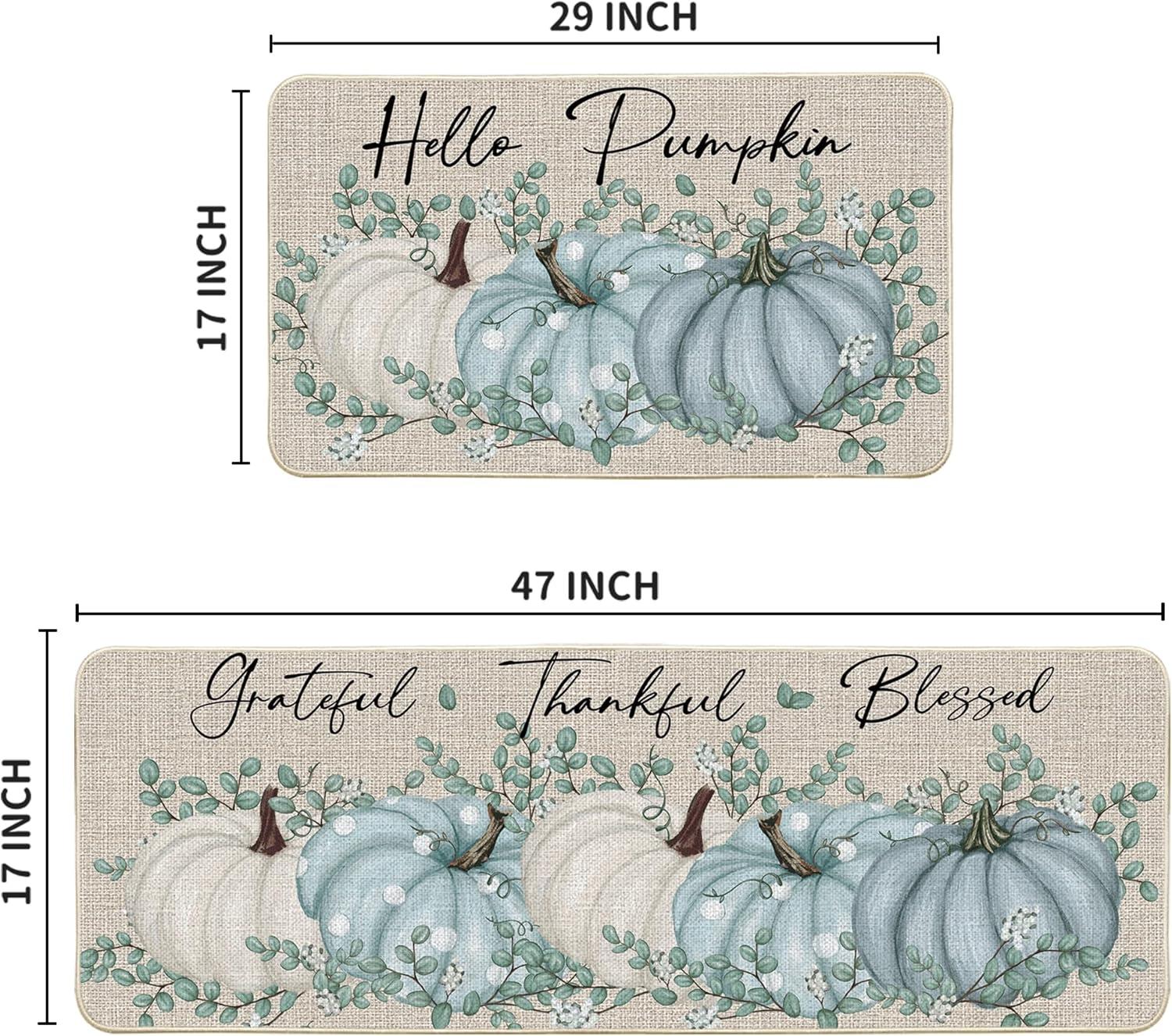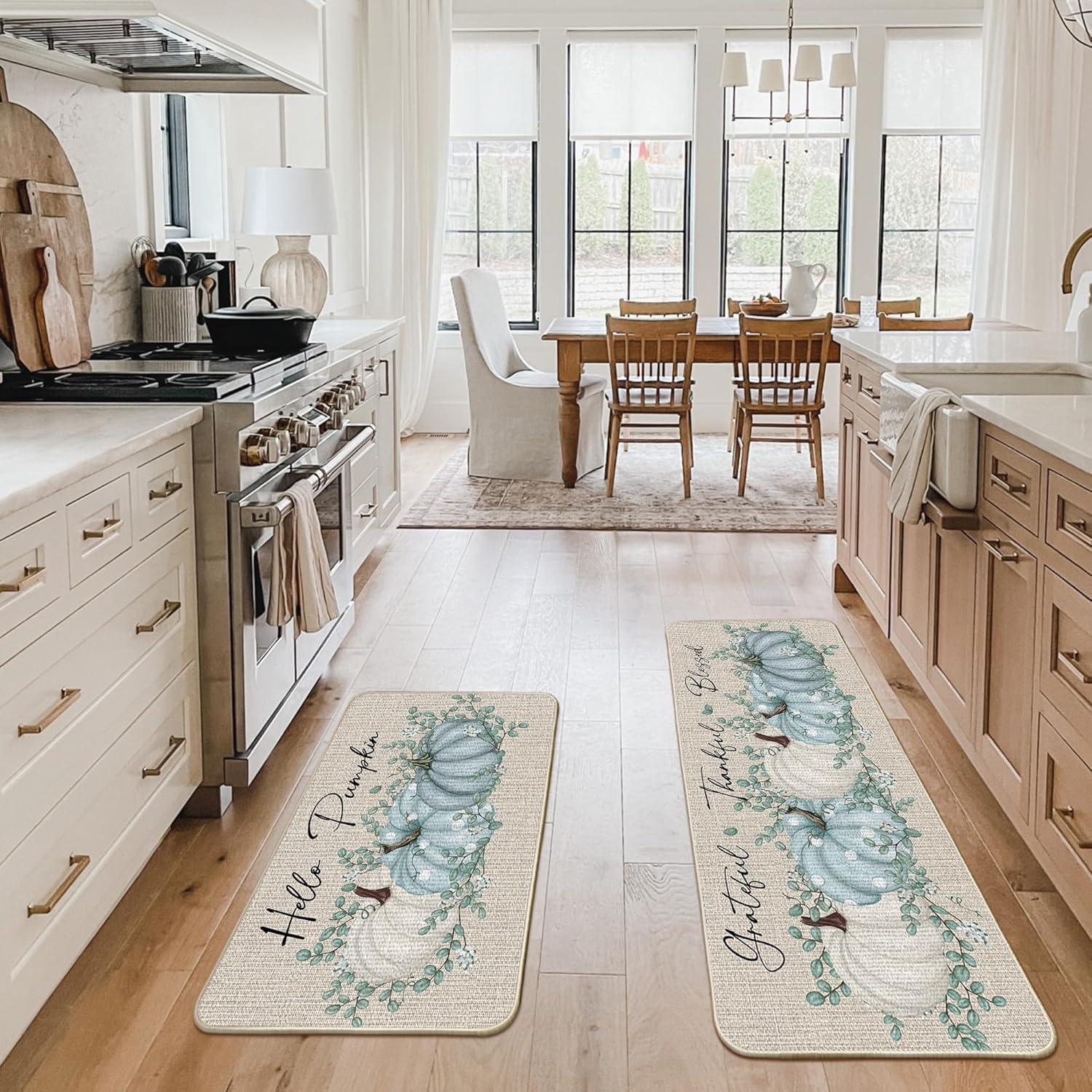 Artoid Mode Hello Pumpkin Eucalyptus Fall Kitchen Mats Set of 2, Thanksgiving Home Decor Low-Profile Kitchen Rugs for Floor – 17×29 and 17×47 Inch(Blue)