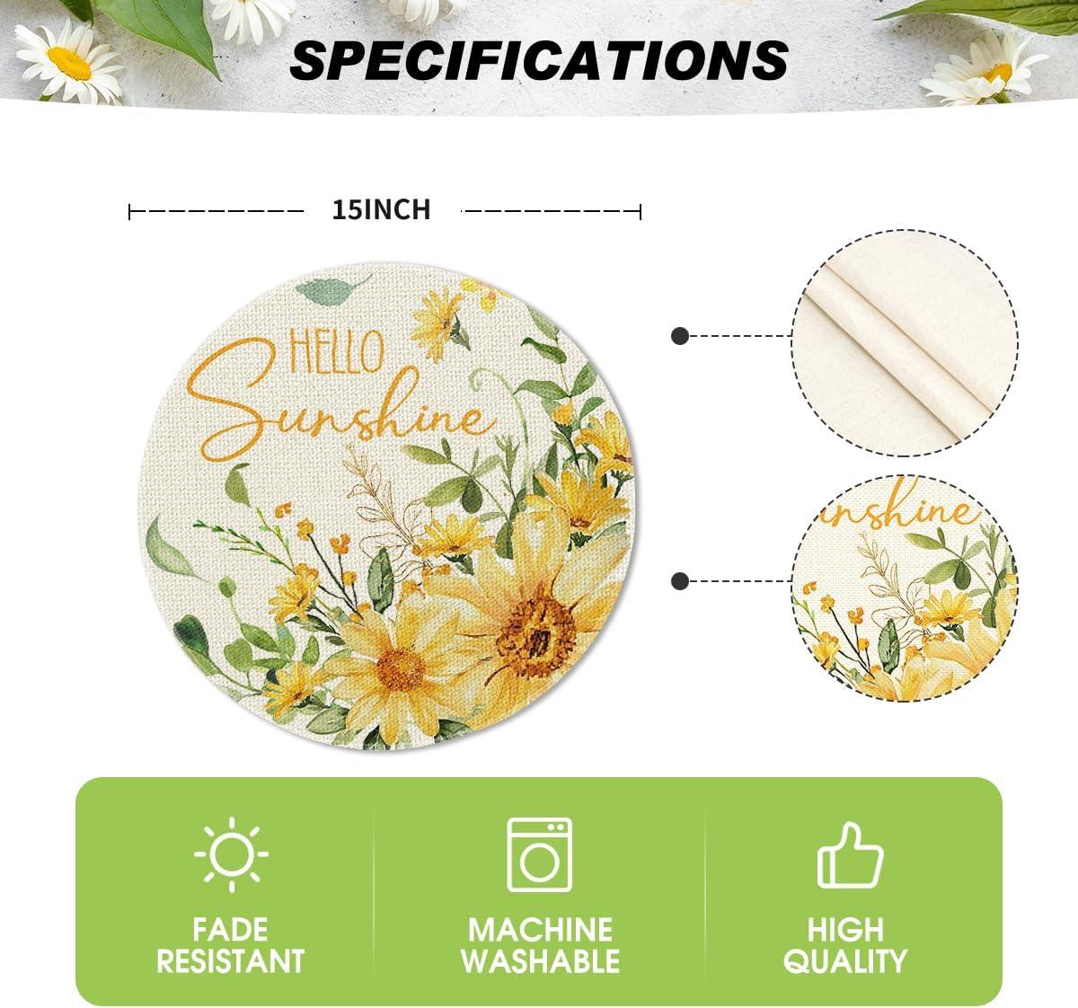 Artoid Mode Hello Sunshine Sunflower Round Summer Placemats Set of 4, 14 Inch Spring Round Table Mats for Dining Decoration(Beige)