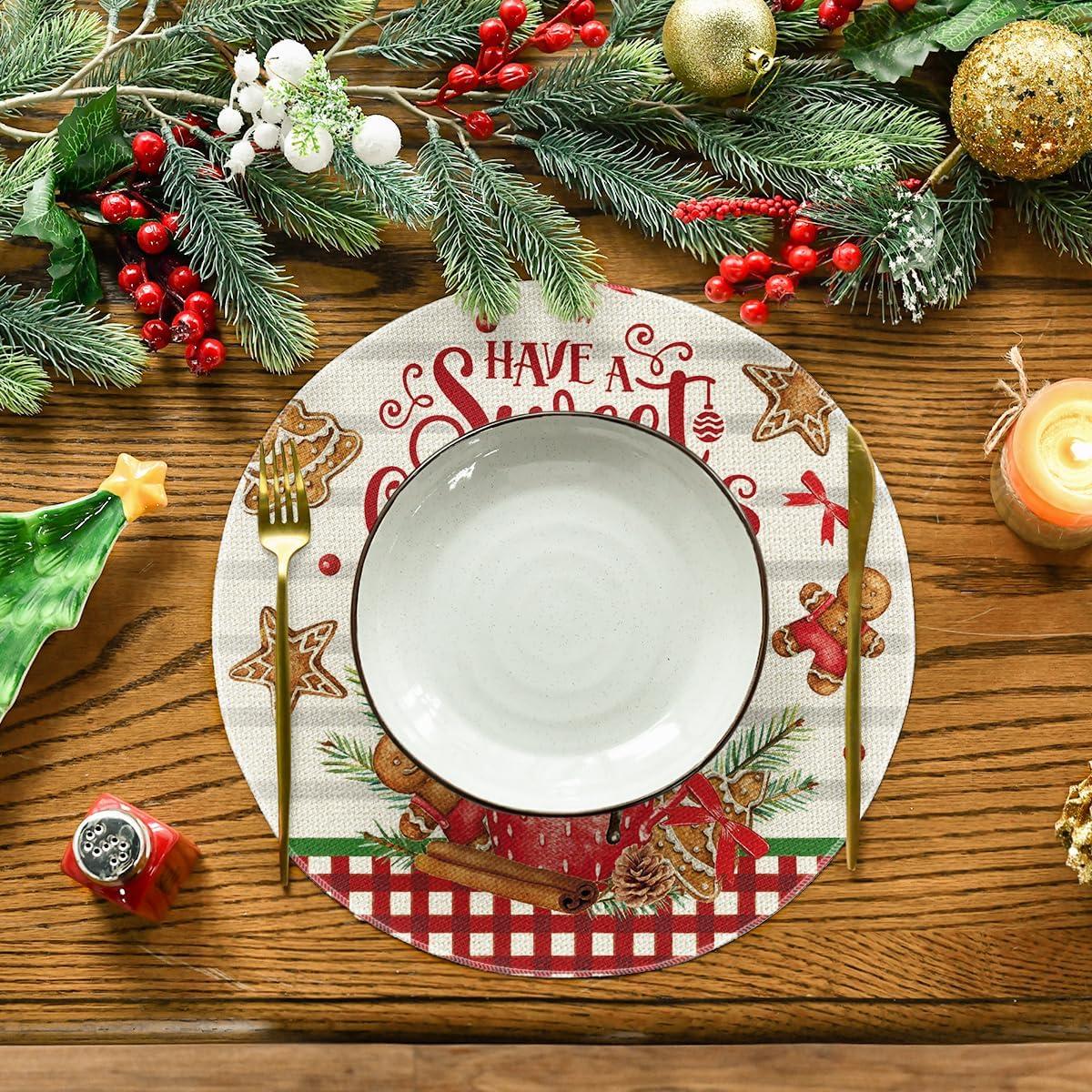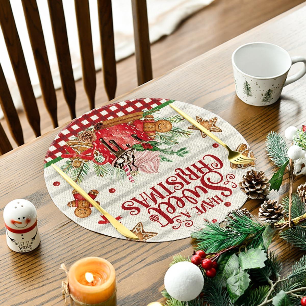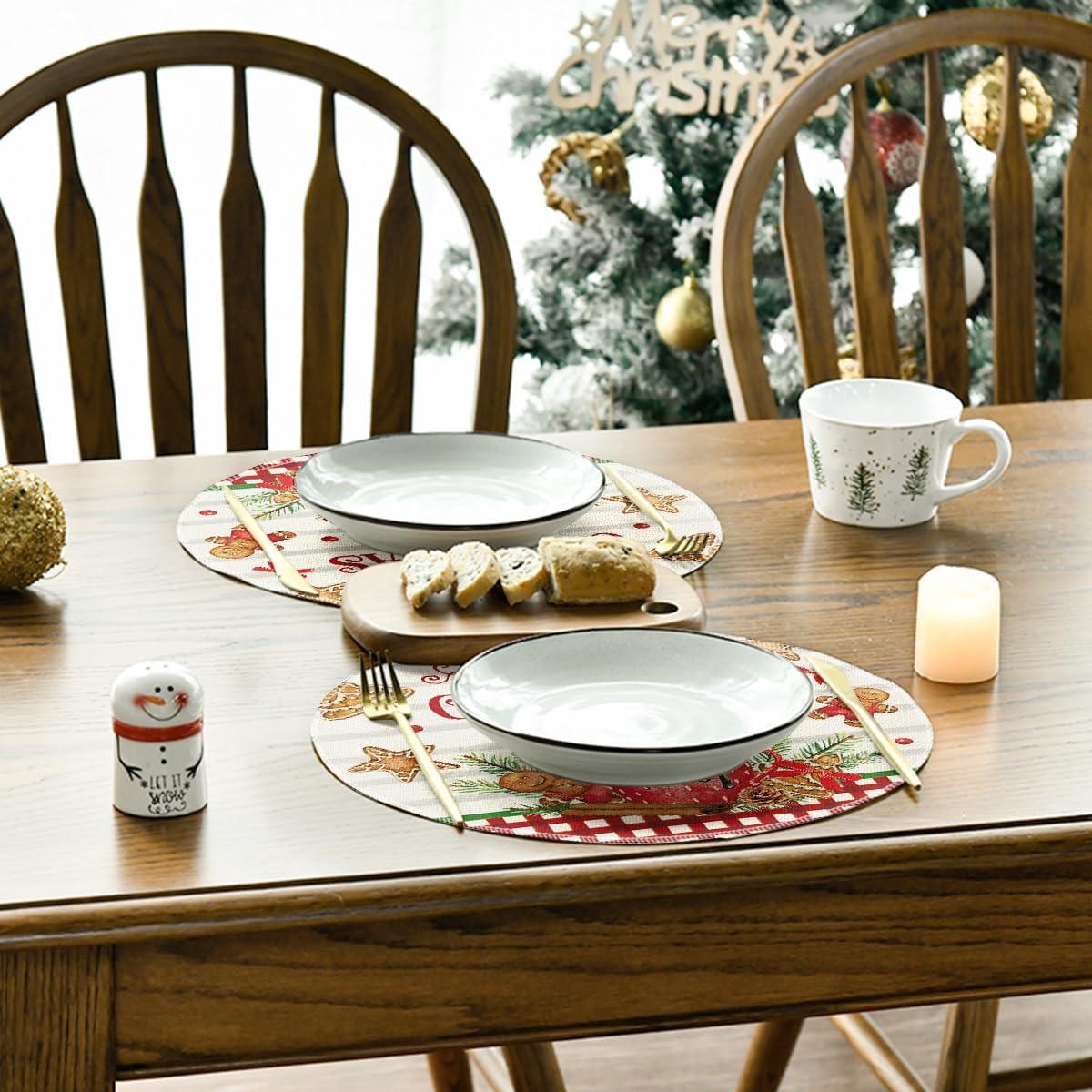 Artoid Mode Holly Gingerbread Ice Cream Merry Christmas Round Placemats Set of 4, 14 Inch Winter Round Table Mats for Dining Decoration(Beige)