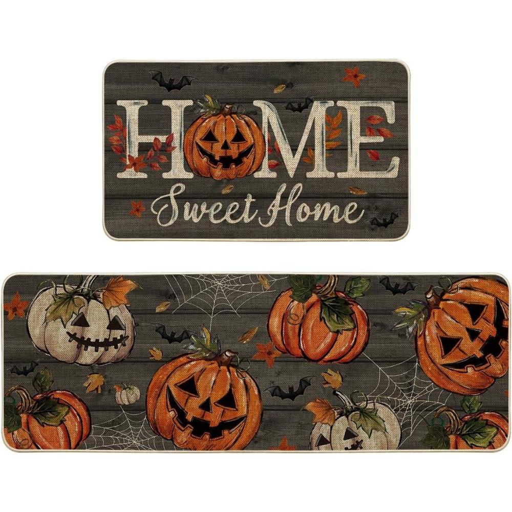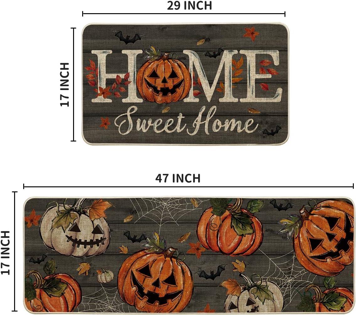 Artoid Mode Home Sweet Jack-O’-Lantern Pumpkin Halloween Kitchen Mats Set of 2, Low-Profile Decor Kitchen Rugs for Floor – 17×29 and 17×47 Inch(Black)