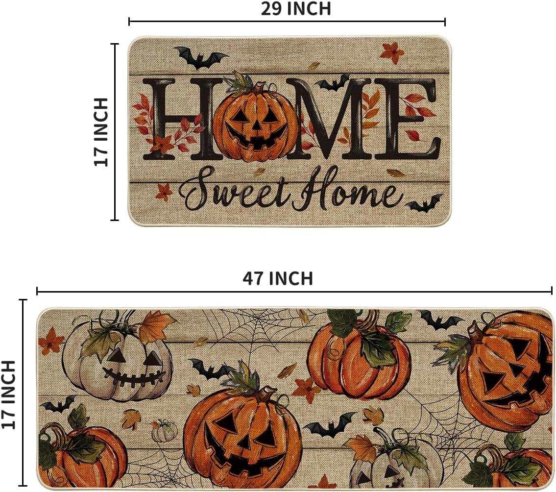 Artoid Mode Home Sweet Jack-O’-Lantern Pumpkin Halloween Kitchen Mats Set of 2, Low-Profile Decor Kitchen Rugs for Floor – 17×29 and 17×47 Inch(Brown)