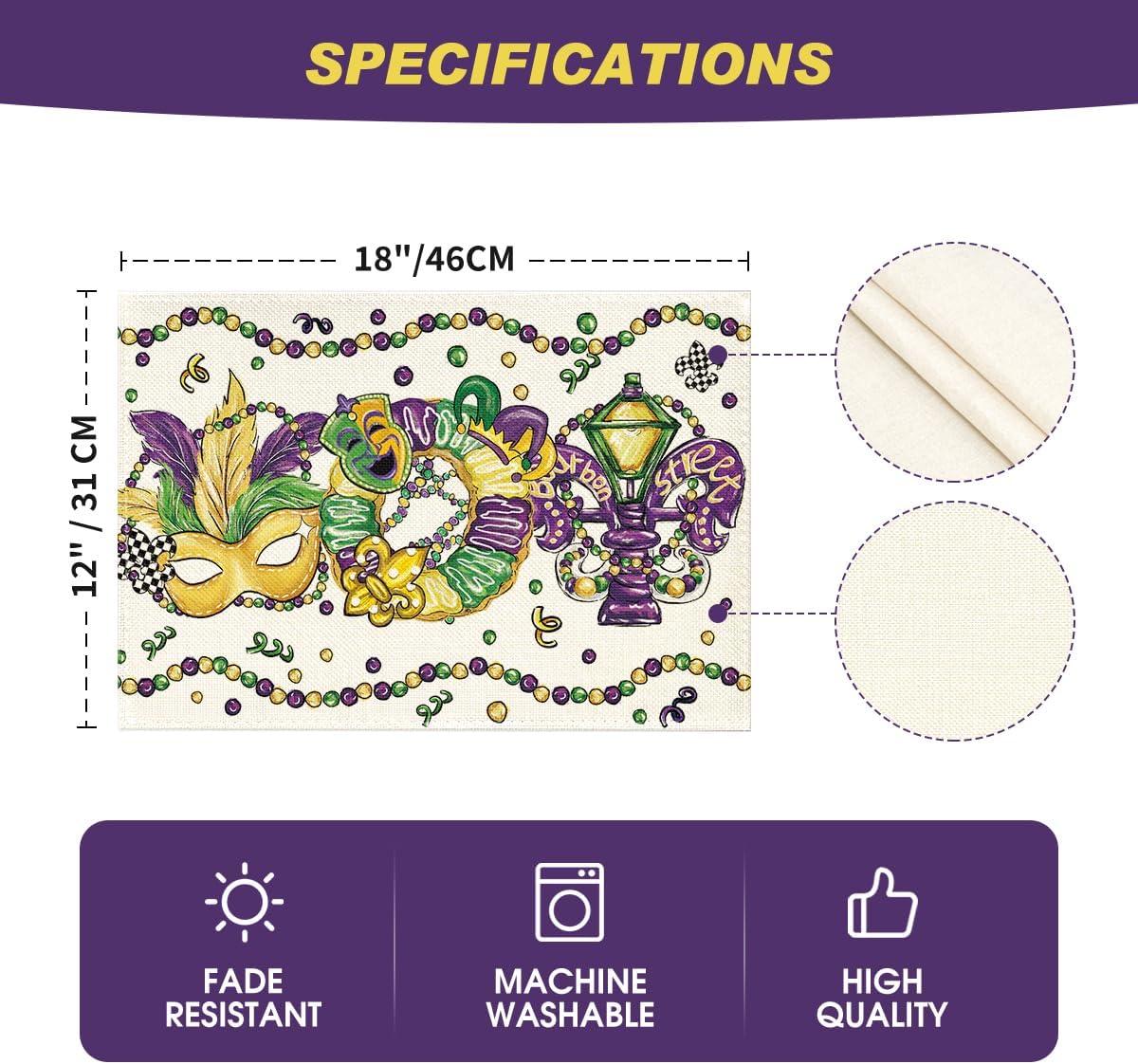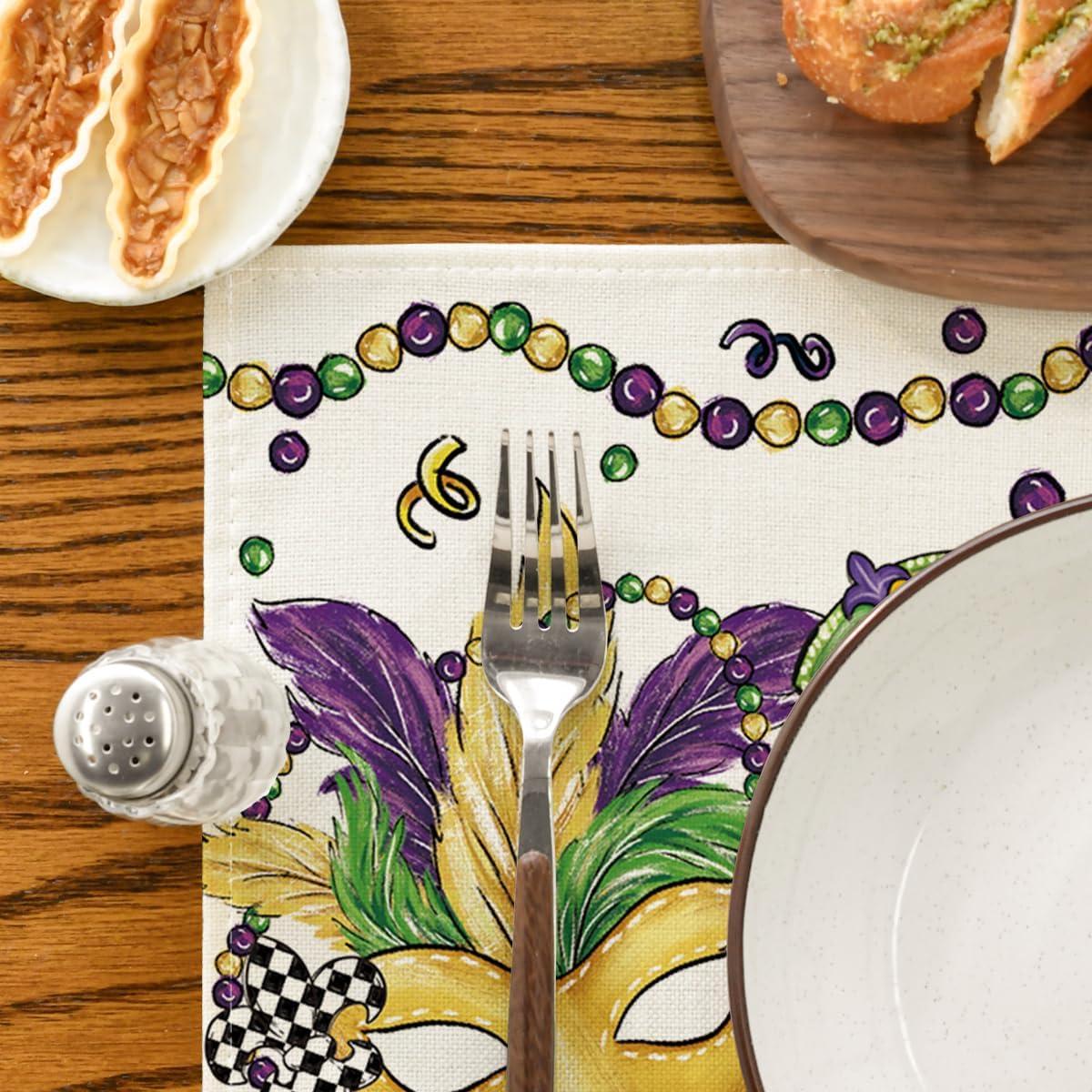 Artoid Mode Irises Beads Mask Doughnut Mardi Gras Placemats Set of 4, 12×18 Inch Seasonal Carnival Table Mats for Party Kitchen Dining Decoration