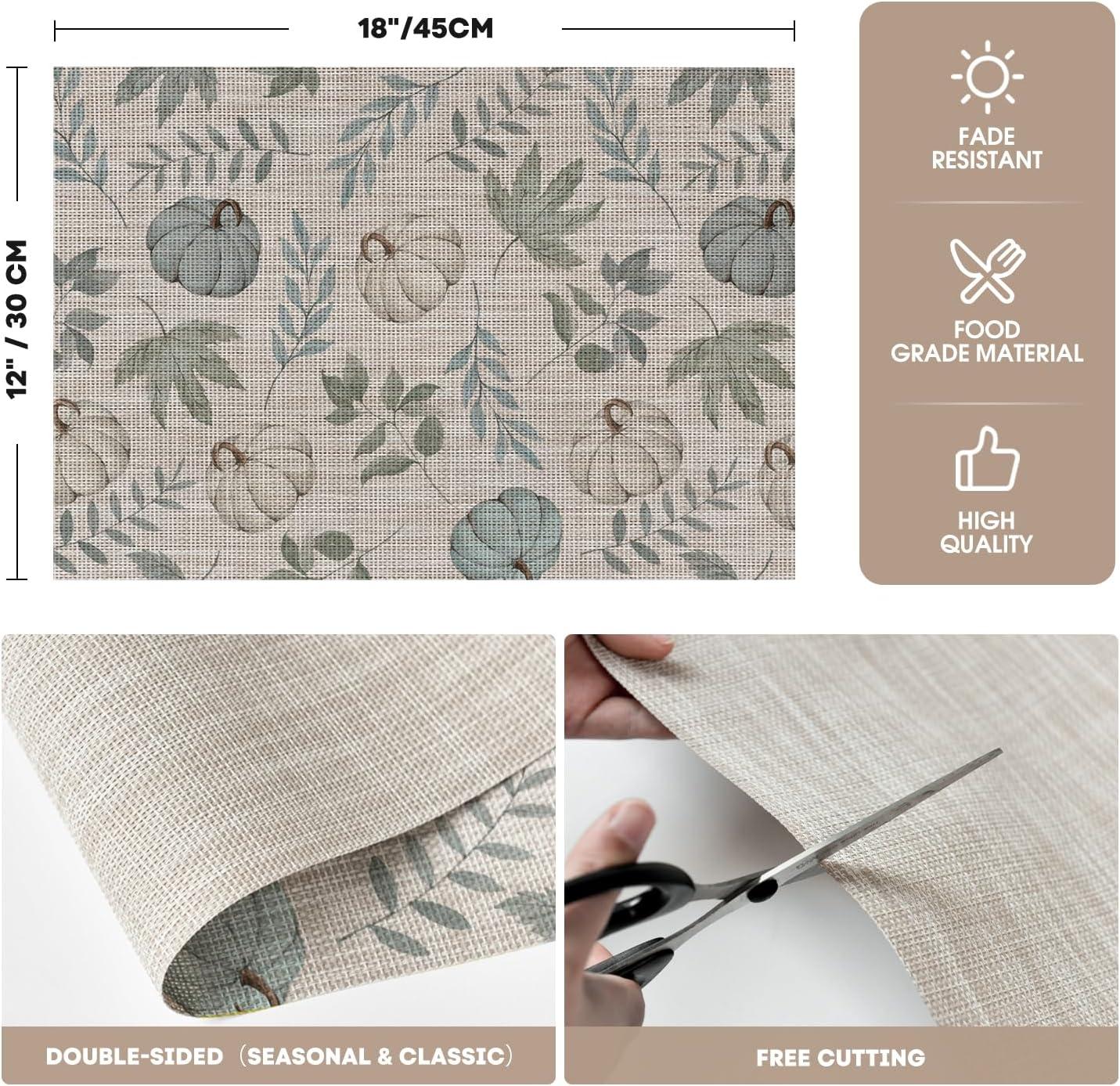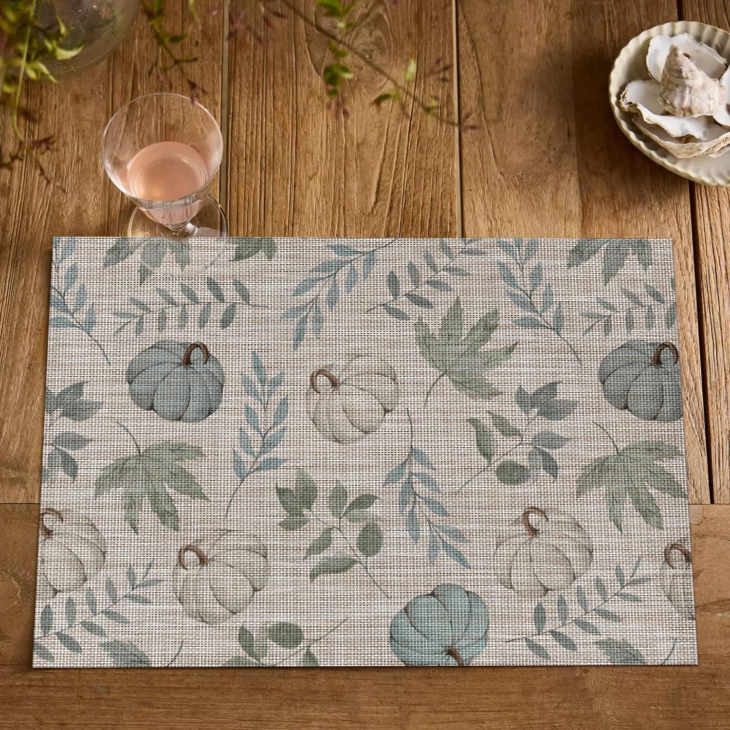 Artoid Mode Leaves Blue Pumpkin Fall Vinyl Placemats Set of 4, Wipeable Woven PVC Table Mats for Thanksgiving Holiday Party Kitchen Dining Decor(Blue)