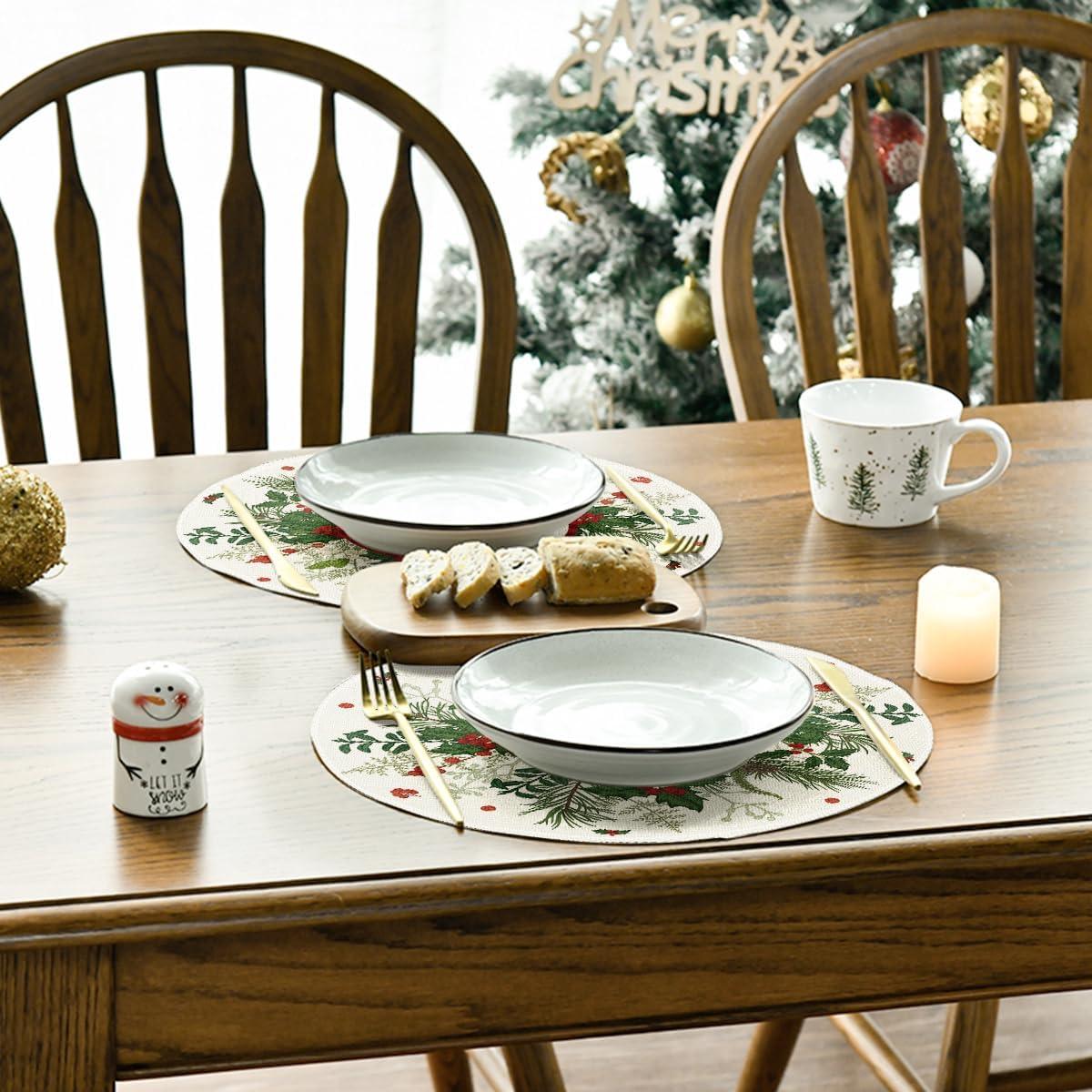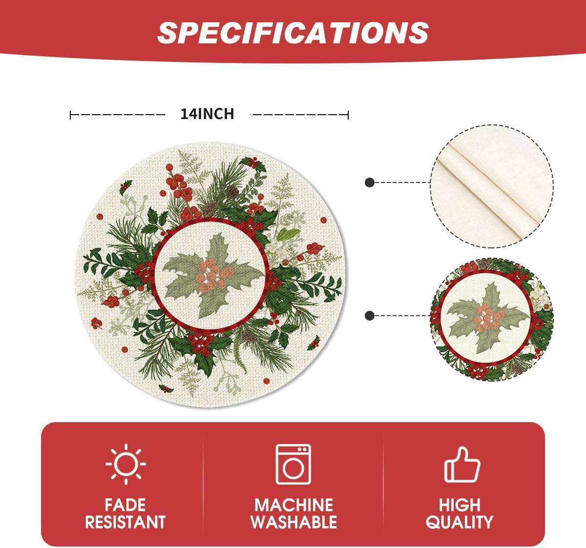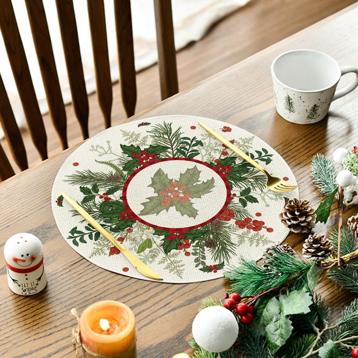 Artoid Mode Leaves Holly Round Placemats Set of 4, 14 Inch Christmas Round Table Mats for Dining Decoration(Green/Beige)