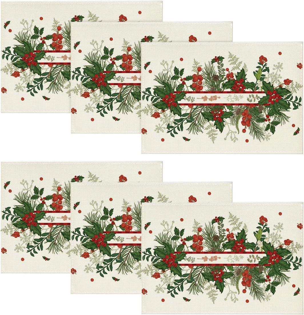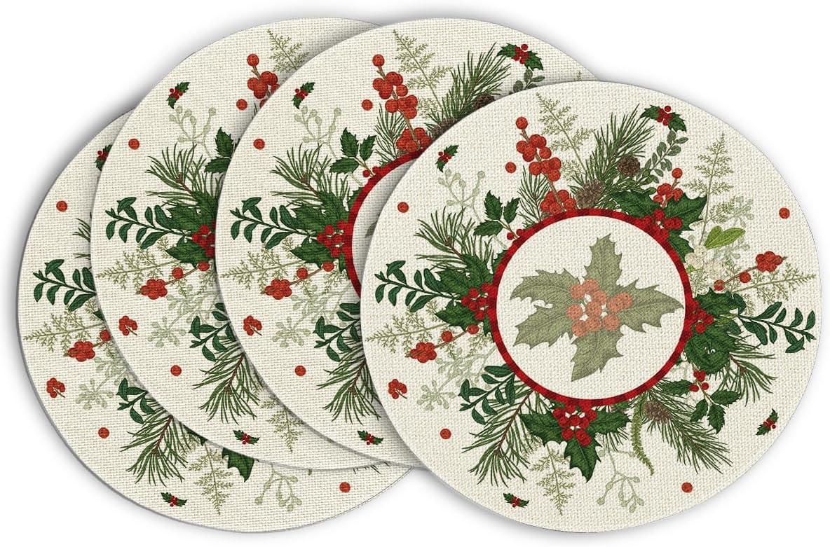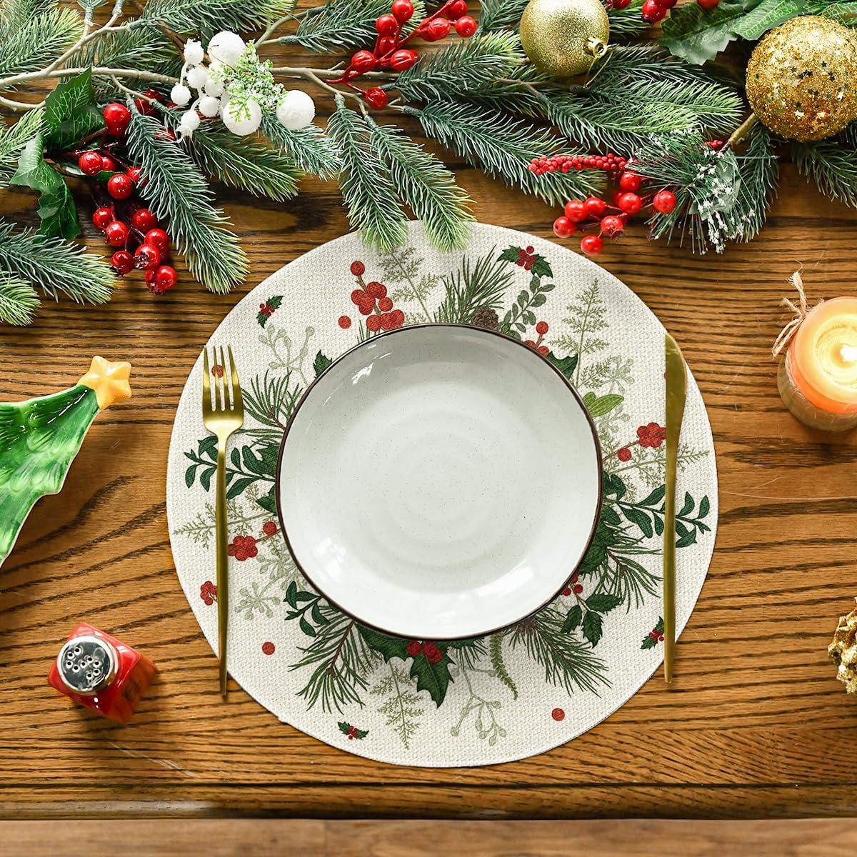 Artoid Mode Leaves Holly Round Placemats Set of 4, 14 Inch Christmas Round Table Mats for Dining Decoration(Green/Beige)