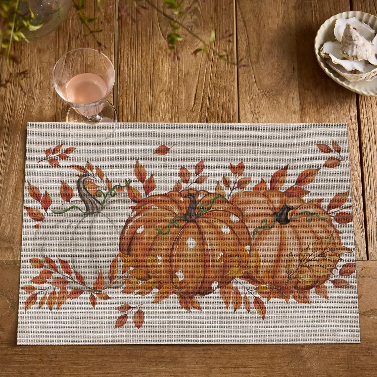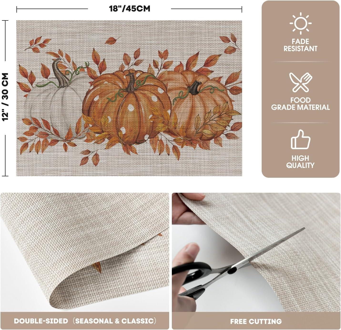 Artoid Mode Maple Leaves Pumpkins Plastic Round Fall Placemats Set of 4, 14 Inch Wipeable Woven Vinyl Table Mats for Farmhouse Party Kitchen Dining Decor(Orange)