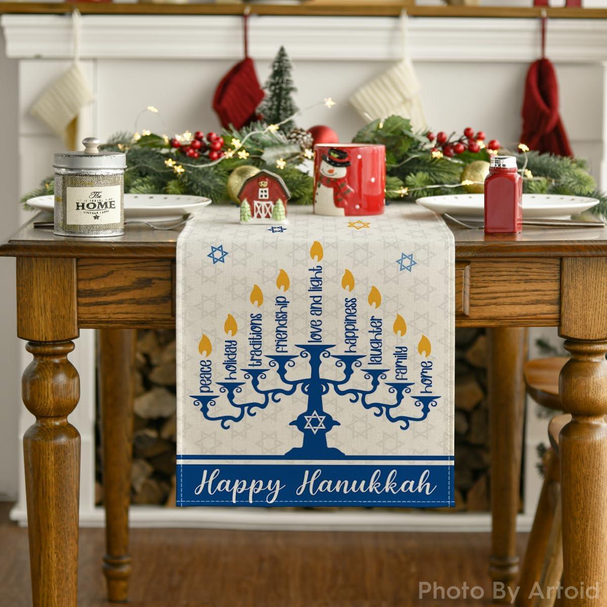 Artoid Mode Menorah Candle Hexagram Happy Hanukkah Table Runner, Peace Love and Light Chanukah Kitchen Dining Table Decoration for Home Party Decor 13×72 Inch