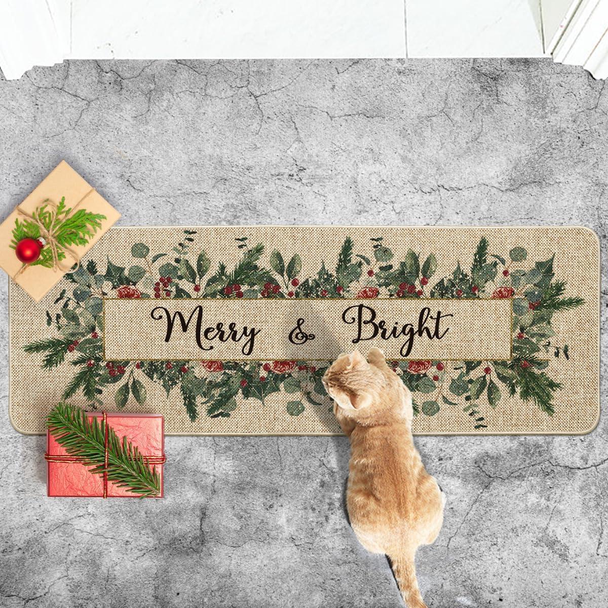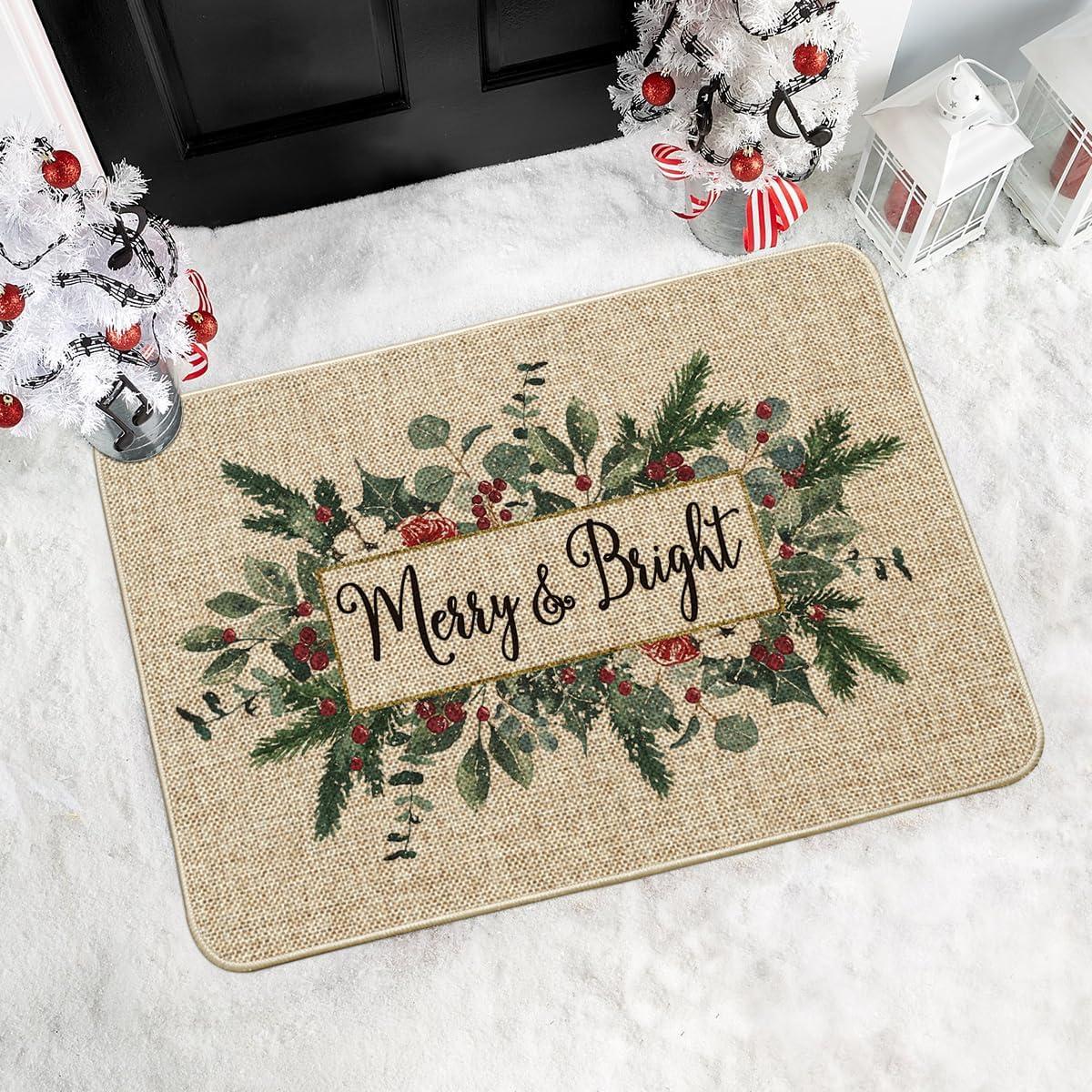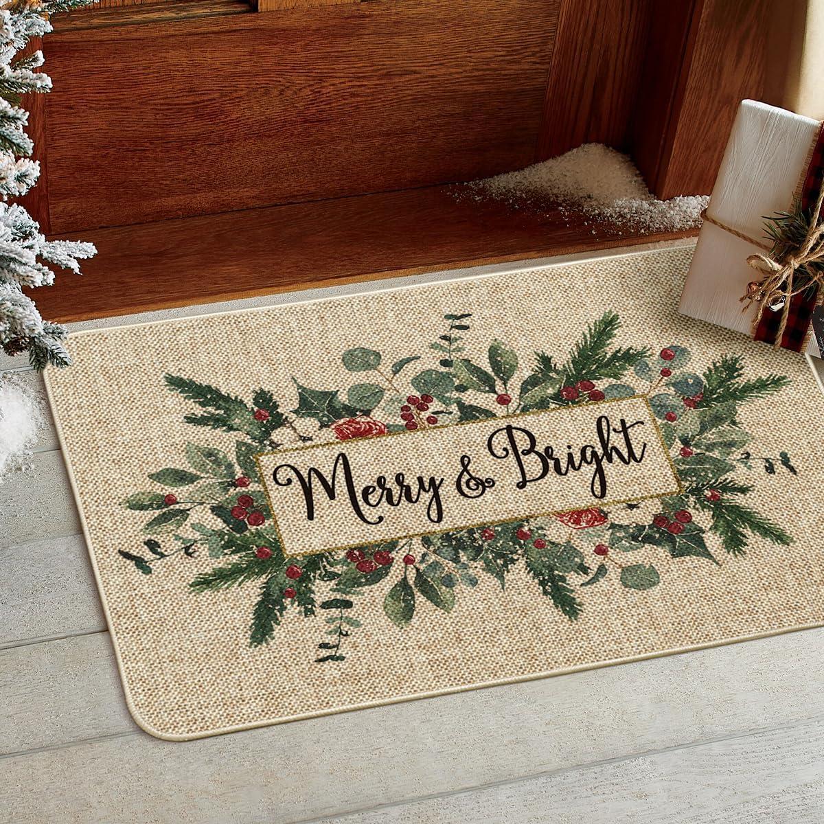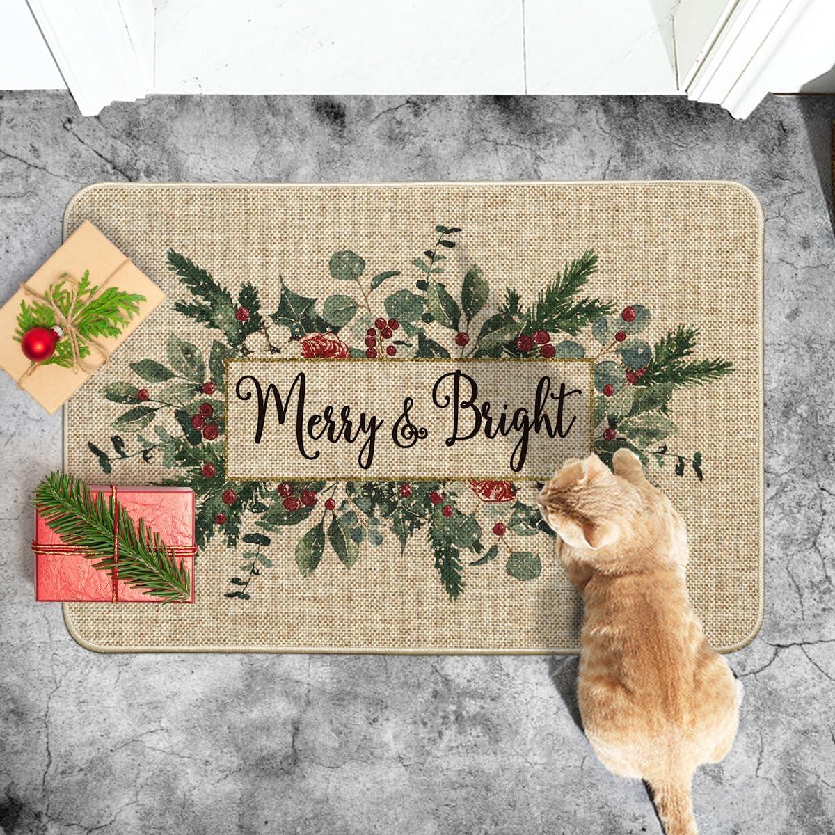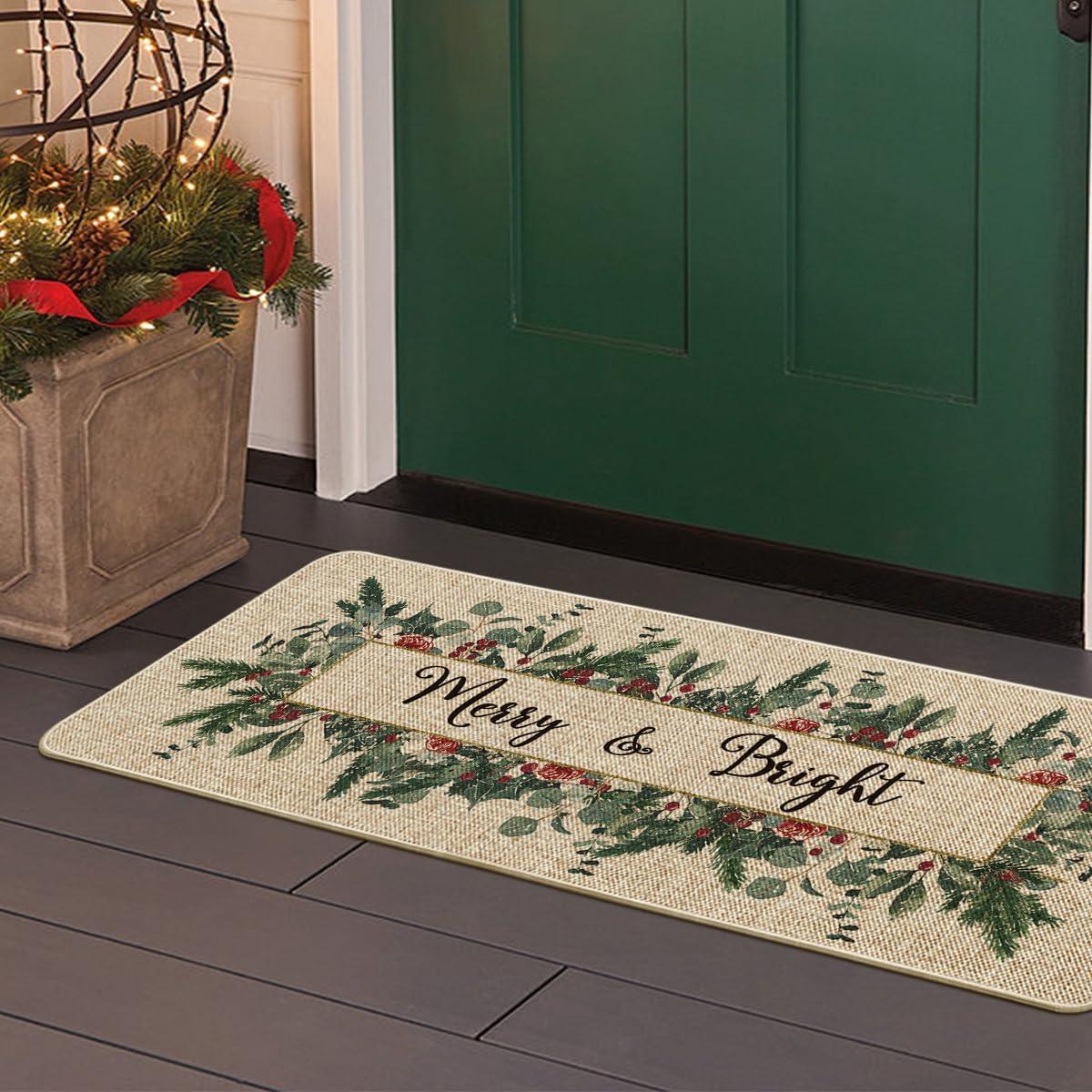 Artoid Mode Merry&Bright Eucalyptus Leaves Holly Christmas Doormat, Winter Xmas Home Decor Low-Profile Switch Rug Door Mat Floor Mat for Indoor Outdoor 17×29 Inch(Beige)