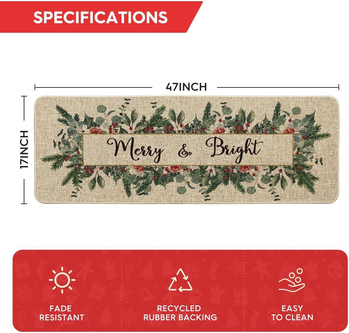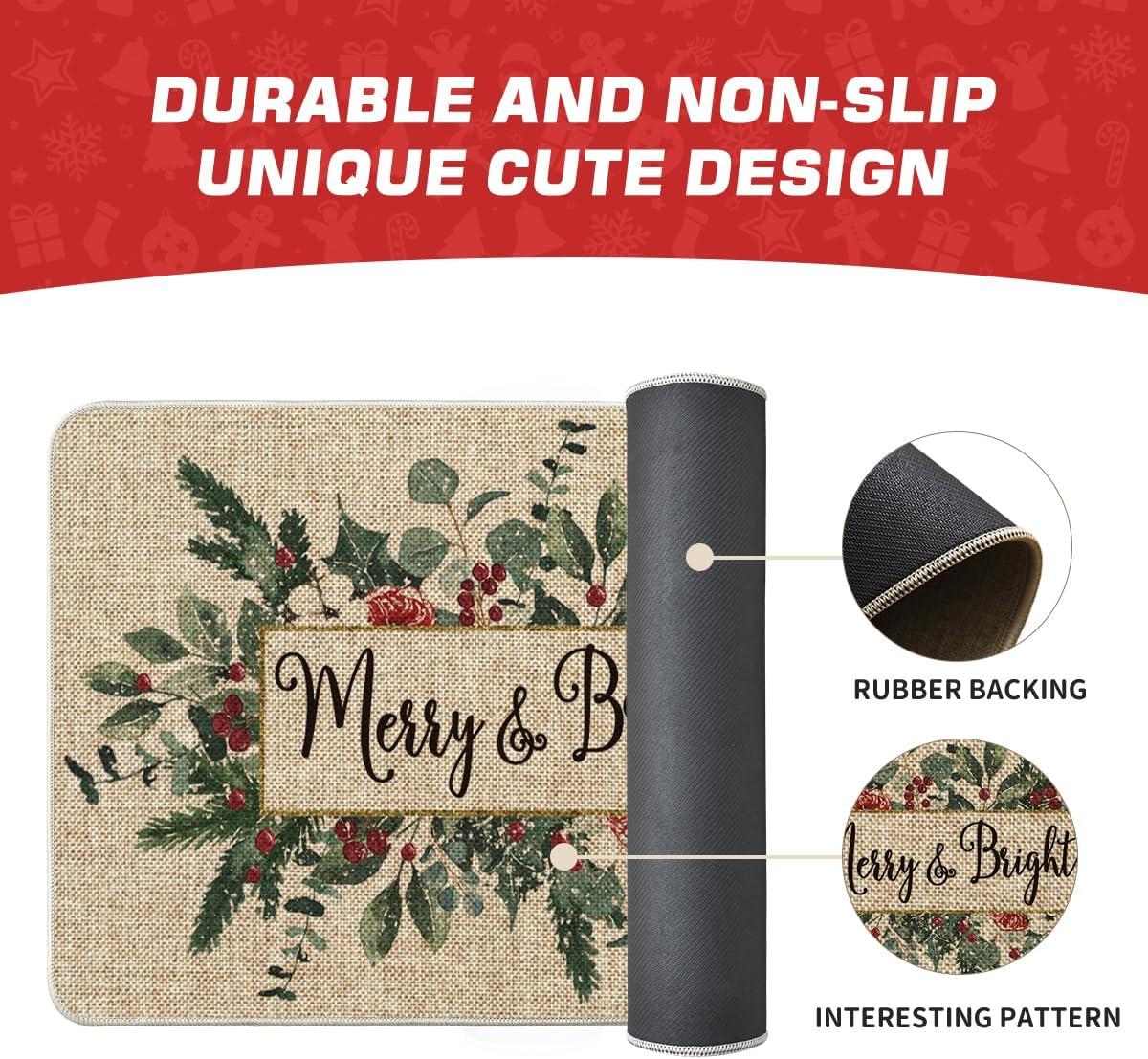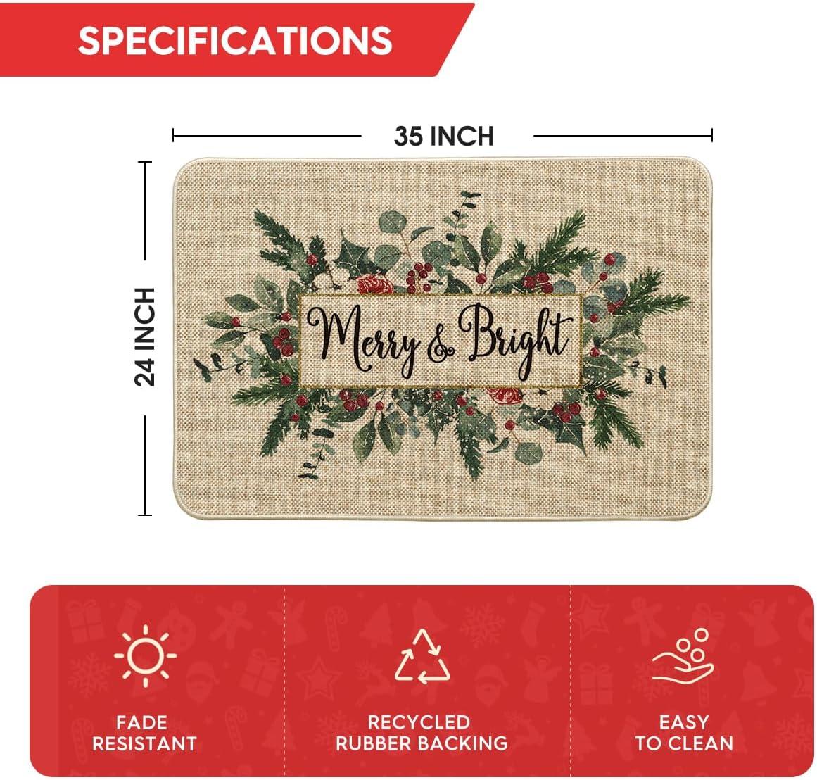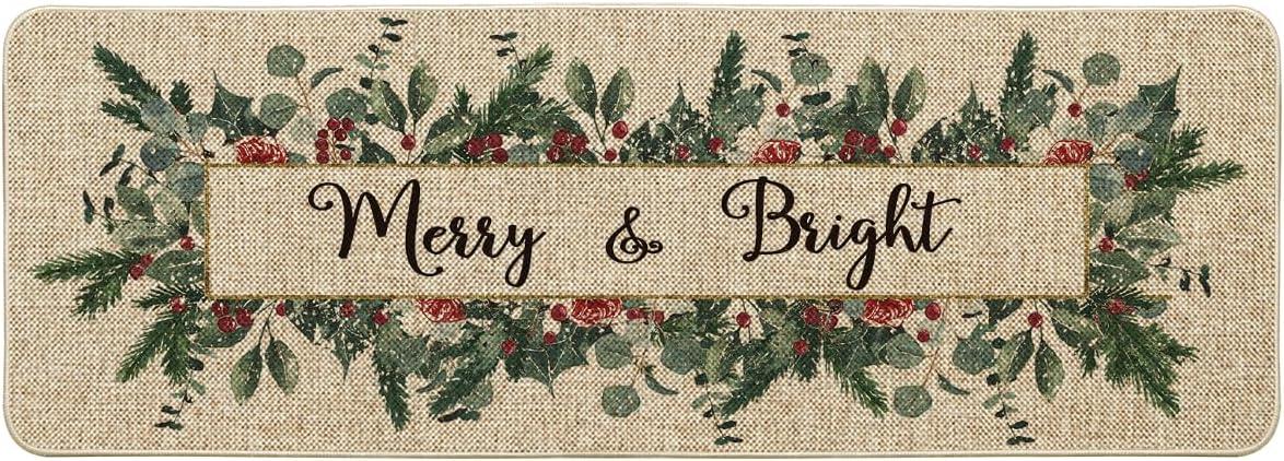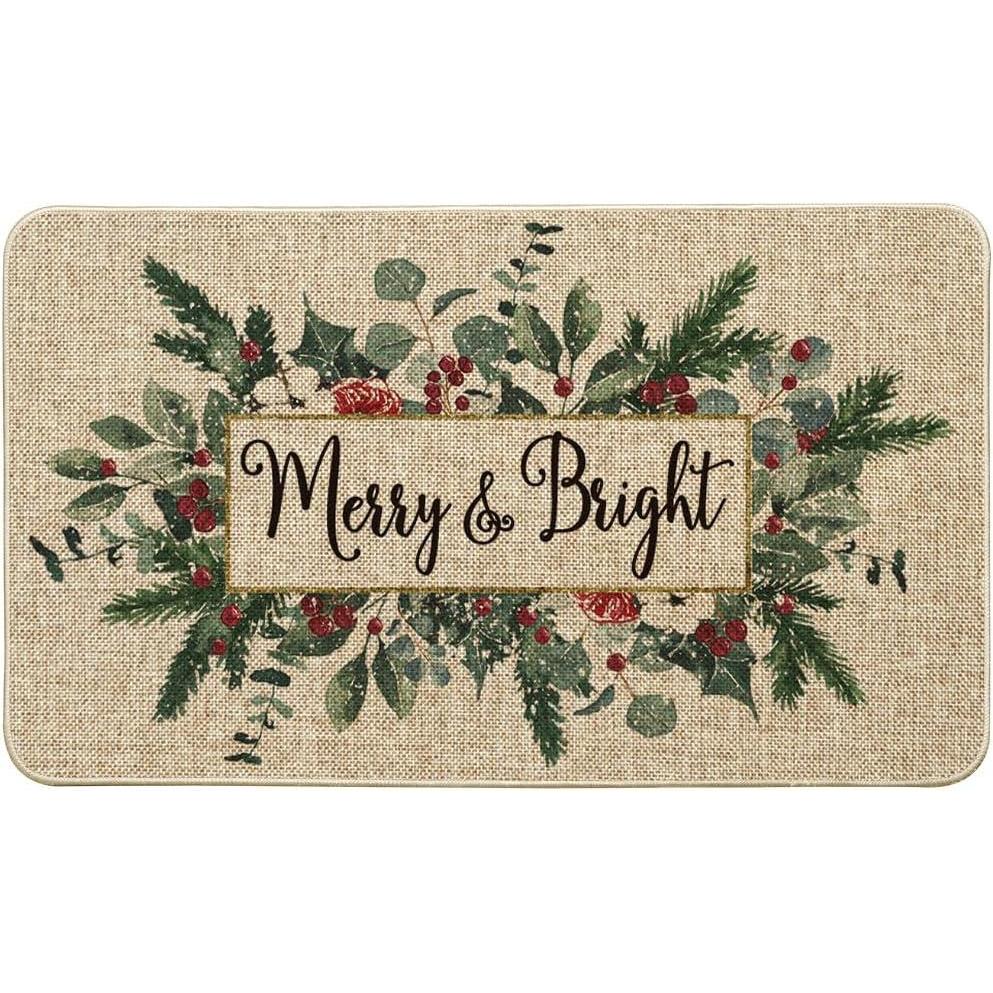 Artoid Mode Merry&Bright Eucalyptus Leaves Holly Christmas Doormat, Winter Xmas Home Decor Low-Profile Switch Rug Door Mat Floor Mat for Indoor Outdoor 17×29 Inch(Beige)