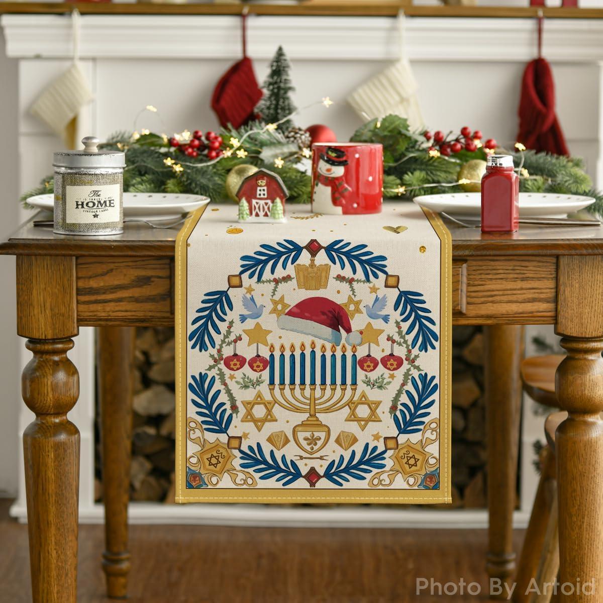 Artoid Mode Olives Menorah Stars Hanukkah Table Runner, Xmas Hat Kitchen Dining Table Decoration for Home Party Decor 13×72 Inch