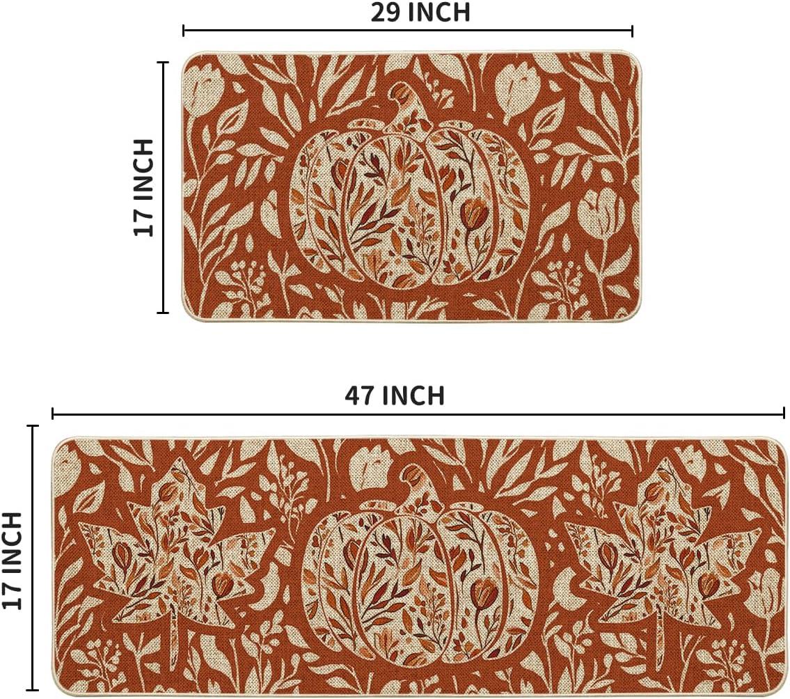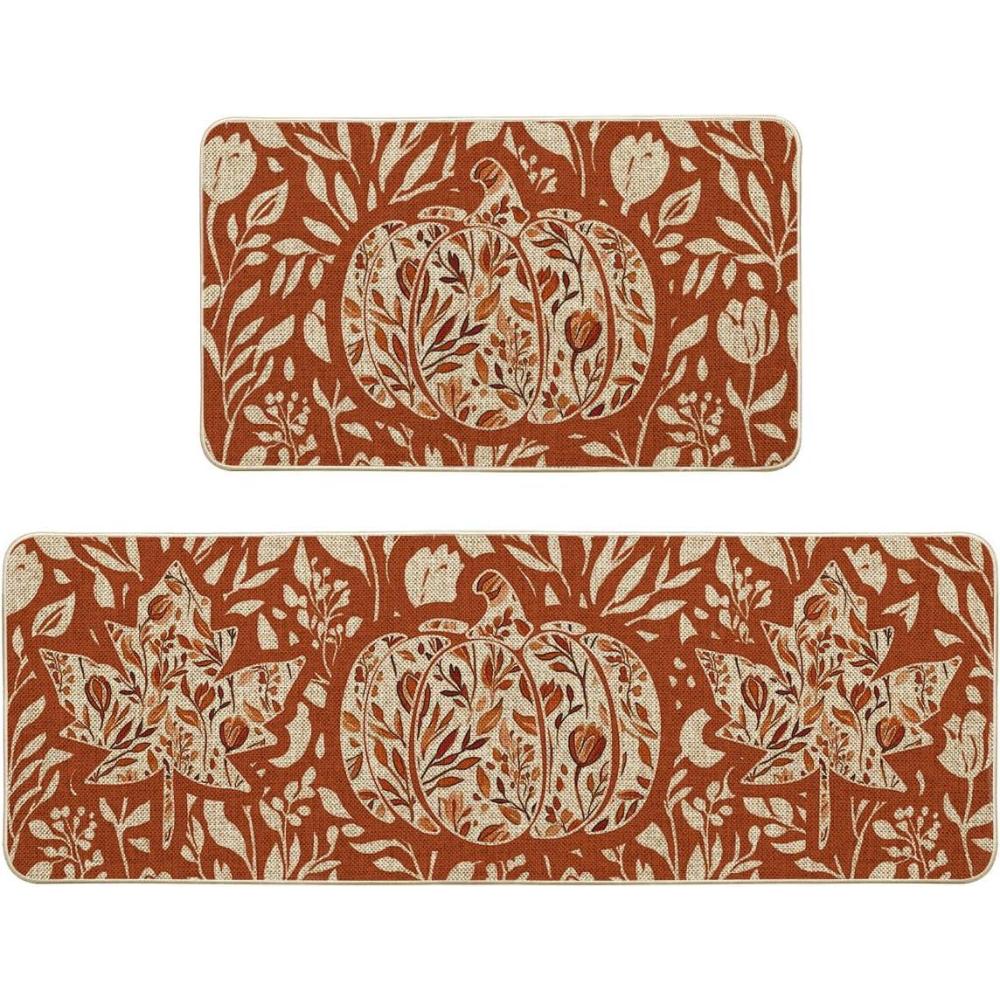 Artoid Mode Orange Flower Pumpkin Fall Kitchen Mats Set of 2, Autumn Home Decor Low-Profile Kitchen Rugs for Floor – 17×29 and 17×47 Inch(Orange)