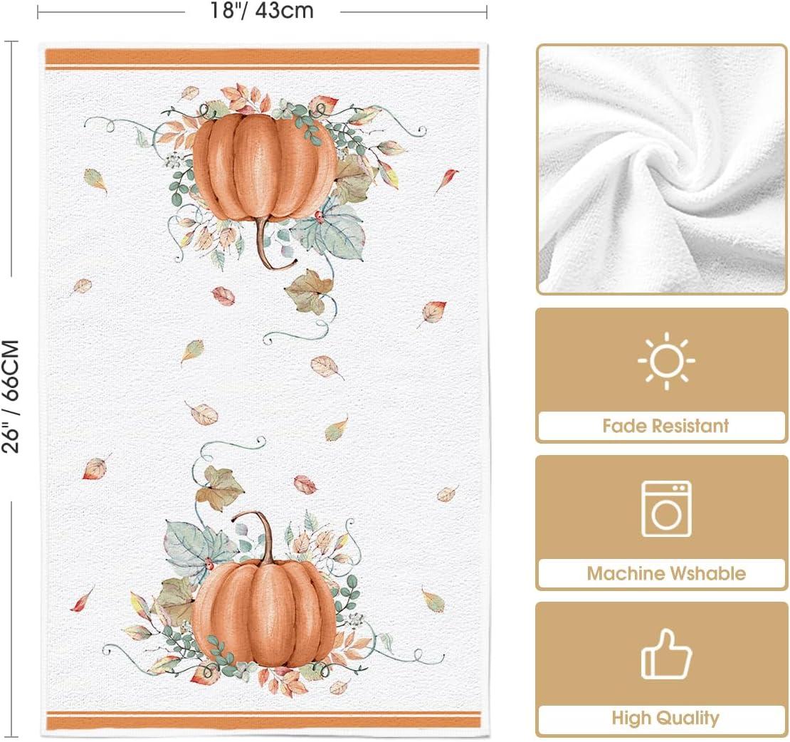 Artoid Mode Orange Hello Pumpkin Fall Kitchen Towels Dish Towels, 18×26 Inch Watercolor Stripes Leaves Decoration Hand Towels Set of 2(Orange)